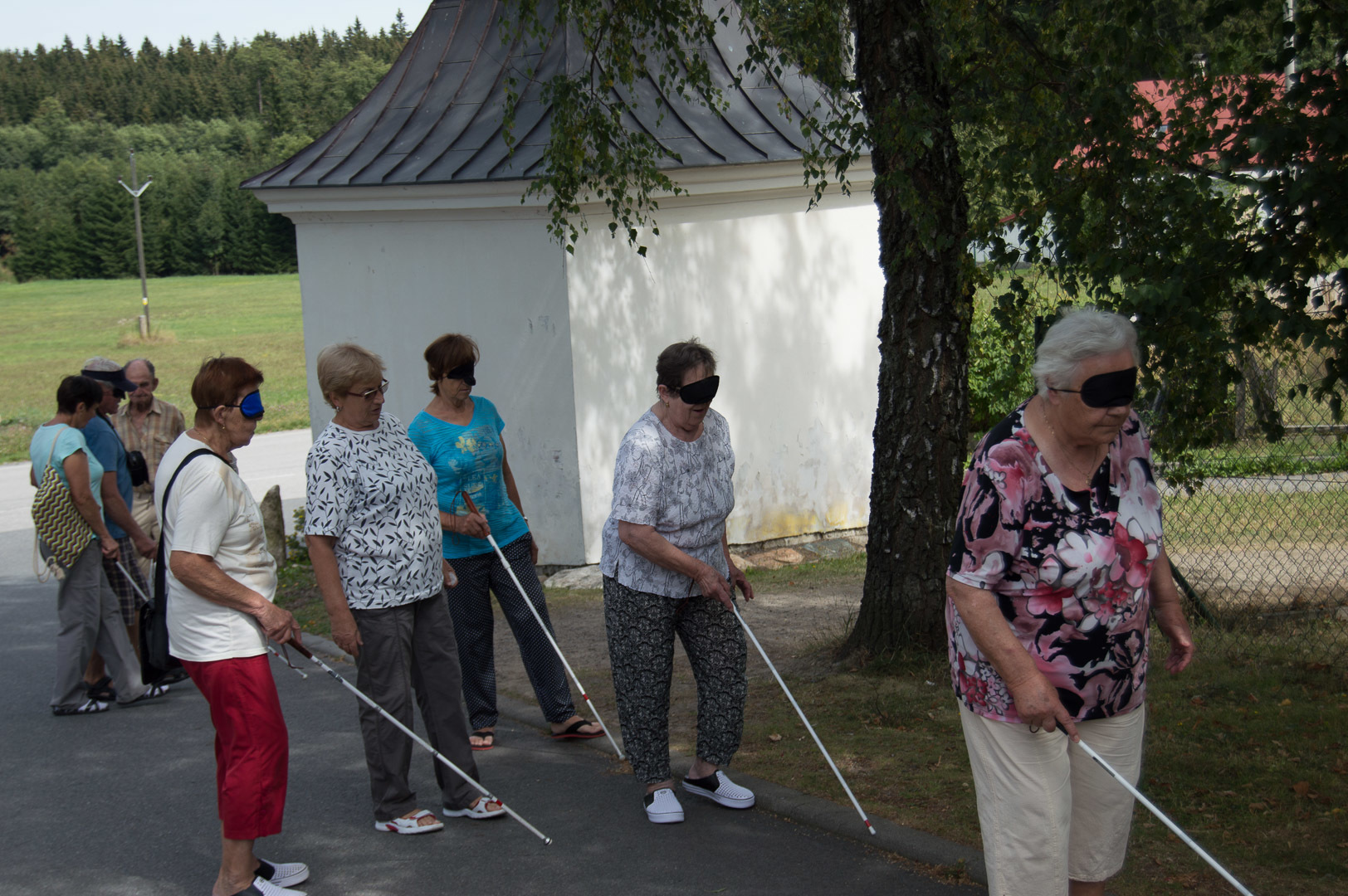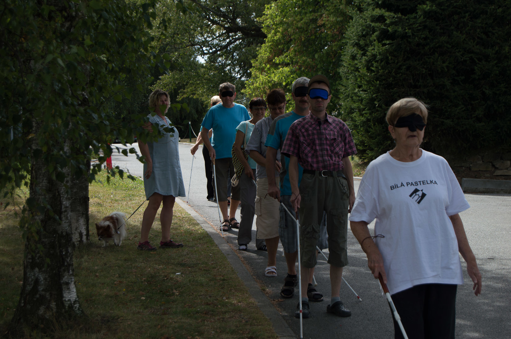 Odpoledne jsme se věnovali nácviku sebeobsluhy – Helenka nás učila správně používat bílou hůl. Všichni jsme si vyzkoušeli chůzi terénem a zvládli schody nahoru i dolů. Ale dalo nám to zabrat!!