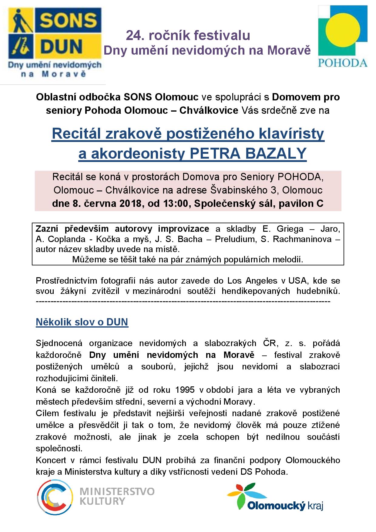 Recitál se koná v prostorách Domova pro Seniory POHODA, Olomouc – Chválkovice na adrese Švabinského 3, Olomouc