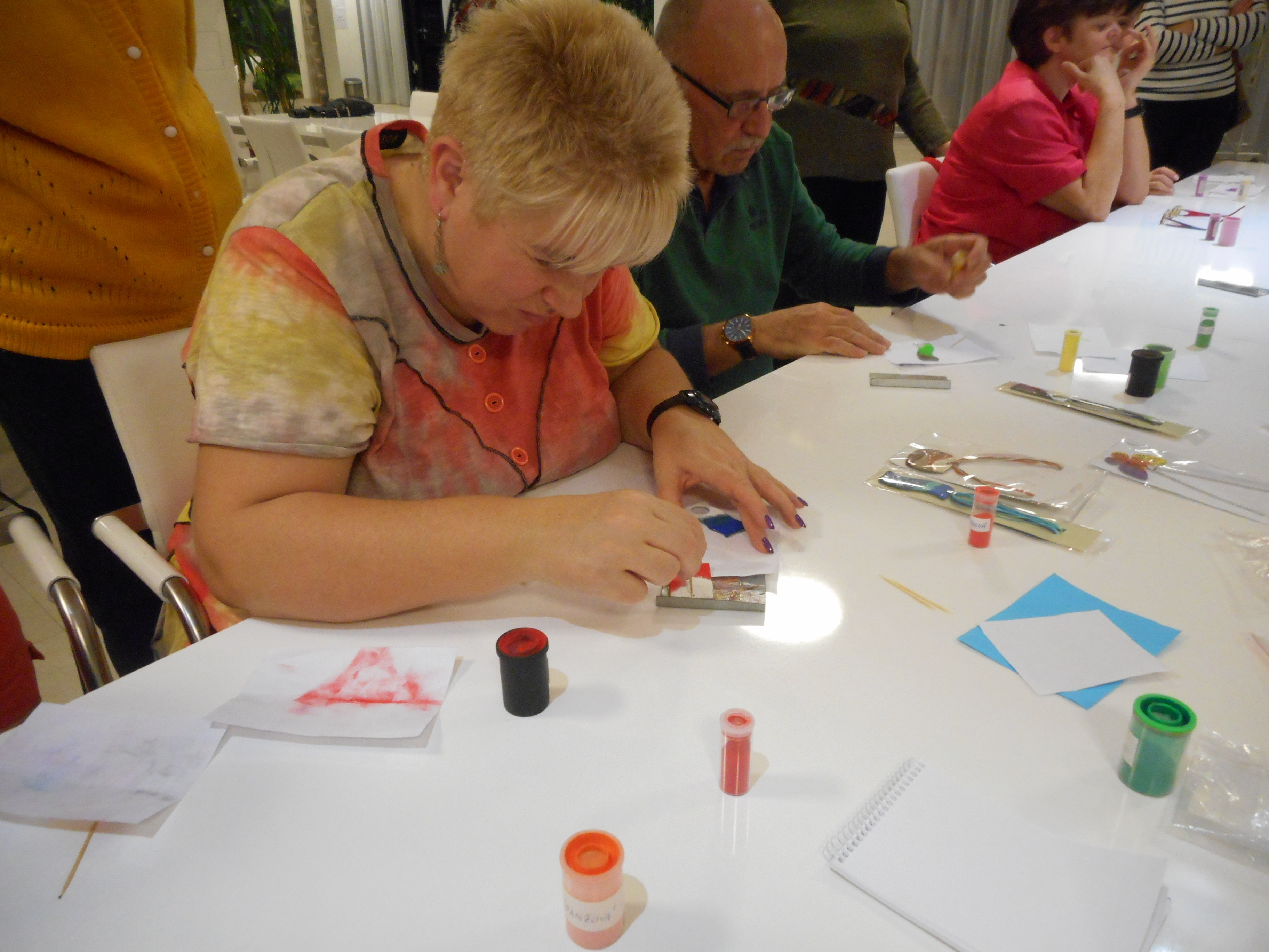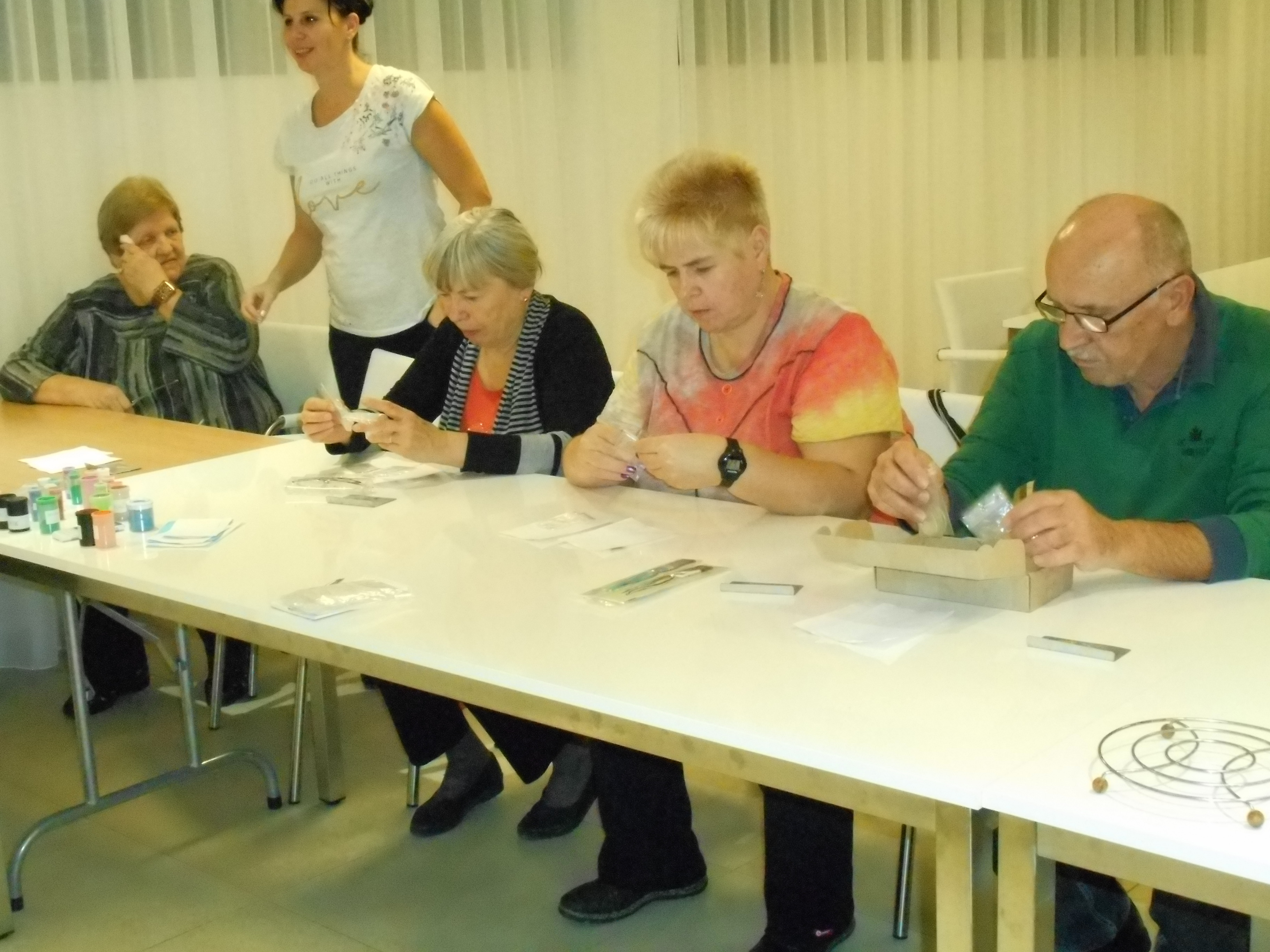 cvičili a protahovali svoje těla. Endorfíny se vyplavovaly. Součástí byla i prezentace mobilního telefonu pro těžce zrakově postižené. Zde byla výhoda, že nikdo nespěchal a zájemci si mohli vše řádně vyzkoušet. Dotazy se hrnuly. A to je dobře. Jeden blok byl zaměřen na rukodělné činnosti. My jsme vyzkoušeli „smaltování“. A myslím, že nikdo nelitoval. Touto metodou se vyráběly přívěšky. A tak si každý odnášel vlastnoručně vyrobený náhrdelník. Ti šikovní si jich odnesli i několik. Večery již tradičně patřily zpěvu. Máme mezi sebou výborného zpěváka, textaře i skladatele v jedné osobě. Toník Blažek opět nezklamal. Vše ve své režii, atmosféra neopakovatelná. Vánočně naladěni jsme opouštěli lázeňské prostory s nadějí, že za rok se sem znovu vypravíme.