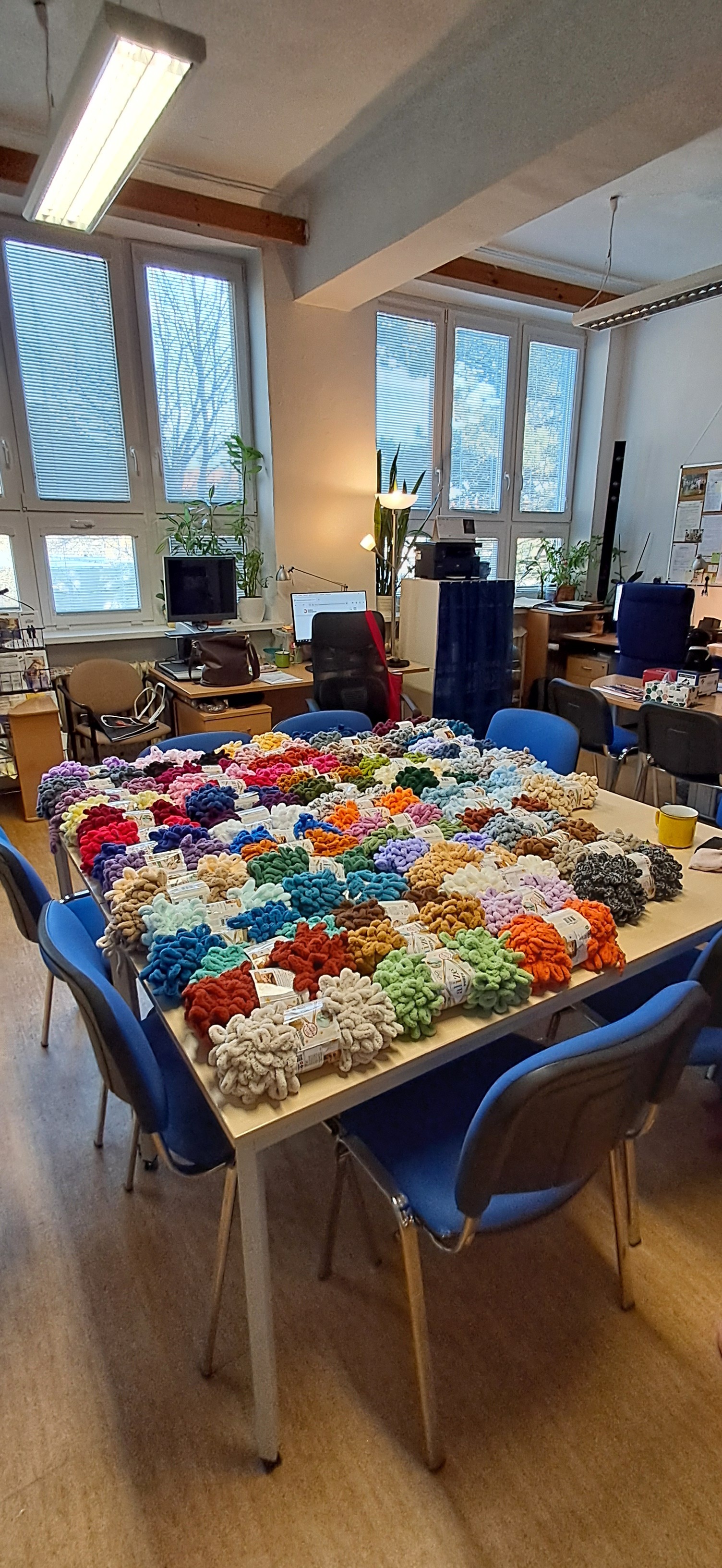 Jsme nadšené z toho, jak to všechny baví. Kolikrát se i v průběhu jiné práce zastavíme, překontrolujeme stav zásob a se slovy „hele, k čemu by se hodila tahle modrá,“ začneme plánovat další hřejivý doplněk.