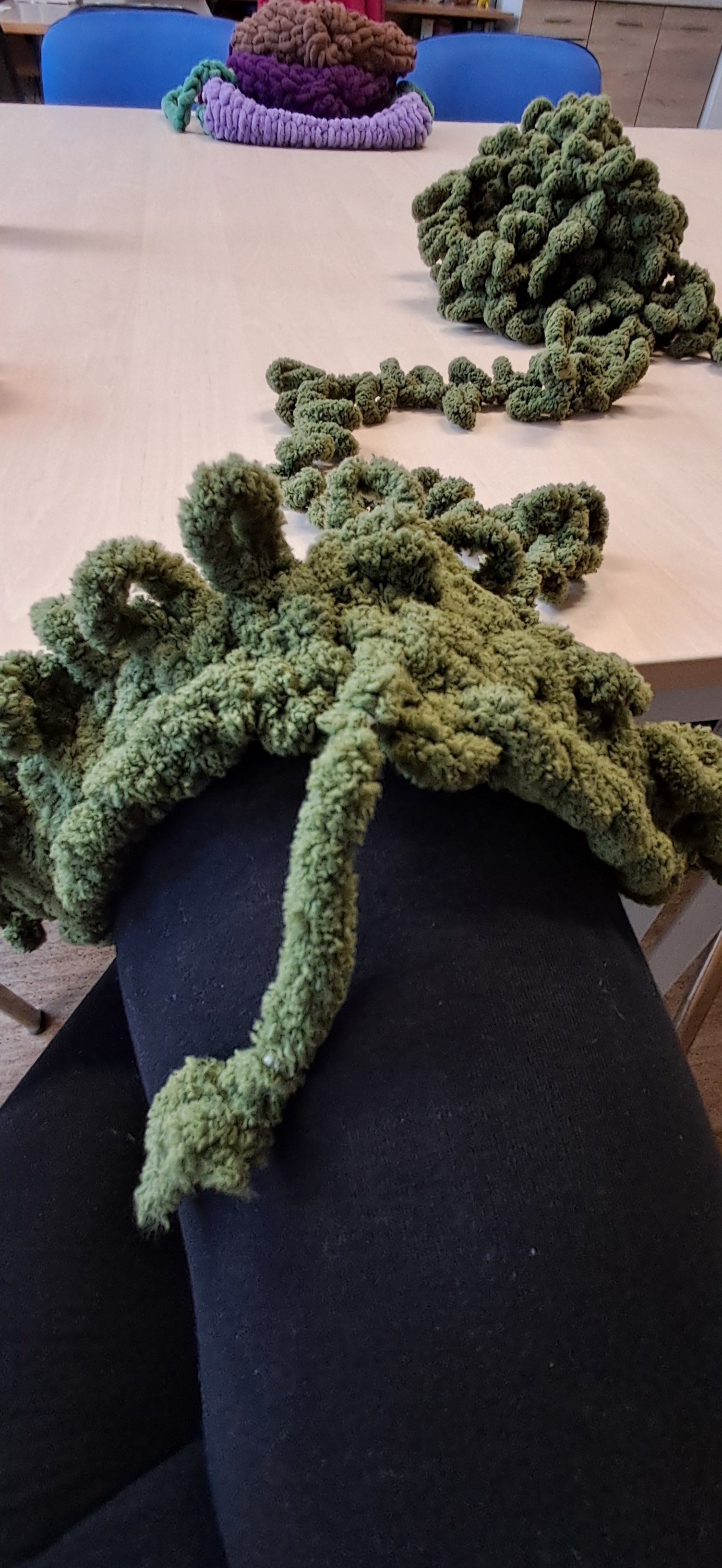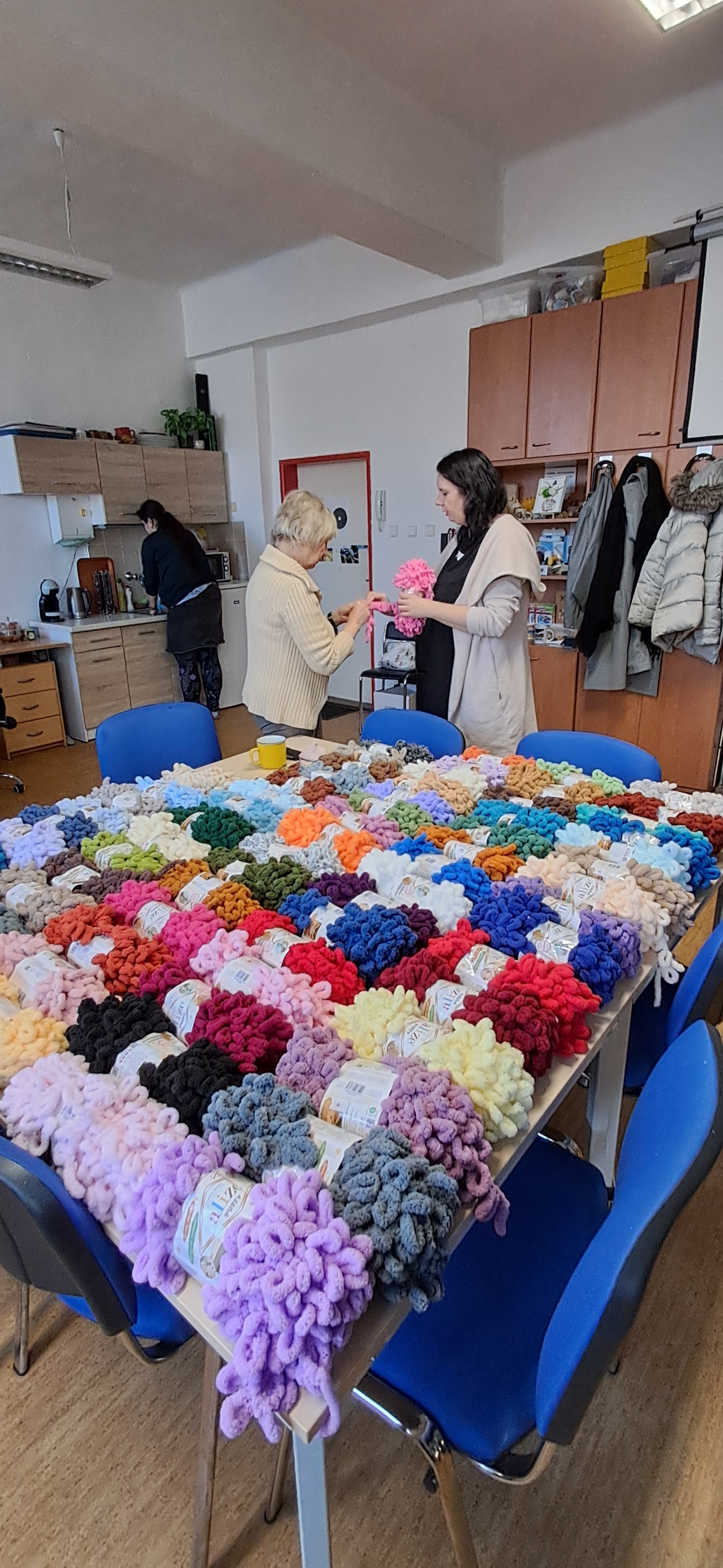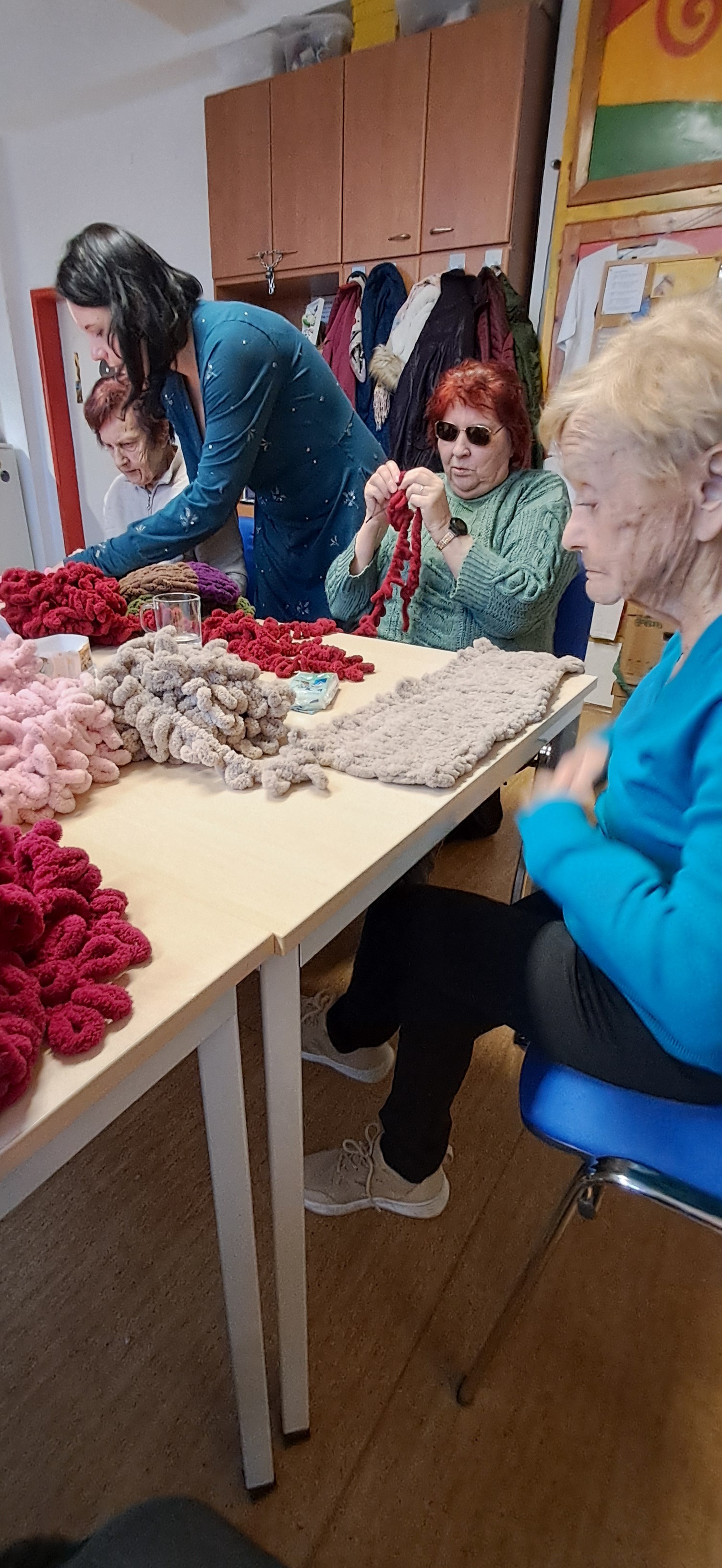 Naše členky s radostí přijdou, vyberou barvu a splétají. Jedna chtěla šálu pro vnučku. Jedna něco jako psí obleček, jiná čepici, nebo tašku.