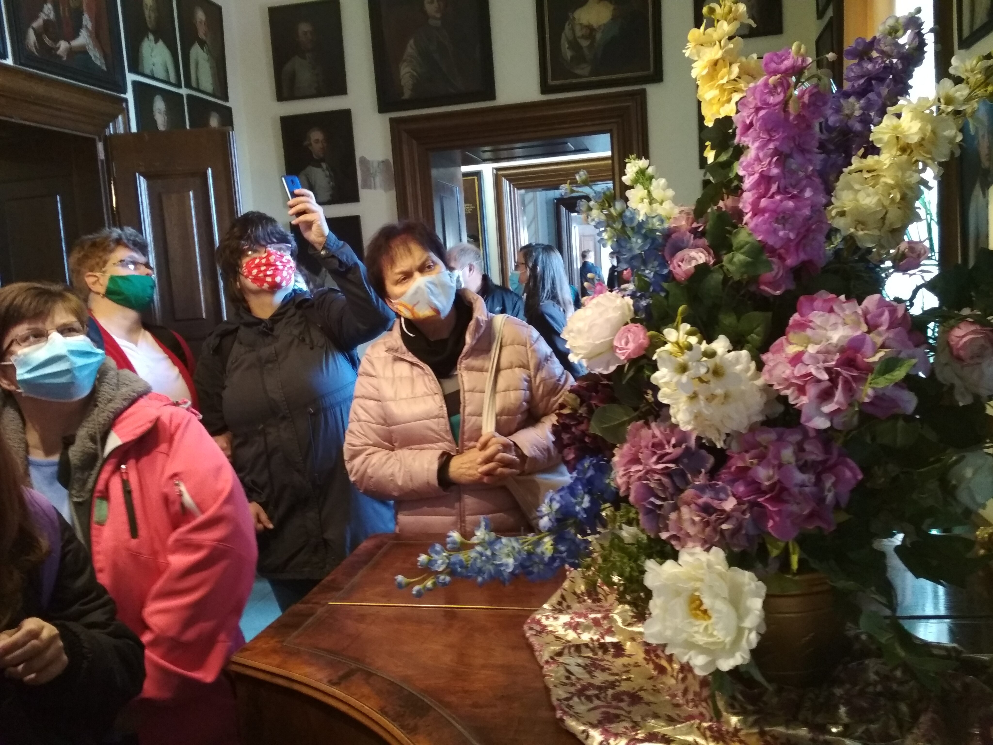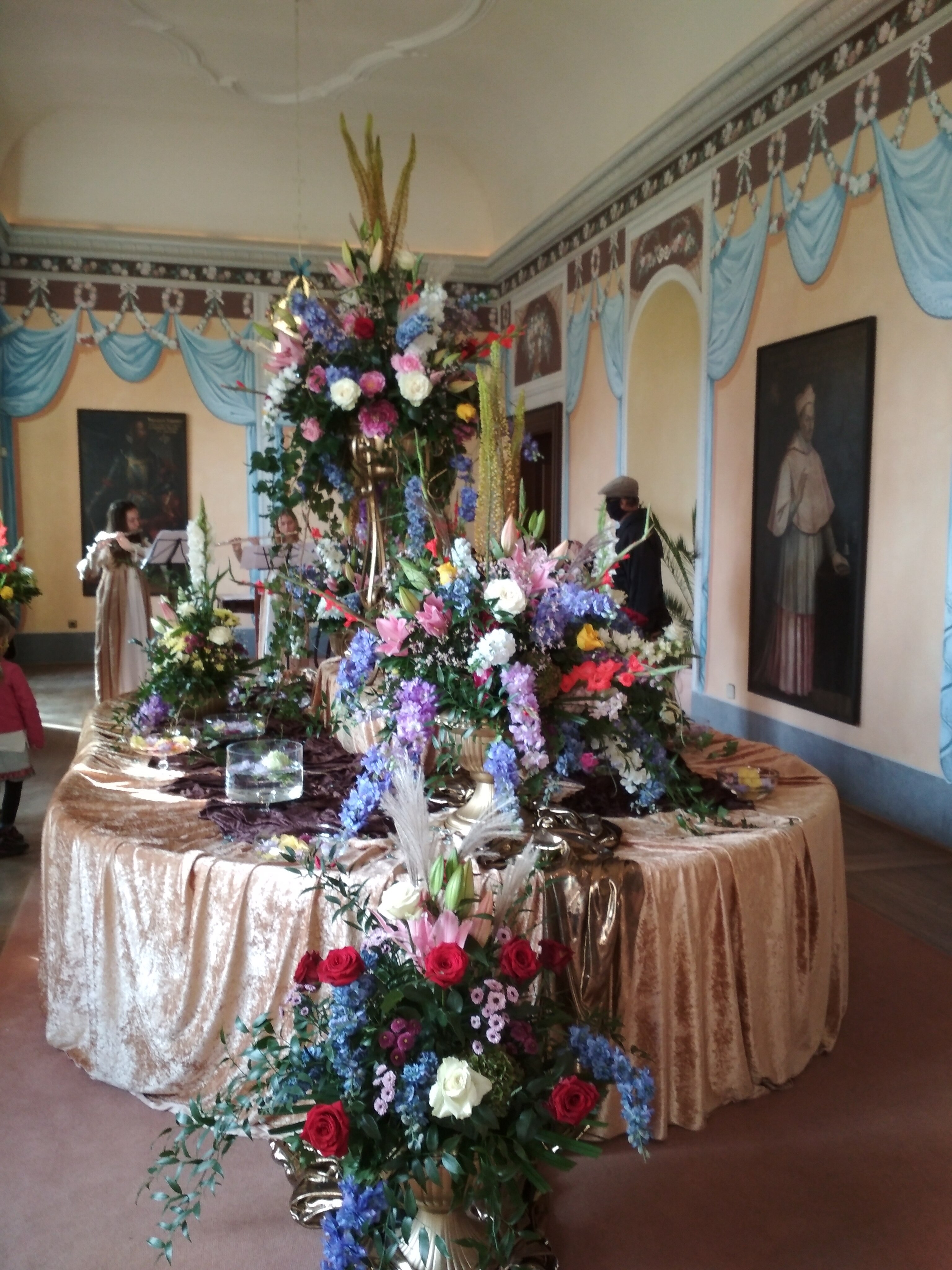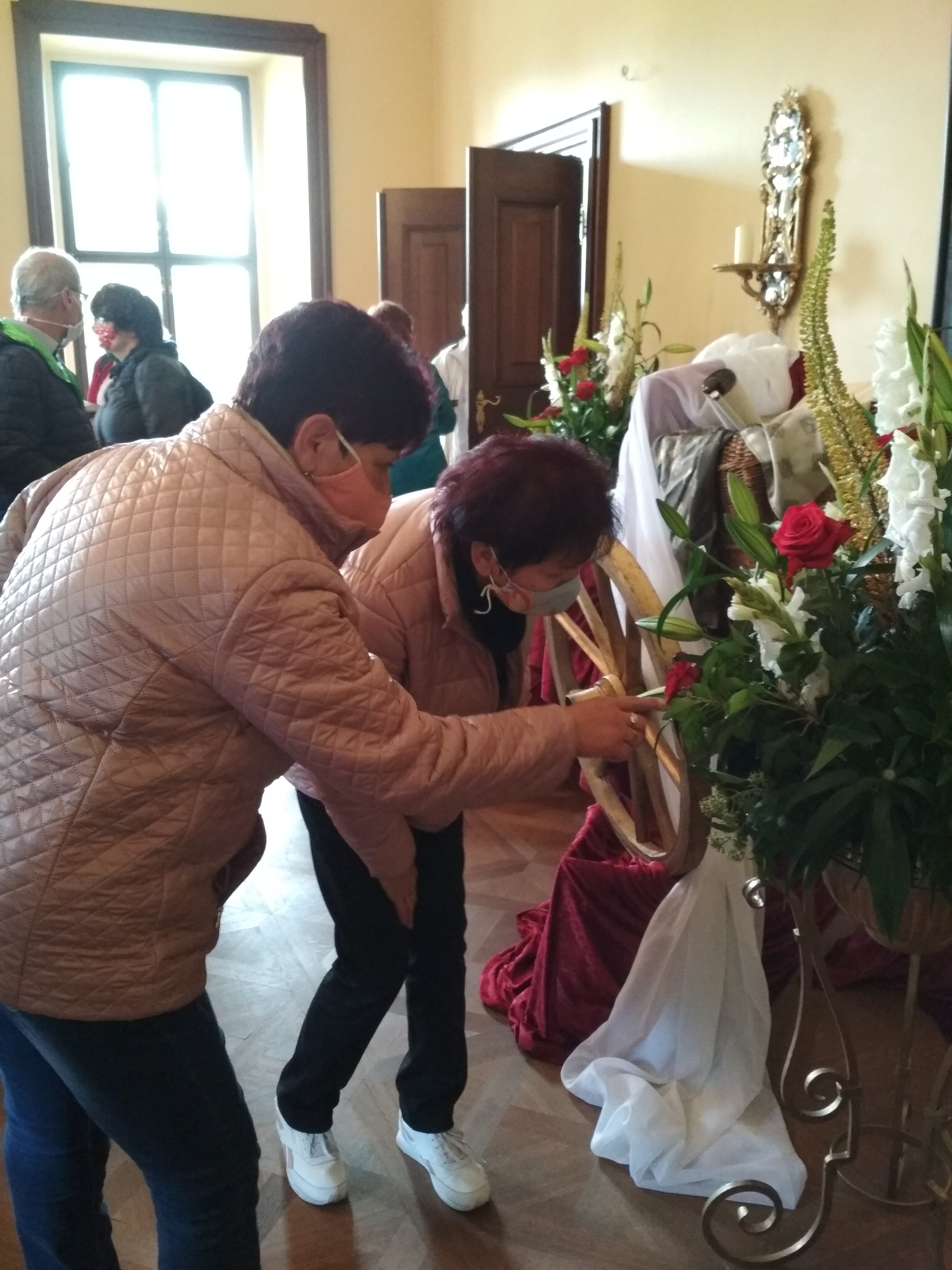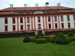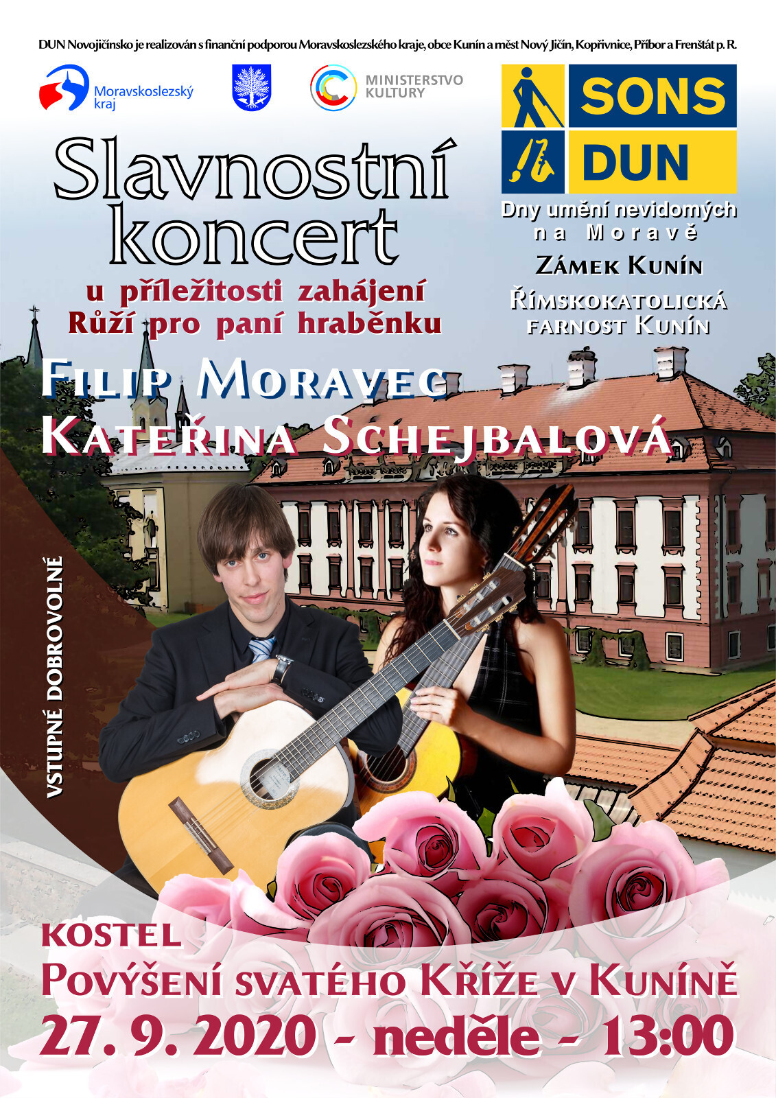 Ráno jsme měli sraz na olomoucké autobusové zastávce RegioJetu, kterým jsme cestovali do Nového Jičína. Zde nás čekala vedoucí odbočky Třinec, paní Marie Miziová, která zajistila (po domluvě s předsedou) náš odvoz auty do Kunína. Pro zájemce začínala od 8:45 mše v kostele, který byl dřevěným průchodem spojen se zámkem. K dispozici byla od 9:00 zdarma prohlídka zámku a zámecká kavárna a jako bonus - stánek odbočky Nový Jičín, s krásnými šitými látkovými výrobky. Po prohlídce zámku, nádherně vyzdobeného květinami, především růžemi v úžasných aranžmá, provedených celou řadou floristů (s výkladem paní Miziové), jsme měli domluvený jednotný oběd v zámecké restauraci. Od 13 hod začínal v kostele koncert v rámci festivalu Dny umění nevidomých na Moravě. Vystoupila nevidomá zpěvačka Kateřina Schejbalová za kytarového doprovodu Filipa Moravce.