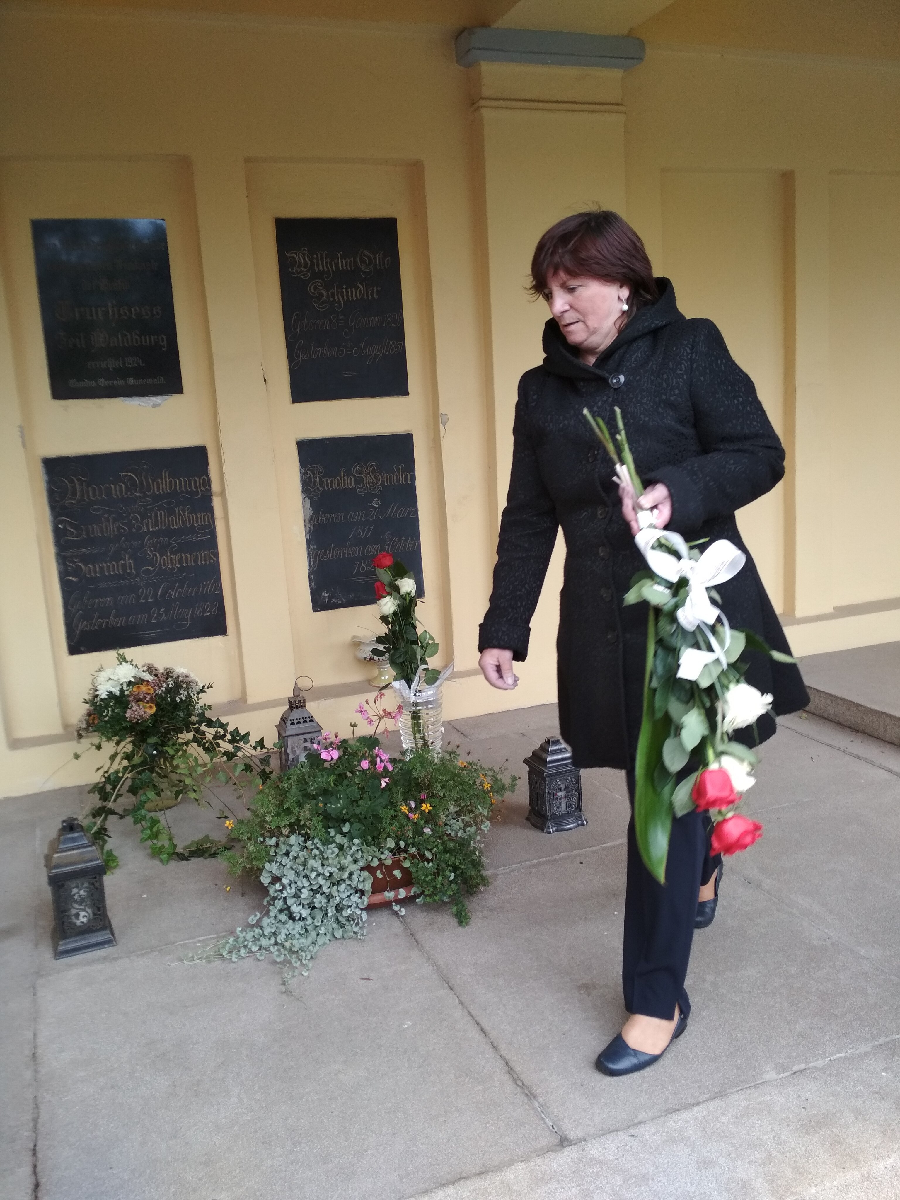 Všichni posluchači, kteří zaplnili celý prostor chrámu, byli nadšeni krásnou hudbou, uměleckým projevem zpěvačky a nádhernou akustikou kostela. A V závěru programu akce „Růže pro paní hraběnku“ jsme s členy OO Třinec a jejich vedoucí navštívili nedaleký hřbitov, kde p. Miziová vložila do připravených váz dvě krásné kytice bílo-červených růží. A ještě nám přiblížila příběh hraběnky Marie Walburgy (celým jménem Marie Walburka Josefa Kajetána Trauchsses-Waldburg-Zeilová), které zemřely tři děti a poté zde založila výchovně vzdělávací ústav – filantropinum. Zde studoval 3 roky i malý František Palacký. Její dědic Fridrich Emil Schindler se stal mecenášem Slepeckého ústavu v Brně. S paní Miziovou jsme se rozloučili velkým potleskem a finančním příspěvkem na růže. Cesta do Olomouce po procházce Kunínem na autobusovou zastávku a poté vlakem, proběhla bez komplikací. Tento výlet byl dlouho dopředu plánován, již v předchozím roce jsme uvažovali o jeho provedení. Díky iniciativě p. Miziové a našeho předsedy se uskutečnil a zanechal v přítomných příjemné vzpomínky. Ještě jednou děkujeme pořadatelům a především paní Marušce Miziové za krásně prožitý den.