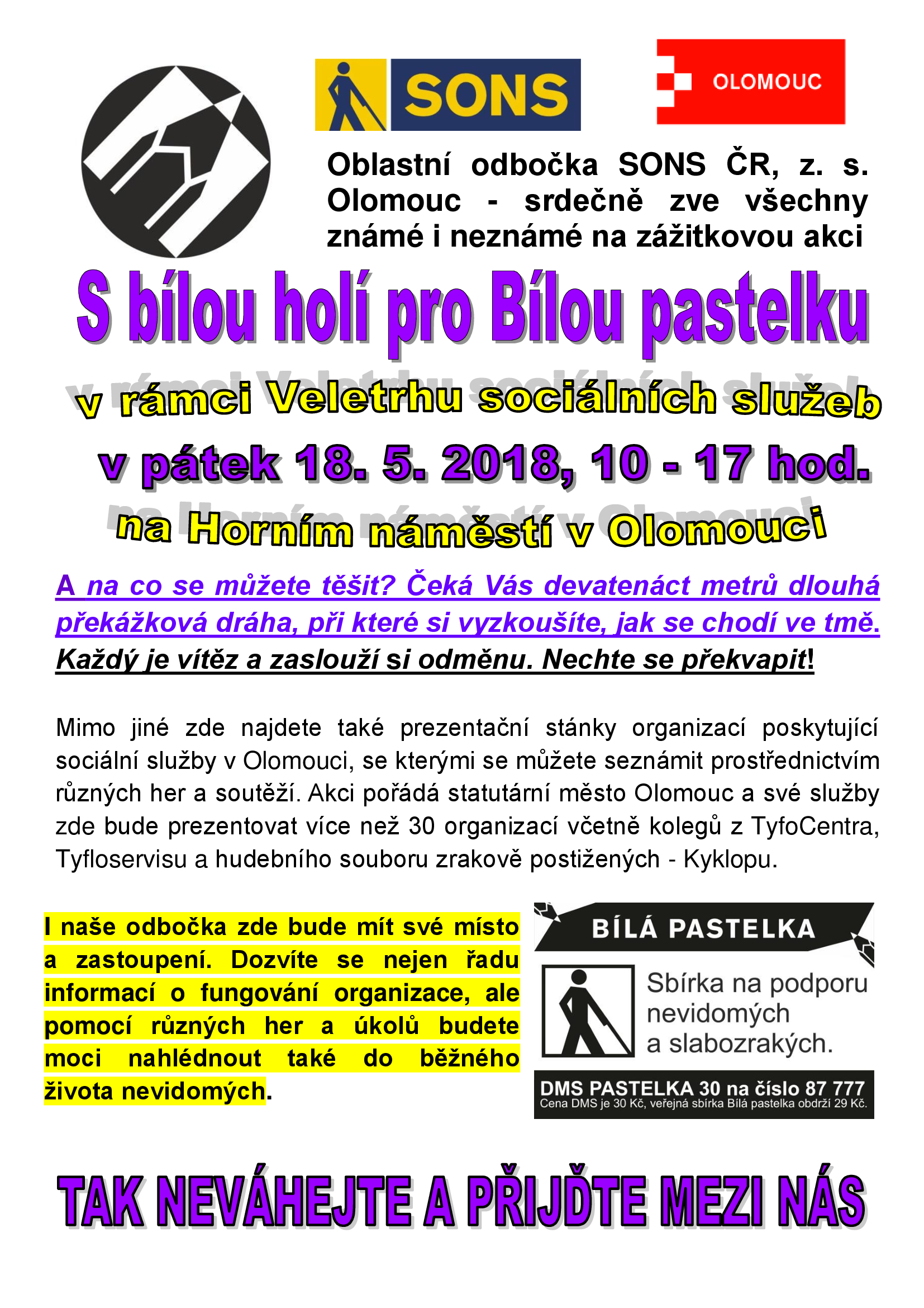 Mimo jiné zde najdete také prezentační stánky organizací poskytující sociální služby v Olomouci, se kterými se můžete seznámit prostřednictvím různých her a soutěží. Akci pořádá statutární město Olomouc a své služby zde bude prezentovat více než 30 organizací včetně kolegů z TyfloCentra, Tyfloservisu a hudebního souboru zrakově postižených - Kyklopu.