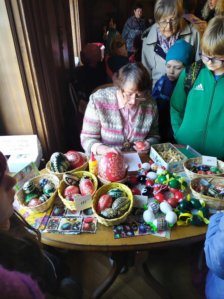 Sešli jsme se před vstupem do zámeckých prostor, kde bylo velice rušno. Dětičky z mateřských školek snad z celého Blanska zaplavily celé nádvoří. A tak jsme se proplétali mezi dětmi a prohlíželi si zámecké komnaty obsazené rukodělnými výrobky a jejich autory. Nechybělo tradiční zpracování skla z Galerie Skleněnka, pletení košíků a pomlázek, drátování a zdobení kraslic i perníčků. Díky podpoře města Blanska byl vstup na akci zdarma. Nás samozřejmě upoutaly nádherně zdobené kraslice, které na místě předváděla Radka Zouharová (členka našeho spolku). Prožili jsme překrásné dopoledne a nádherně se naladili na jarní svátky.