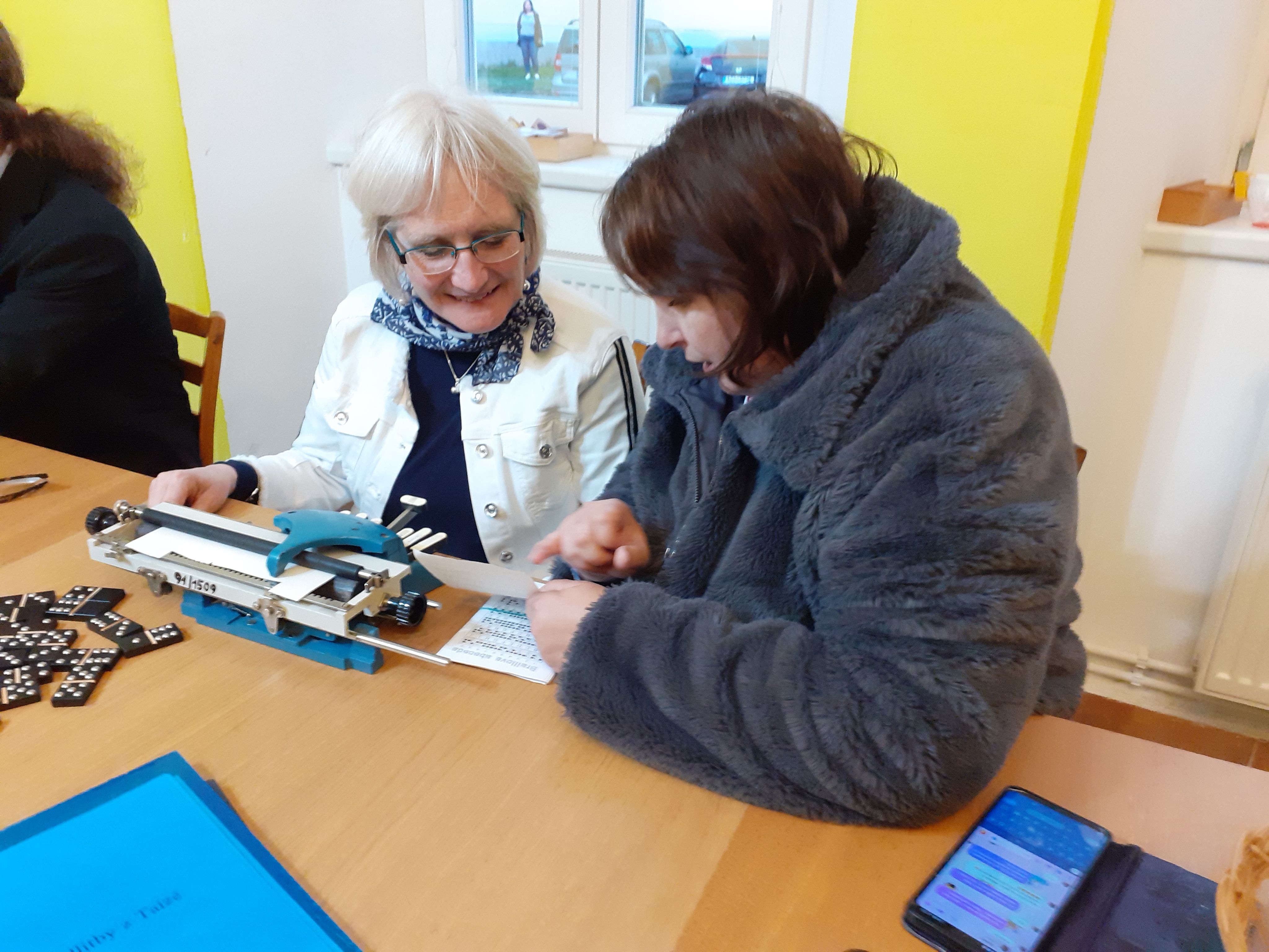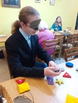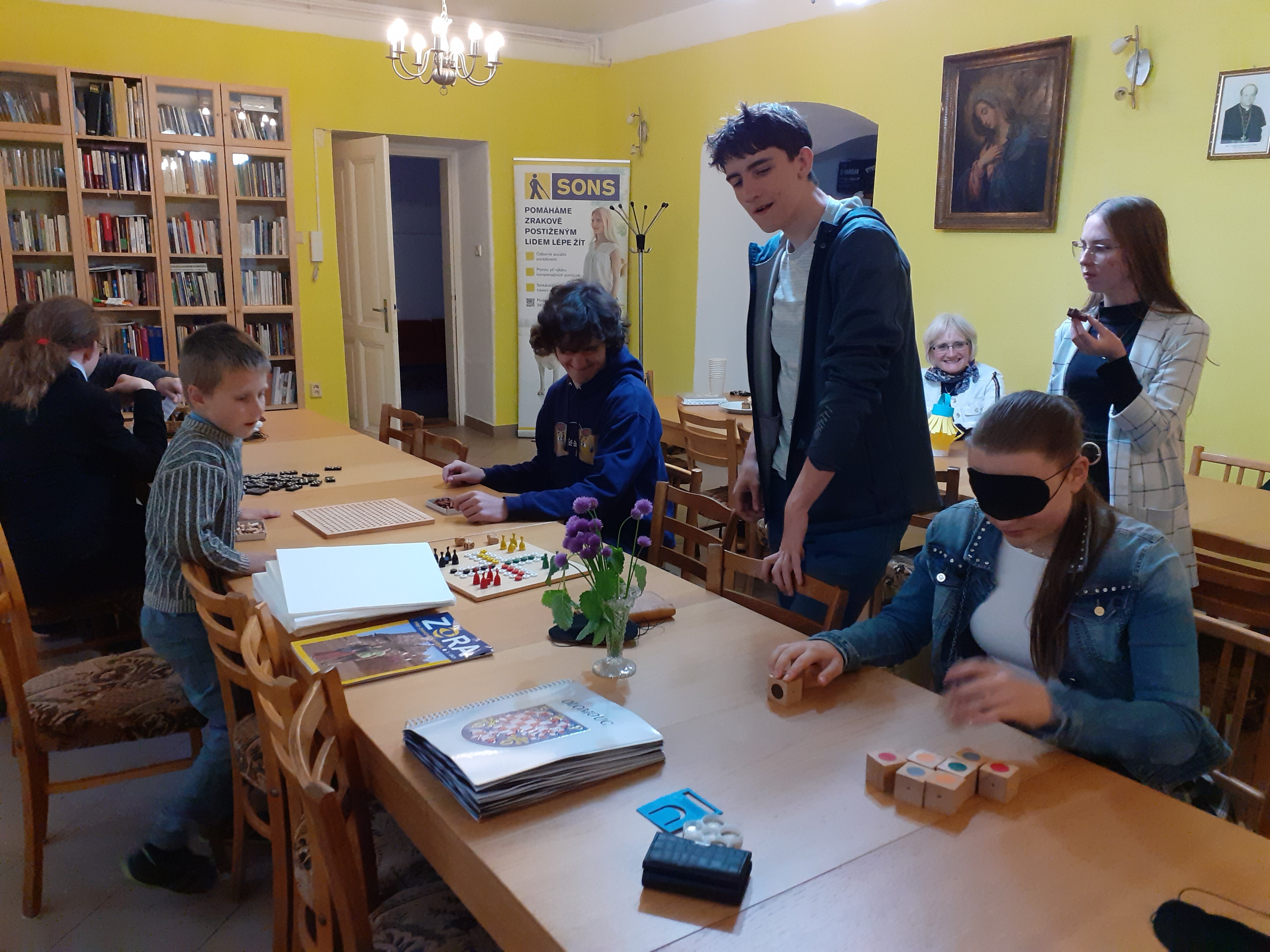 Měli jsme na starost kavárnu, ve které se návštěvníci mohli nejen občerstvit bohatým pohoštěním, ale také si vyzkoušet aktivity bez kontroly zraku. Poradili jsme, jak nevidomí poznají mince a bankovky, které pomůcky k jejich roztřízení mohou použít. Zájemci si mohli napsat své jméno na Pichtově psacím stroji, přičemž se seznámili s Braillovým bodovým písmem. Velkým lákadlem byly stolní hry upravené pro nevidomé – Domino, Člověče, nezlob se, Piškvorky. Mnozí vyzkoušeli hmatové, zvukové a čichové pexeso, simulační brýle očních vad.