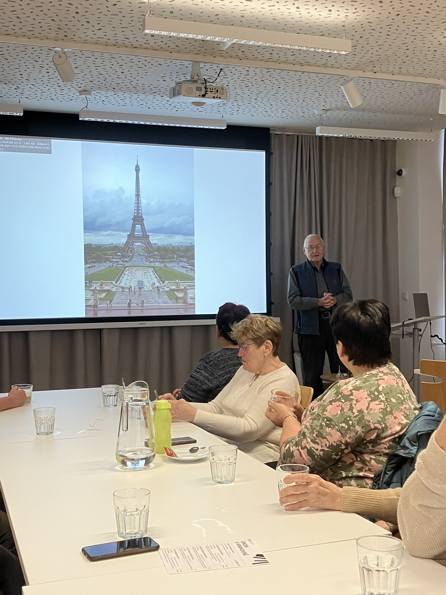 Od 15:00 hodin následovala ve společenském sále knihovny ve 4. patře přednáška „Paříž očima nevidomých“, kterou vedl JUDr. Libor Bureš. Přednáška přilákala velké množství návštěvníků a sál byl zcela zaplněn.