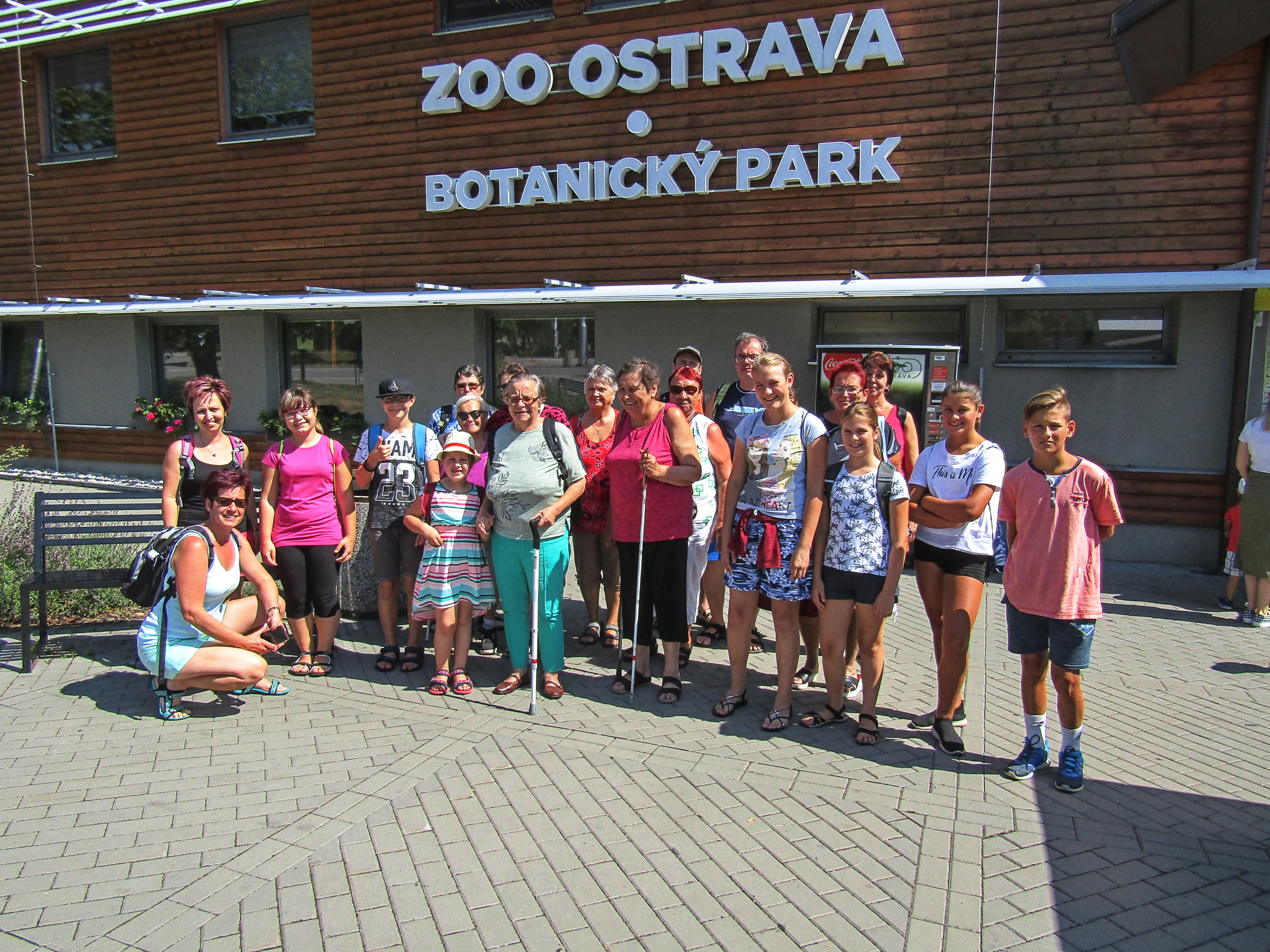 A konečně můžu napsat, že se nám druhý pokus vydařil. Počasí přálo a sluníčko přjemně hřálo. Po příjezdu jsme si udělali společnou fotku před Zoo, abychom mohli později vzpomínat. Po vstupu do areálu jsme se s vedoucími domluvili, že si ZOO každý projde jak chce, podle svých představ a možností. Stanovil se čas a místo, kde se nakonec všichni setkáme a prohlídka mohla začít. A protože jsou prázdniny, doprovázely naší skupinku i děti a vnoučata některých členů. Ty se velmi těšily na to, co uvidí.