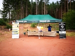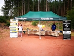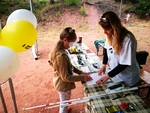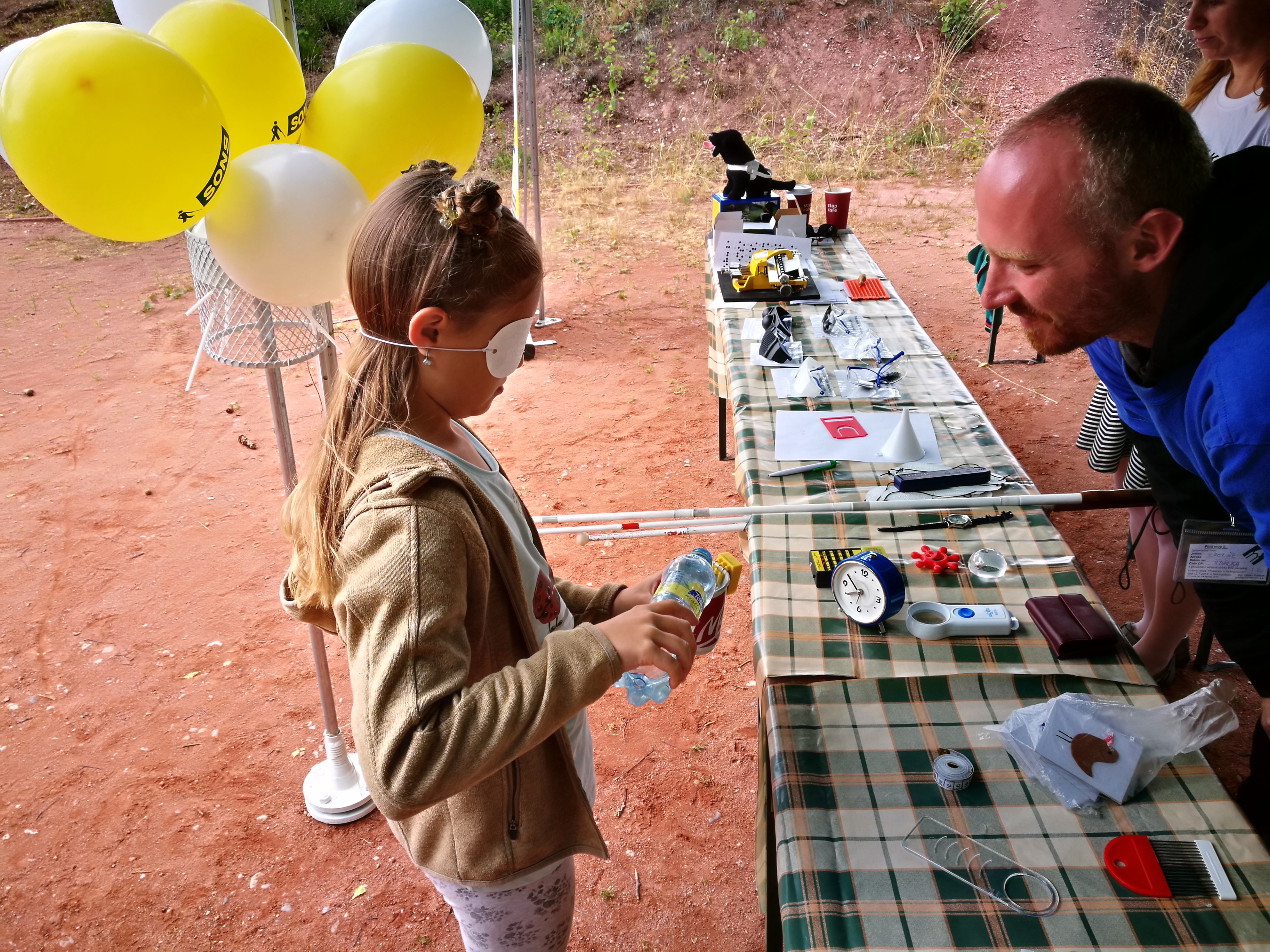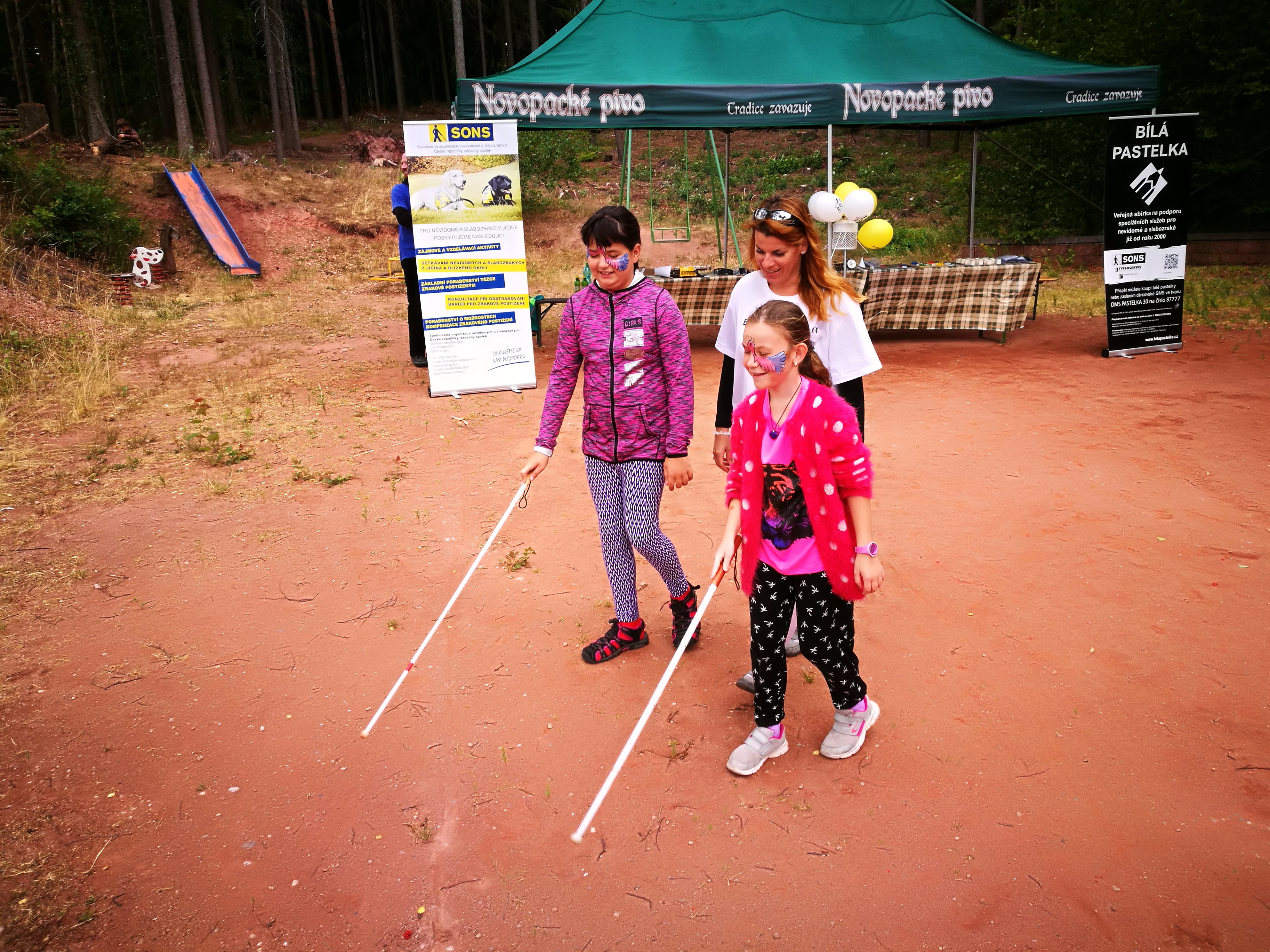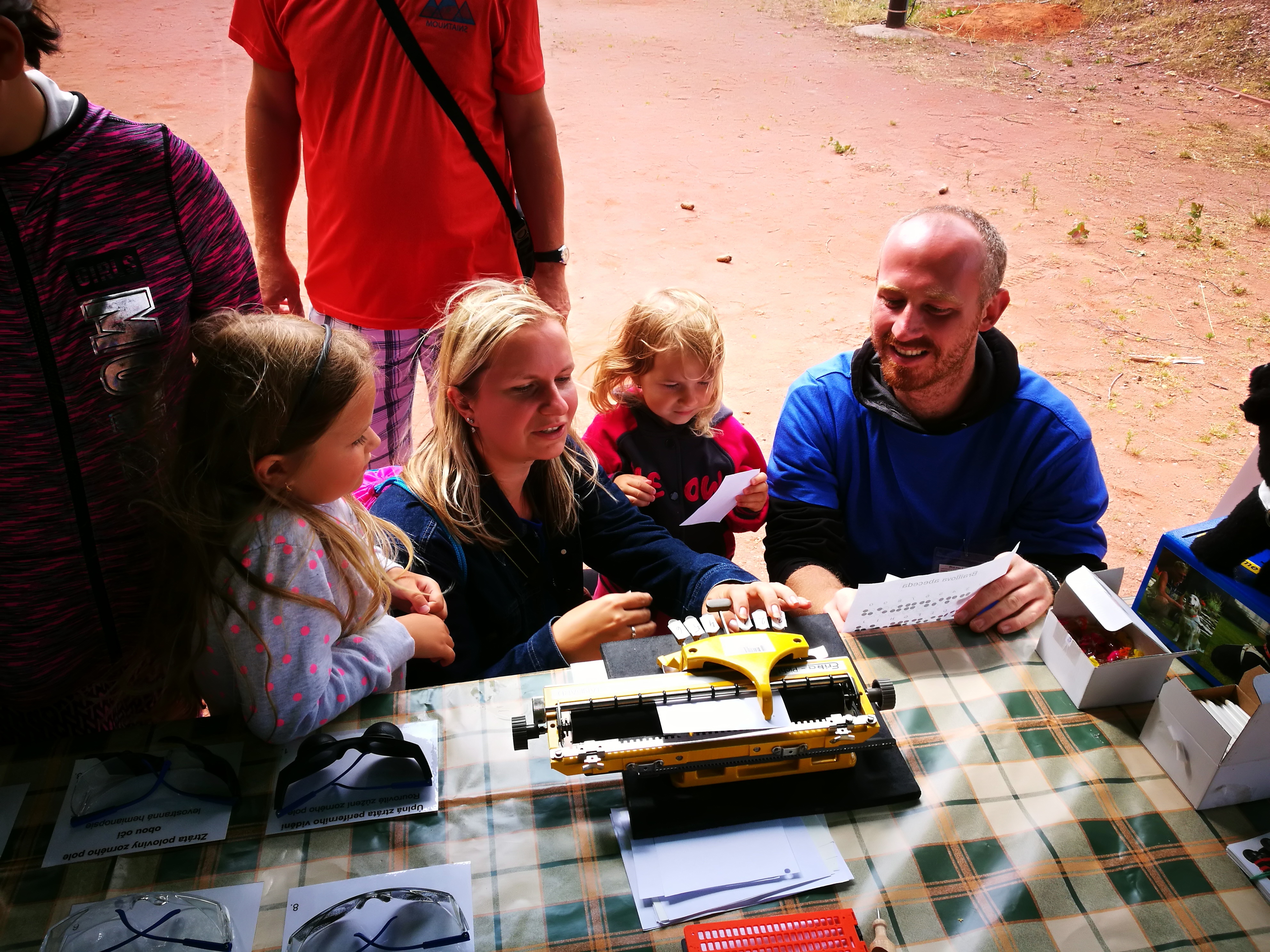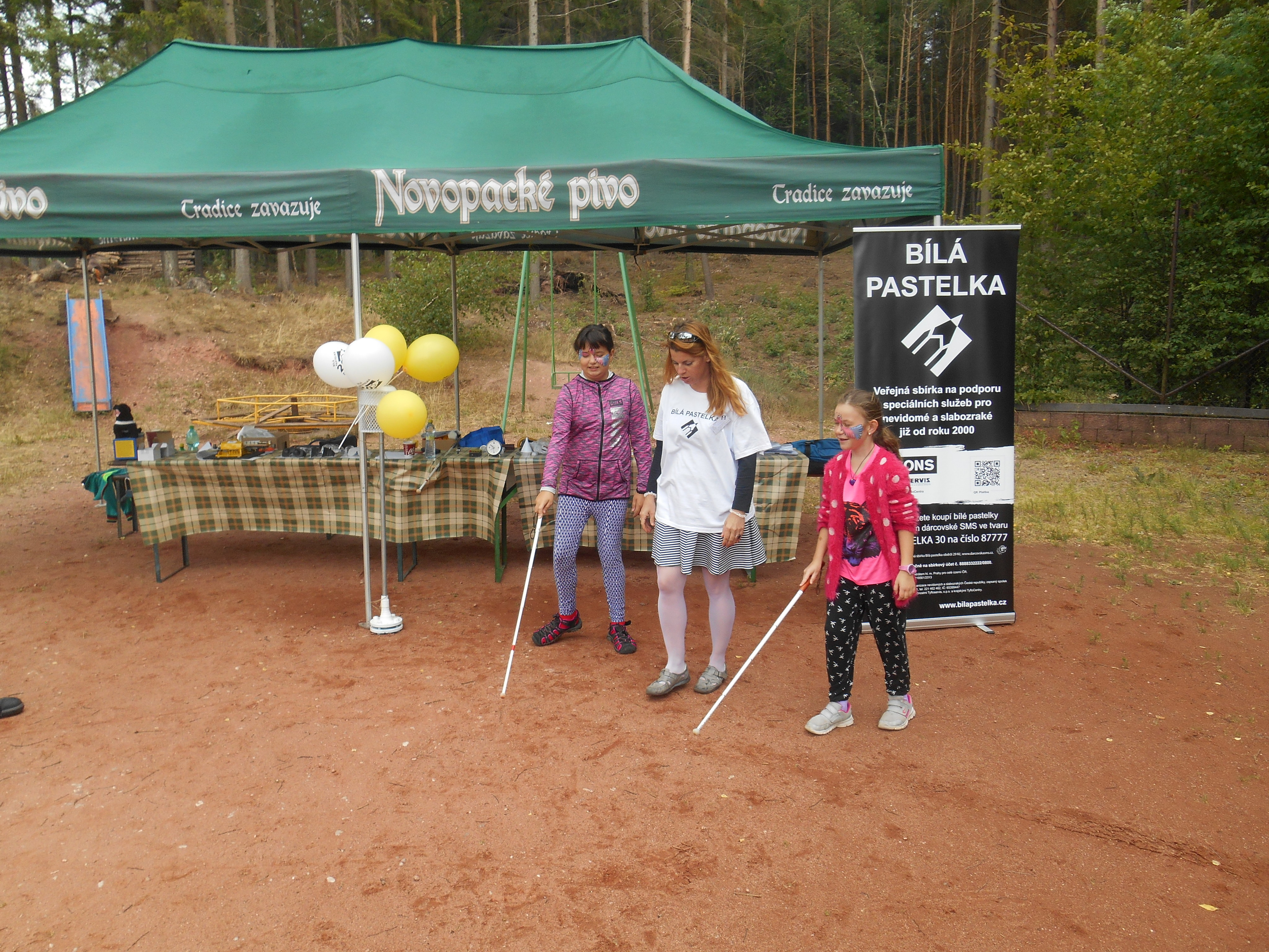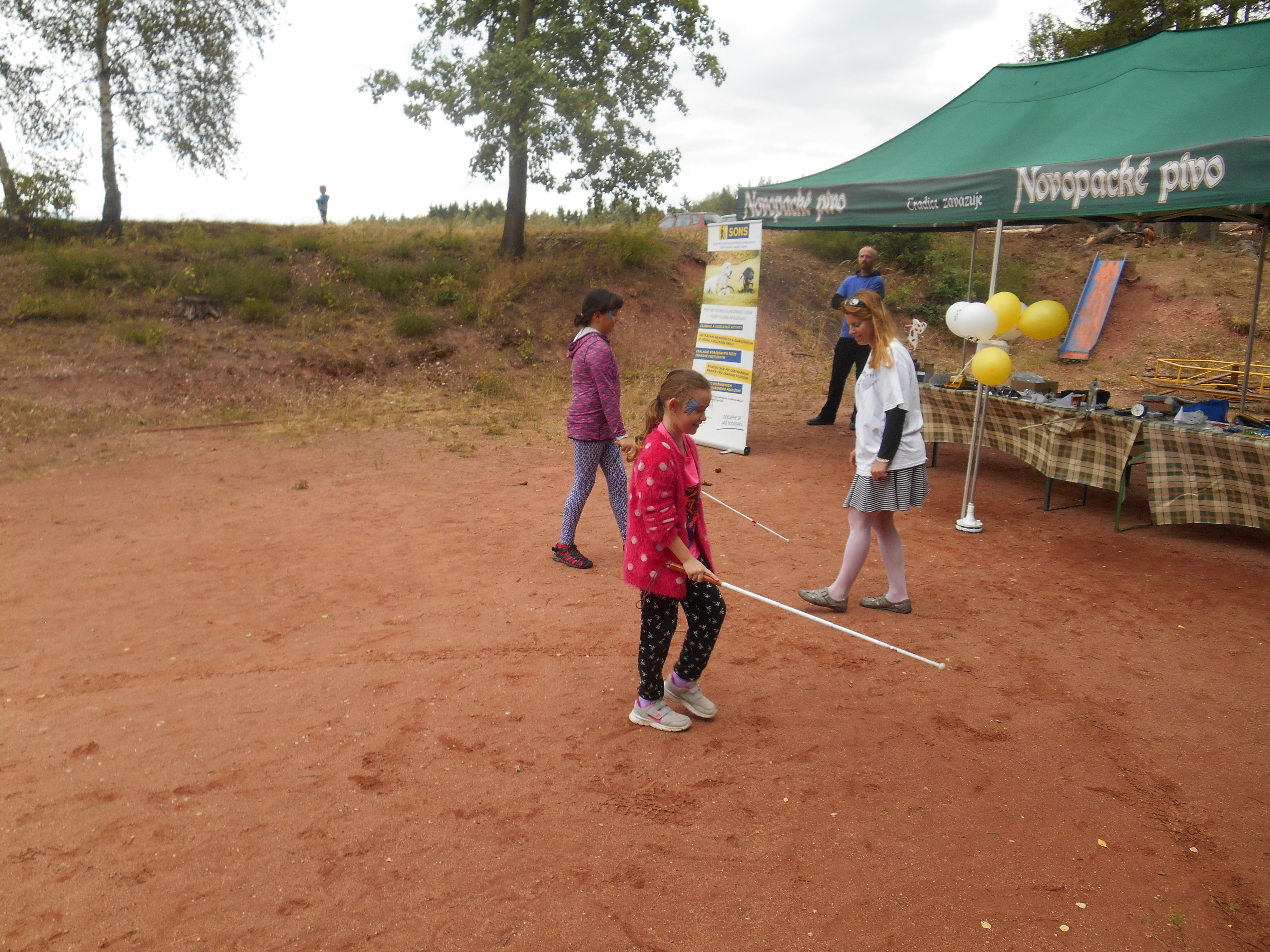 Prostorný a zastřešený stánek jsme opět „obklopili“ našimi pomůckami a s chutí jsme se pustili do práce. Opět jsme pár hodin vysvětlovali, jak funguje slepecké písmo, chodili s bílou holí, ukazovali zvukové a hlasové pomůcky, nalévali vodu a podepisovali poslepu. Rozdávali jsme odměny odvážným a těšili jsme se z velkého zájmu nejenom dětí, ale i dospělých.