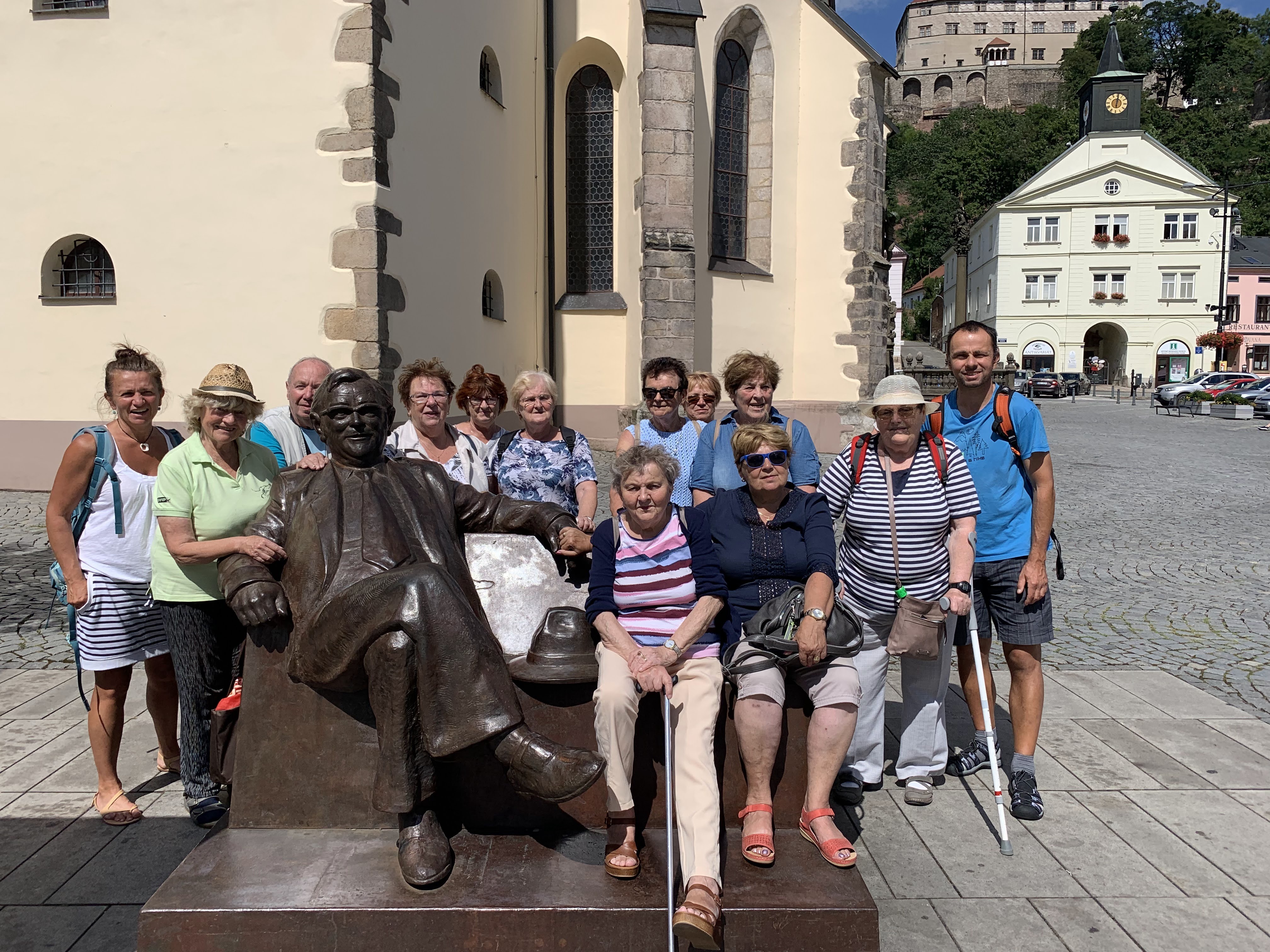 Návštěvu s přáteli jsme zakončili v příjemném prostředí kolonády u dobré kávy, abychom načerpali sil na cestu za poznáním okresního města. Náchod nás vítal v plné kráse letního dne. Poseděli jsme na lavičce Josefa Škvoreckého, vyfotografovali se a rozhlédli po uměleckých skvostech, významných budovách a historických zákoutích. Jak málo si člověk v běhu denního života a spěchu všímá krásy kolem sebe. Stačí se zastavit a rozhlédnout. Málokdo si například všimne sochy tzv. rytíře Hrona, údajného zakladatele Náchoda, umístěného na mohutném opěráku v nároží radniční věže.