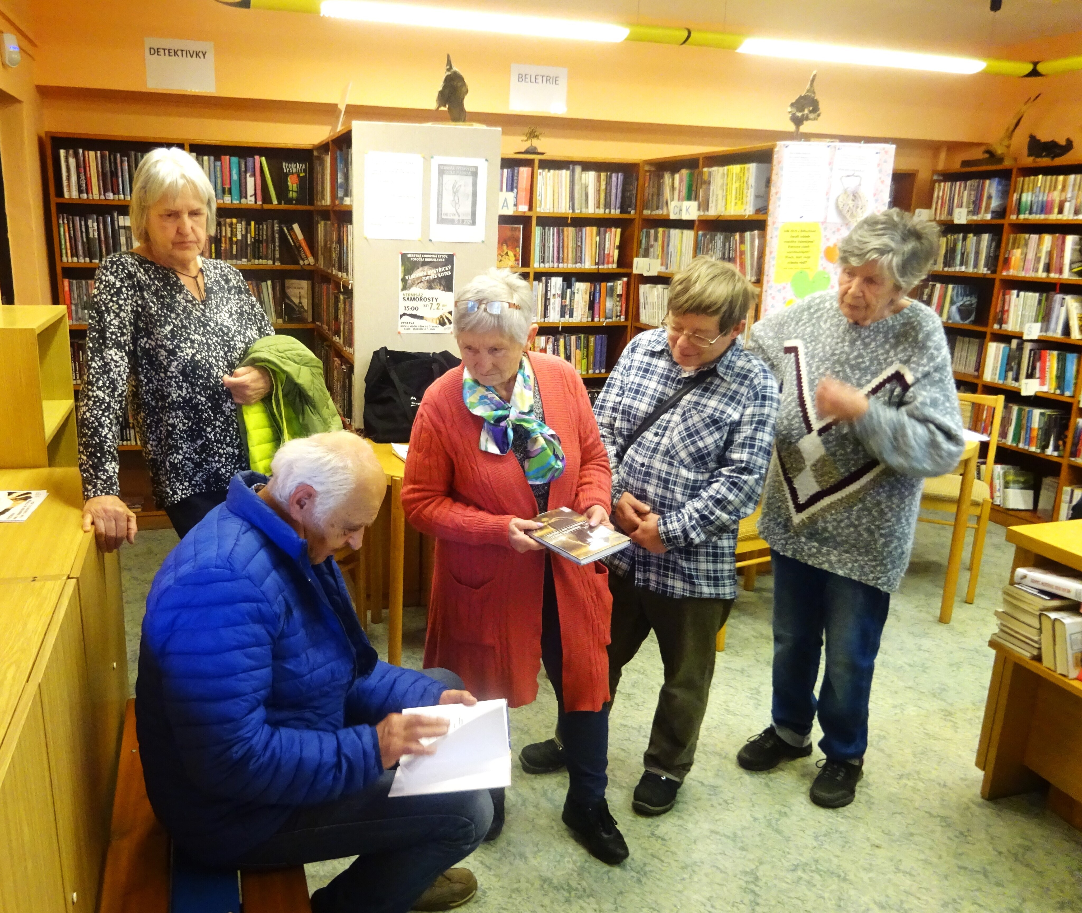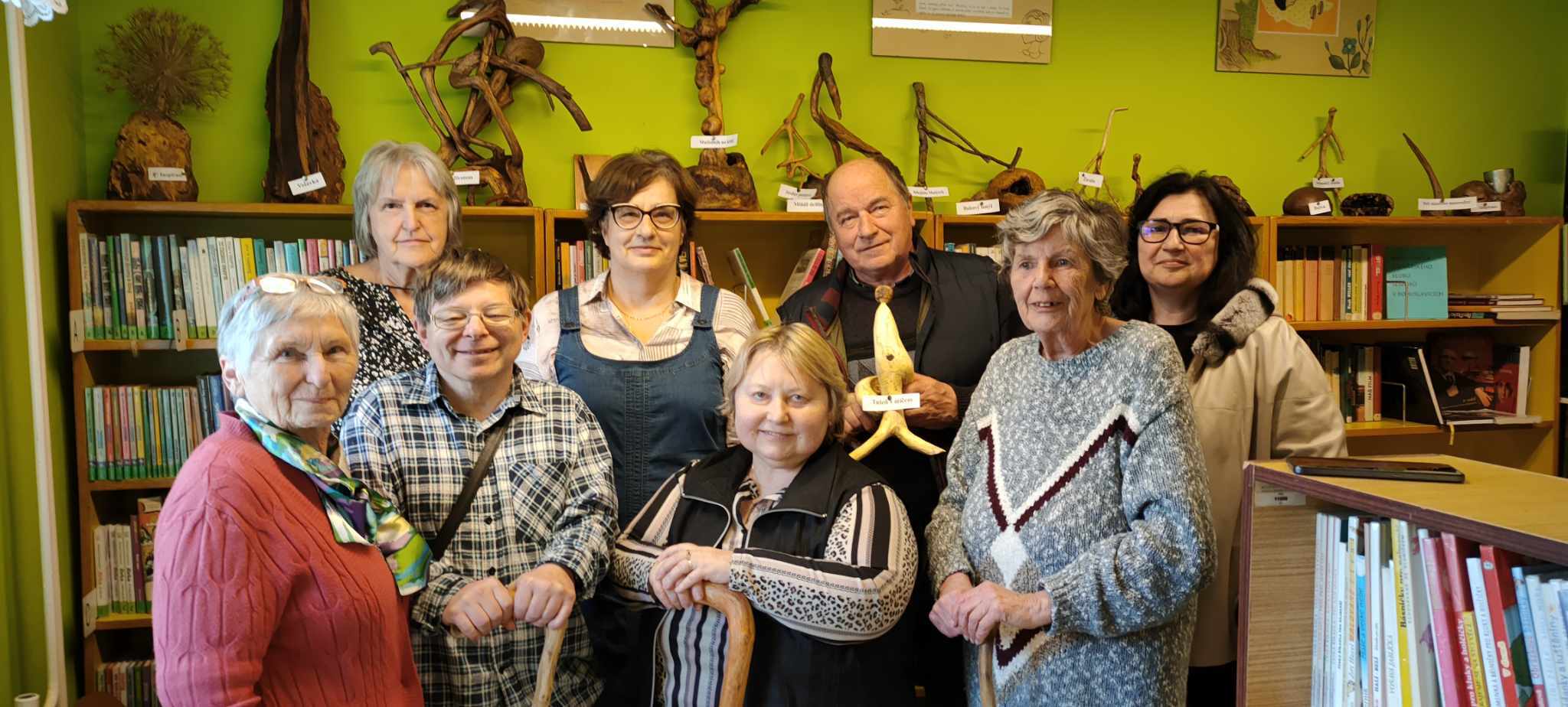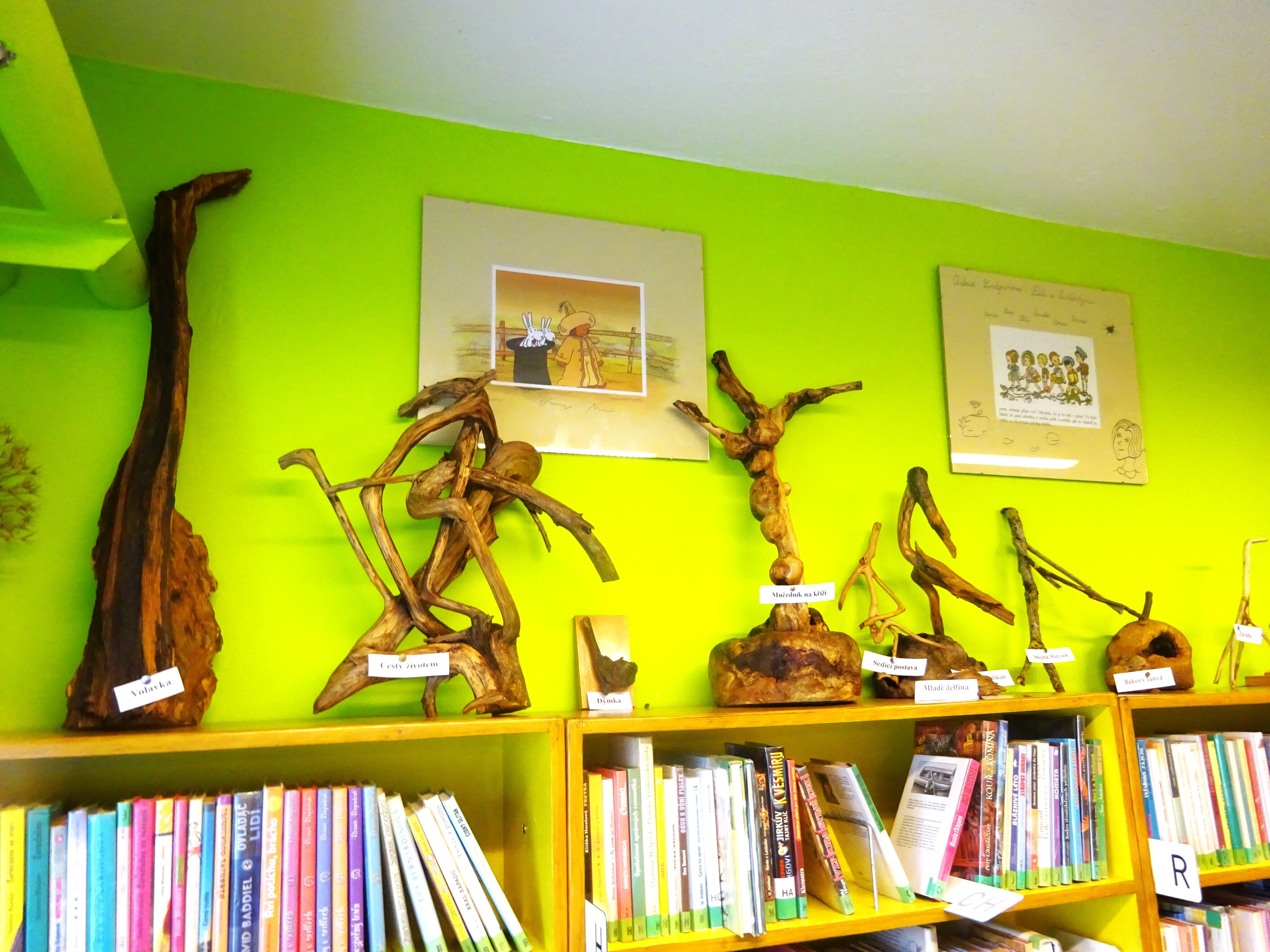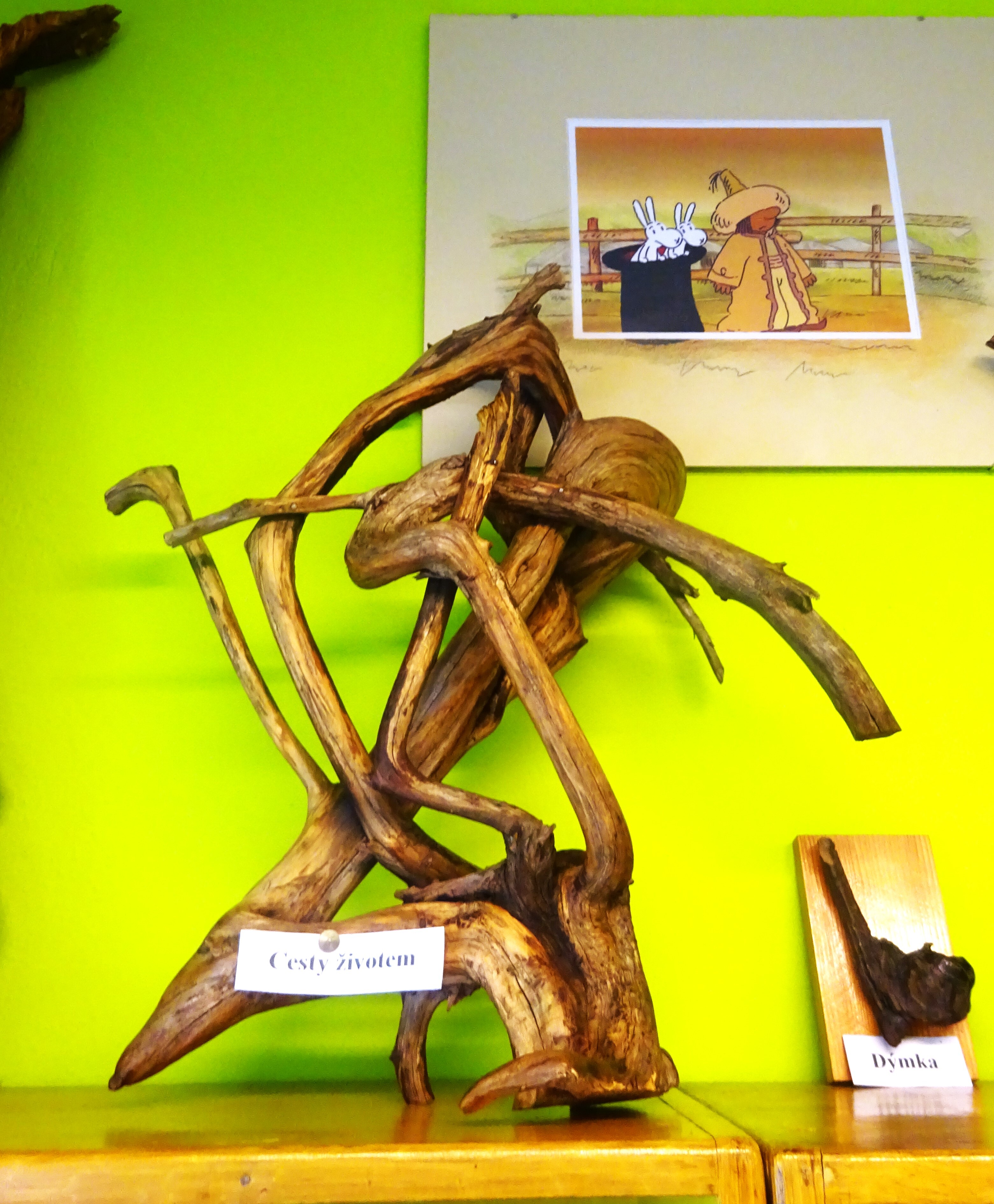 Ta první se uskutečnila v Bohuslavících u Kyjova, kde má knihovna pobočku. Zde probíhala výstava samorostů pana Vladimíra Bystřického a Zdeňka Kotka. Paní Anřka Zimková, pracovnice knihovny nás seznámila s chodem pobočky, nabídla malé občerstvení a posléze mezi nás přišel pan Kotek, se kterým jsme diskutovali o tom, jak vznikali jeho samorostí kousky. Výhodou této návštěvy bylo, že jsme měli možnost si každý vystavovaný kousek prohlédnout rukama a rozvíjet vlastní fantazii jednotlivých objektů.