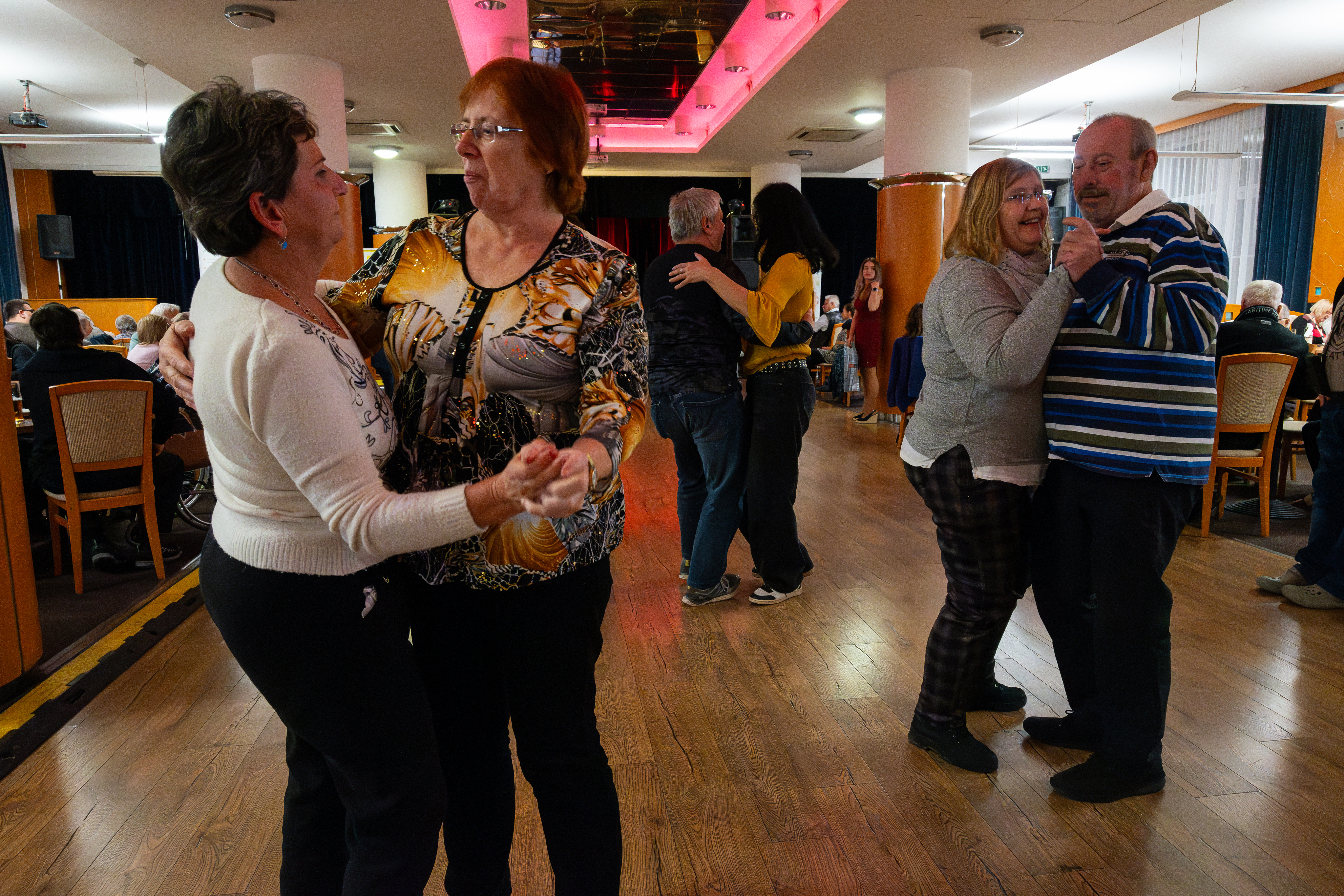 Avšak co by to bylo za pořádný festival, kdyby na účastníky nečekalo nějaké to překvapení. Jedno (plánované) si přichystali Radek a Elvis – společný duet a druhé (nečekané), když se k nim přidala i Ráchel Skleničková. Účastníci tak dostali naprosto unikátní zážitek v podobě vystoupení této trojice. Pak už na podiu zůstal Elvis sám v nádherném kostýmu a spustil rock n roll. Na konci již sál odměňoval Elvise bouřlivými ovacemi. A pozor i naše jedna členka (nebudeme jí jmenovat, snad jen dodám, že je nejlepší v Braillu), obdržela od Elvise milé pohlazení a do ouška vzkaz, když vydržíte tančit až do konce mého představení, pozvu Vás na sklenku vína. Už nevím, jak toto dopadlo, jen vím, že kdo se chtěl s Elvisem vyfotit, měl po skončení jeho vystoupení možnost.