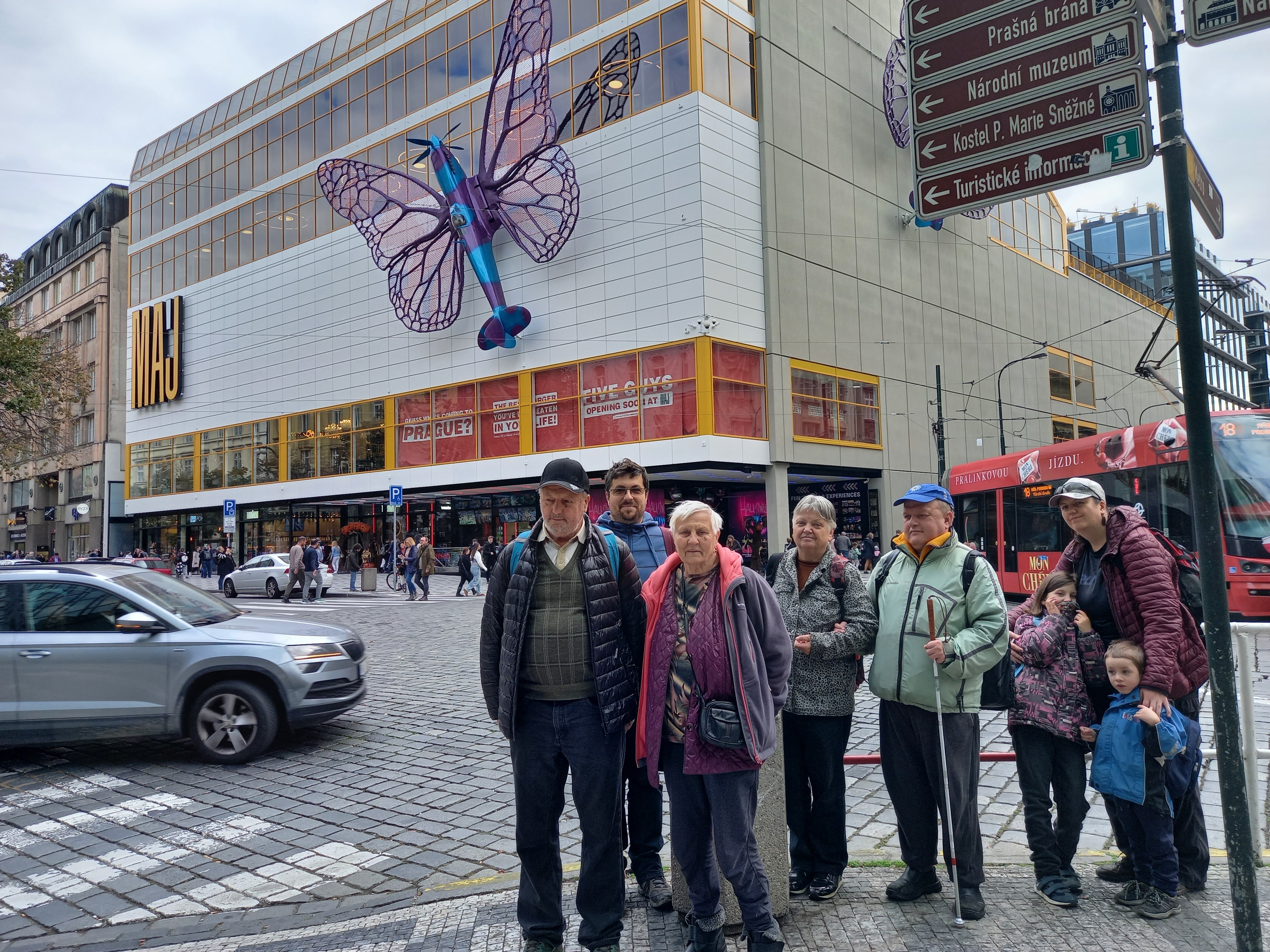 Po příjezdu jsme se vydali pěšky a tramvají na Národní třídu, kde jsme se podívali na výtvory Davida Černého – Motýli a la letadlo, které jsou připevněny na obchodním domu Máj. Poté jsme obdivovali další dílo tohoto umělce – pohyblivou hlavu spisovatele Franze Kafky. Naše kroky pokračovaly přes Františkánskou zahradu a někdo (včetně mě) se podíval hmatem na sousoší Fontány s divoženkami. A naše partička, kde byly i dvě prima děti, pochodovala na Václavské náměstí. Na naší výpravě v Praze jsme využili také autobus, ale i samotné Metro, kterým jsme směřovali k zastávce Budějovická. Tam nás čekala paní Řehořová z ústředí SONS Praha z oddělení bariéry, která nás pěkně přijala a starala se o nás, jako následně i všichni z týmu exkurze pražského Metra, na trase C, kde se v tyto dny konala výluka.
