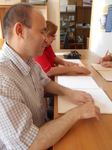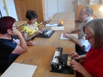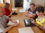 Po jejich zvládnutí a zopakování ostatních známých znaků a zakládání papíru do Pichtova psacího stroje jsme se mohli pustit do psaní a čtení, nejprve jednotlivých znaků – písmen a slabik, poté i slov a krátkých vět. Účastníci našich setkání zjistili, jak bude důležité s postupně přibývajícími novými znaky trénovat hmat pravidelným čtením.