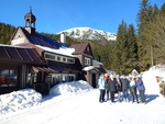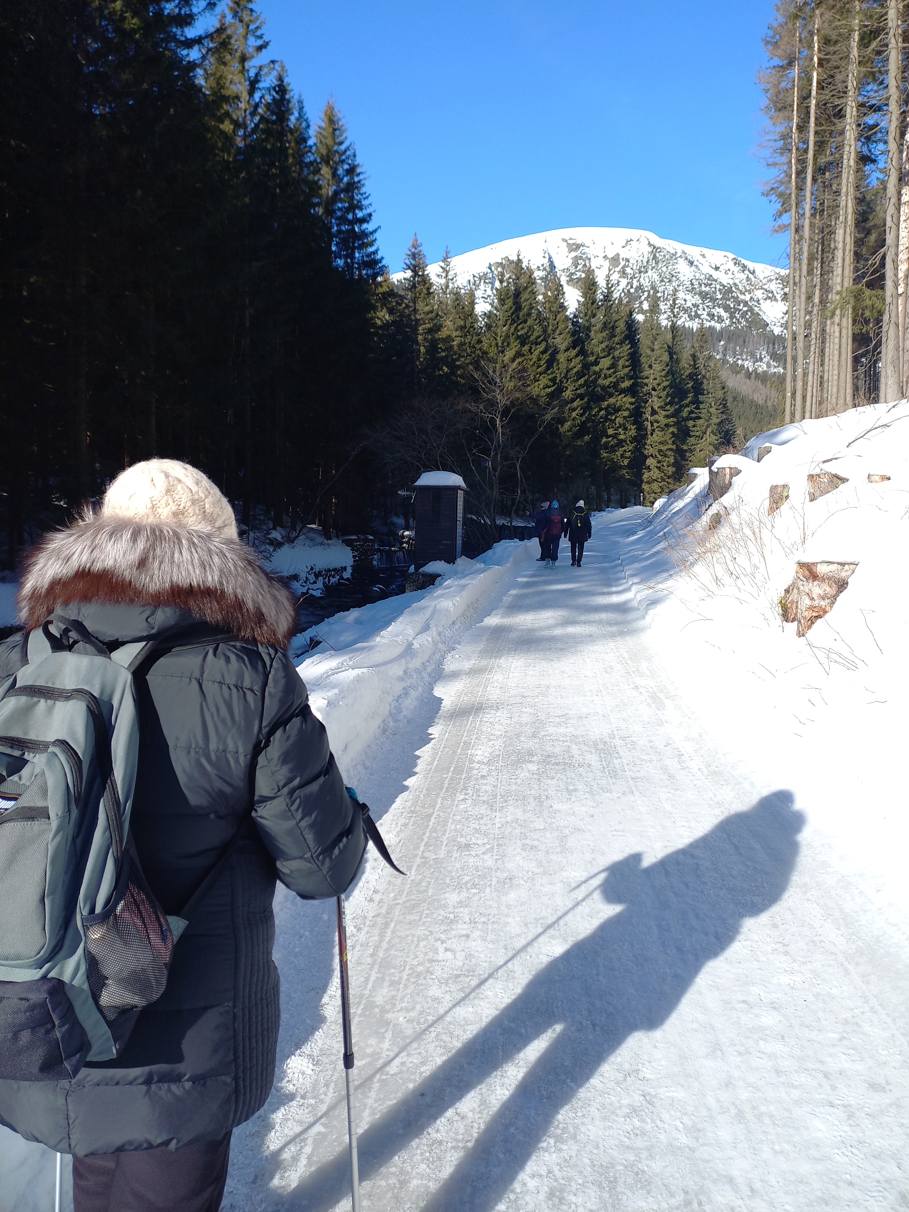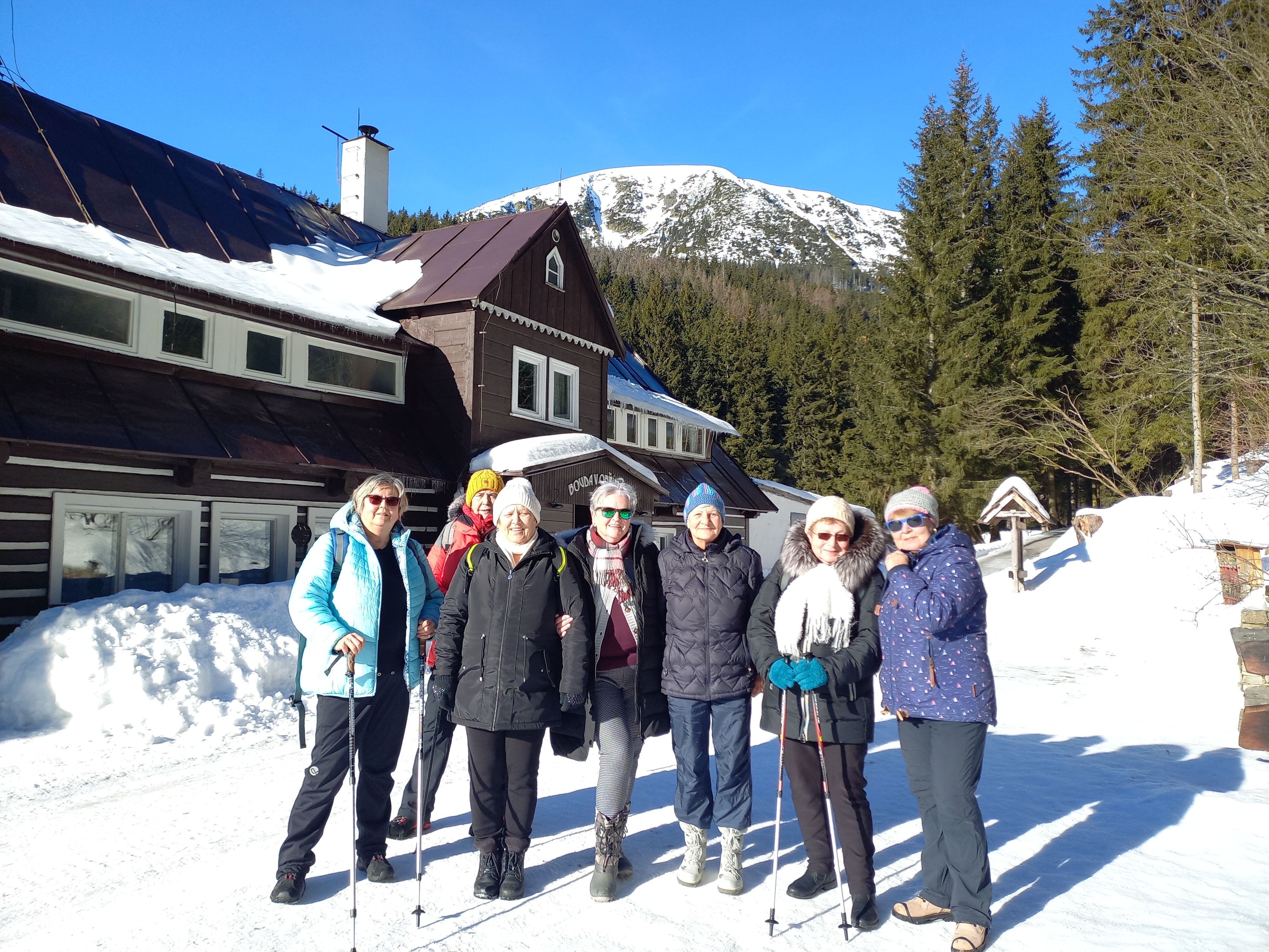První letošní výprava do našich Krkonoš nás zavedla do Obřího dolu. Počasí nám přálo – inverze – až do Svobody nevlídno, mlha a pak už jen sluníčko. Ale cesta to nebyla opravdu lehká. Bez nesmeků ani ránu. Cesta na několika místech pokrytá jen ledem. A další zrada: naše oblíbená Bouda v Obřím dole nás vypekla – zavřeno… To se nám ještě při našich pravidelných návštěvách tohoto místa nestalo. Takže svačinka venku to jistila a na kávu a něco dobrého jsme zašly do boudy Betyny. A byly jsme nad míru spokojeni. Borůvkové knedlíky neměly chybu!