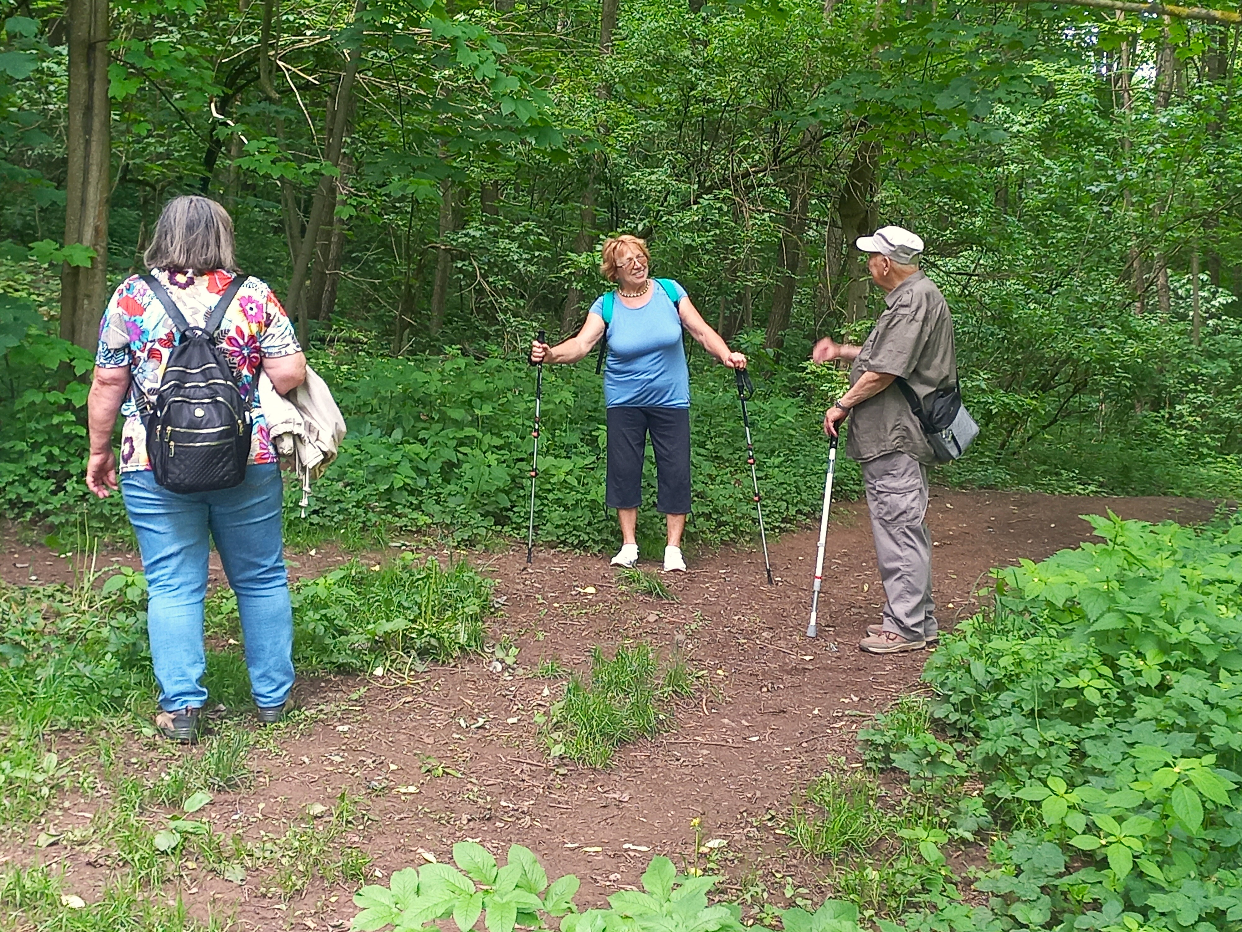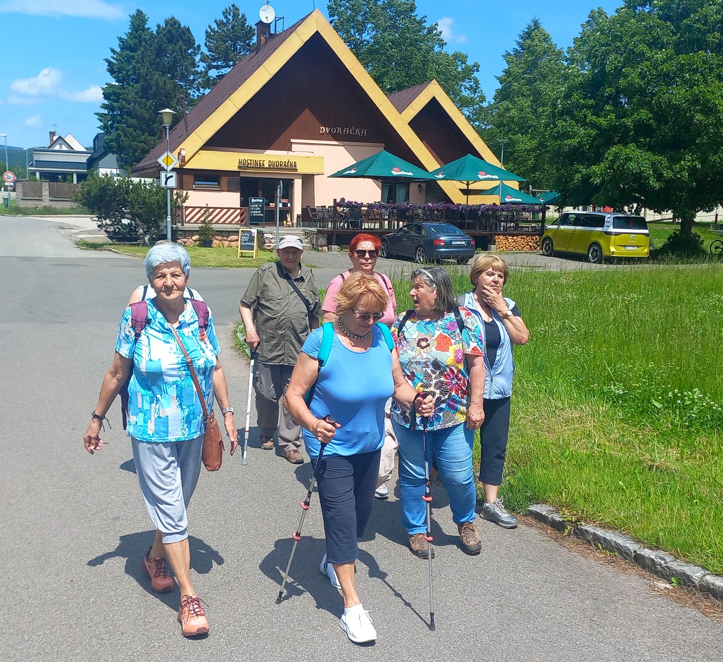Tento měsíc jsme za cíl naší turistické vycházky zvolili blízké okolí Trutnova. Nejdříve jsme se svezli busem do Poříčí a tam odtud jsme se vydali okruhem kolem našeho města. První zastávka na občerstvení byla v nově otevřené restauraci Dvoračka – a že jsme ji v tom vedru opravdu uvítali…, poté jsme se vydali Dračí roklí a přes Výsluní. Vedro nám dávalo zabrat, tak to jistila ještě jedna zastávka… pitný režim se musí dodržovat…😊 Nám již známý Bar U Simči nám opět poskytli útočiště. A rádi jsme si tu zavzpomínali na nedávné herní dopoledne, které se tu konalo.