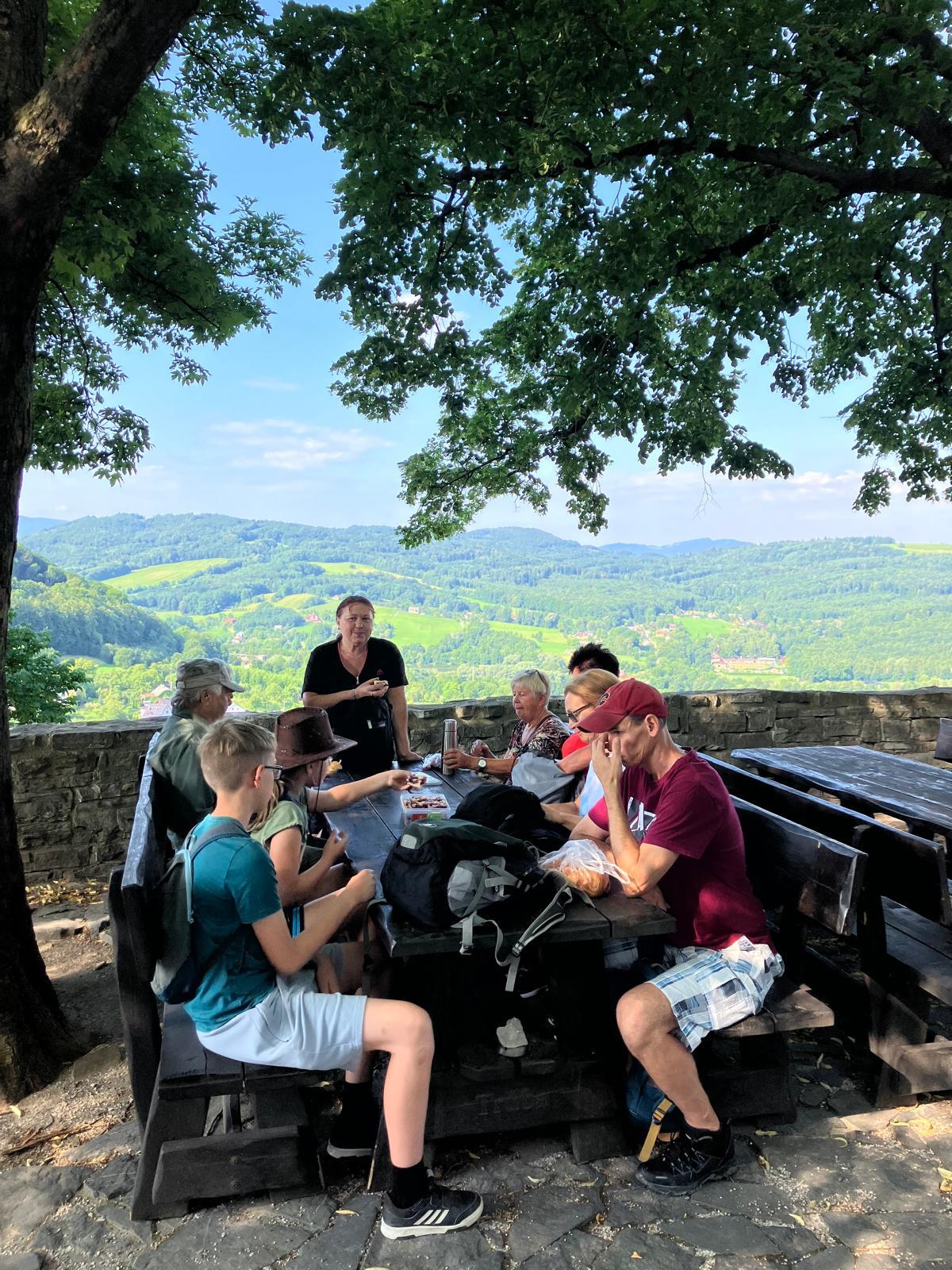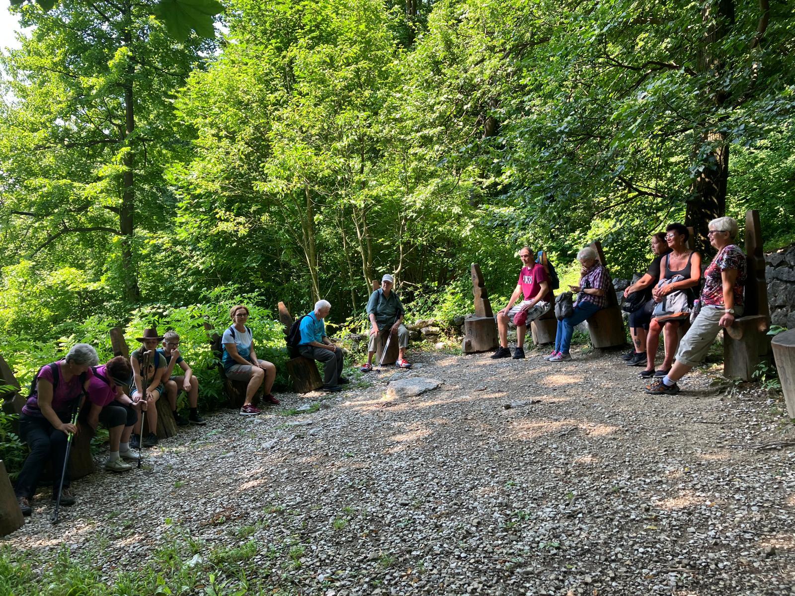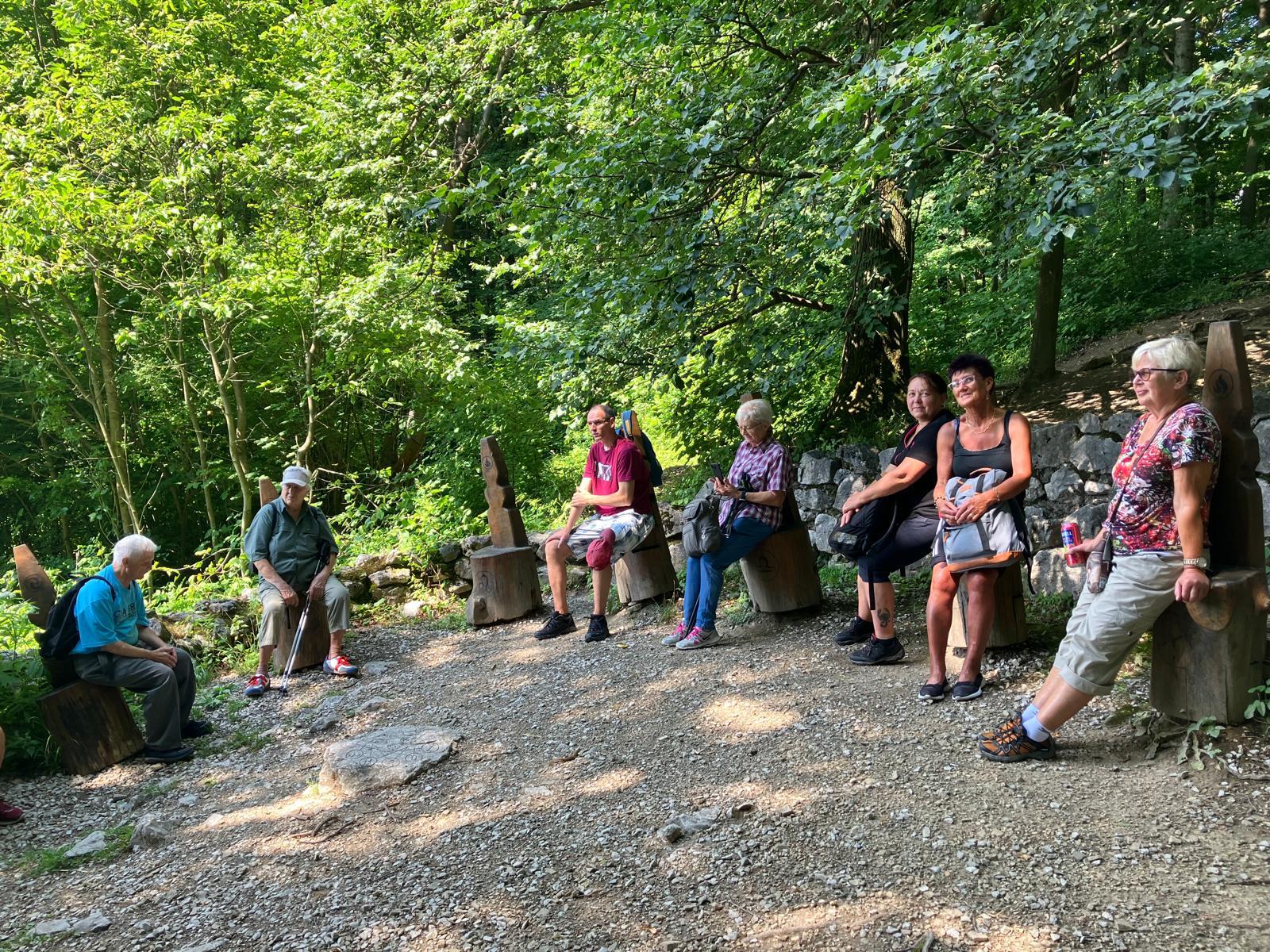 Z města se poté celá skupina vydala po turisticky značené trase směrem k rozhledně na Bílé hoře. Cesta lesem nabídla příjemné prostředí, klid a osvěžení. Po výšlapu a krátkém odpočinku přišel sestup zpět do města, během něhož turisté navštívili originální místo s kamennými křesly, na nichž byla vyryta znamení zvěrokruhu. Téměř všechna křesla byla obsazena – někde seděli dva lidé, jinde se dokonce vměstnali tři zájemci. Smích a dobrá nálada zde nebraly konce.