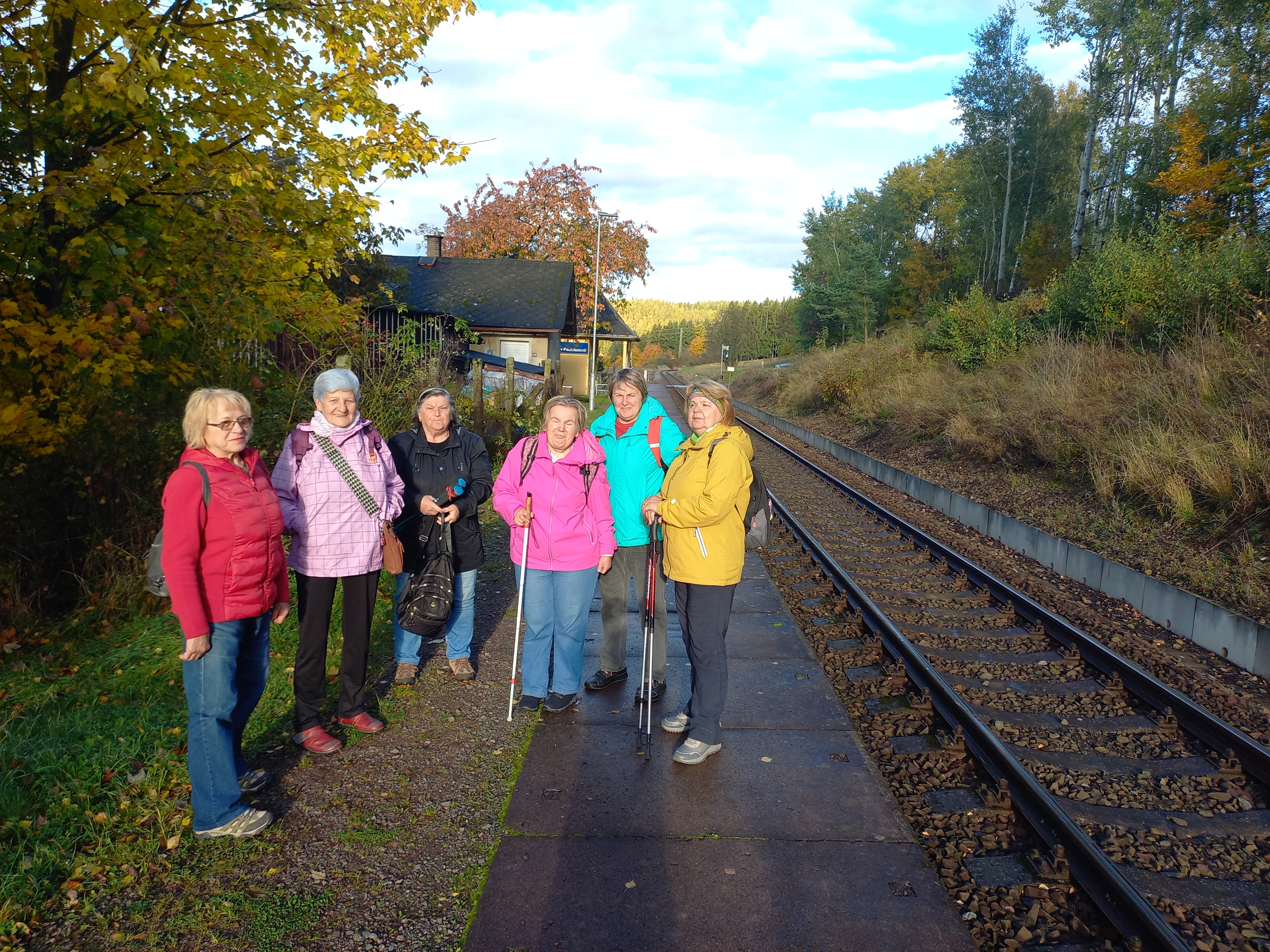 Naše skupinka stojící na vlakové zastávce ve Rtyni v Podrkonoší. Vlak již odjel a my se vydáváme na trasu. Svítí slunce.