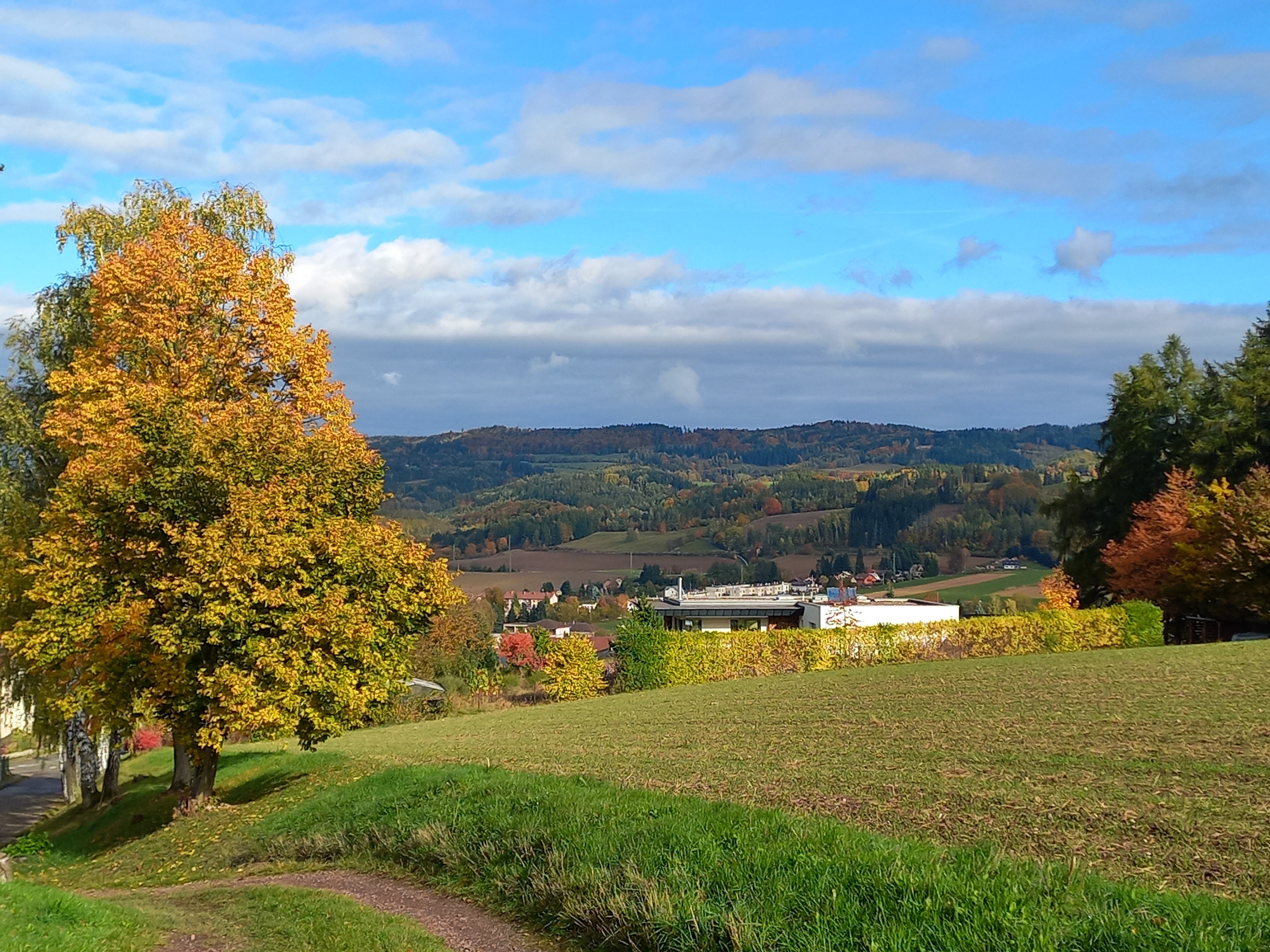 Pohled na Jestřebí hory - vlevo podzimně zabarvený strom, pod námi Rtyně a na obzoru hřeben Jestřebích hor.