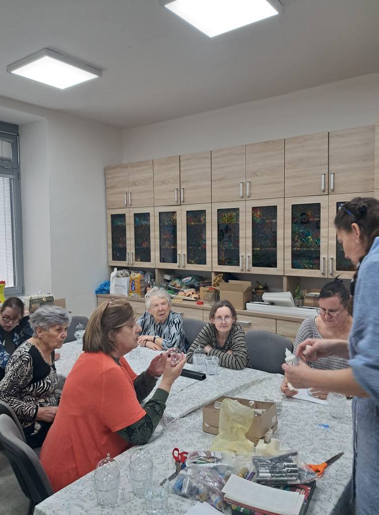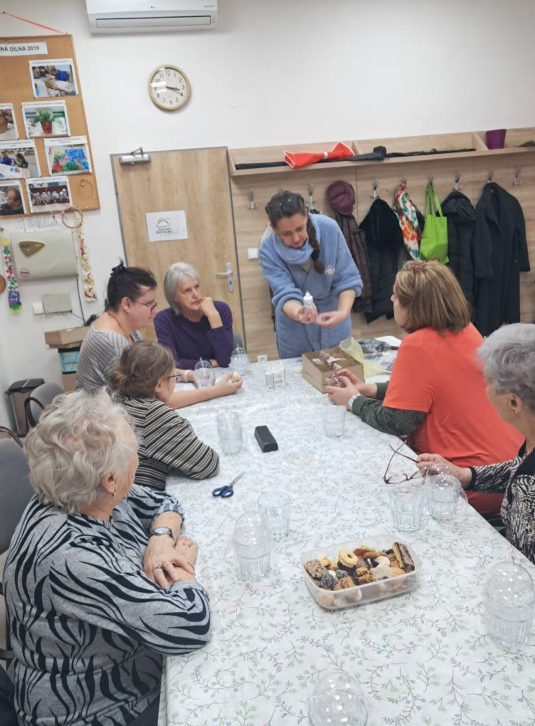 Paní, která pro nás celou akci zorganizovala si s sebou přinesla veškerý materiál. Popsala nám, k čemu co slouží a jak je možno ozdobu vyrobit. Vše bylo upraveno pro osoby se zrakovým postižením, takže si každý účastník mohl vyzkoušet nabízené techniky a vytvořit si výrobek dle vlastního vkusu.