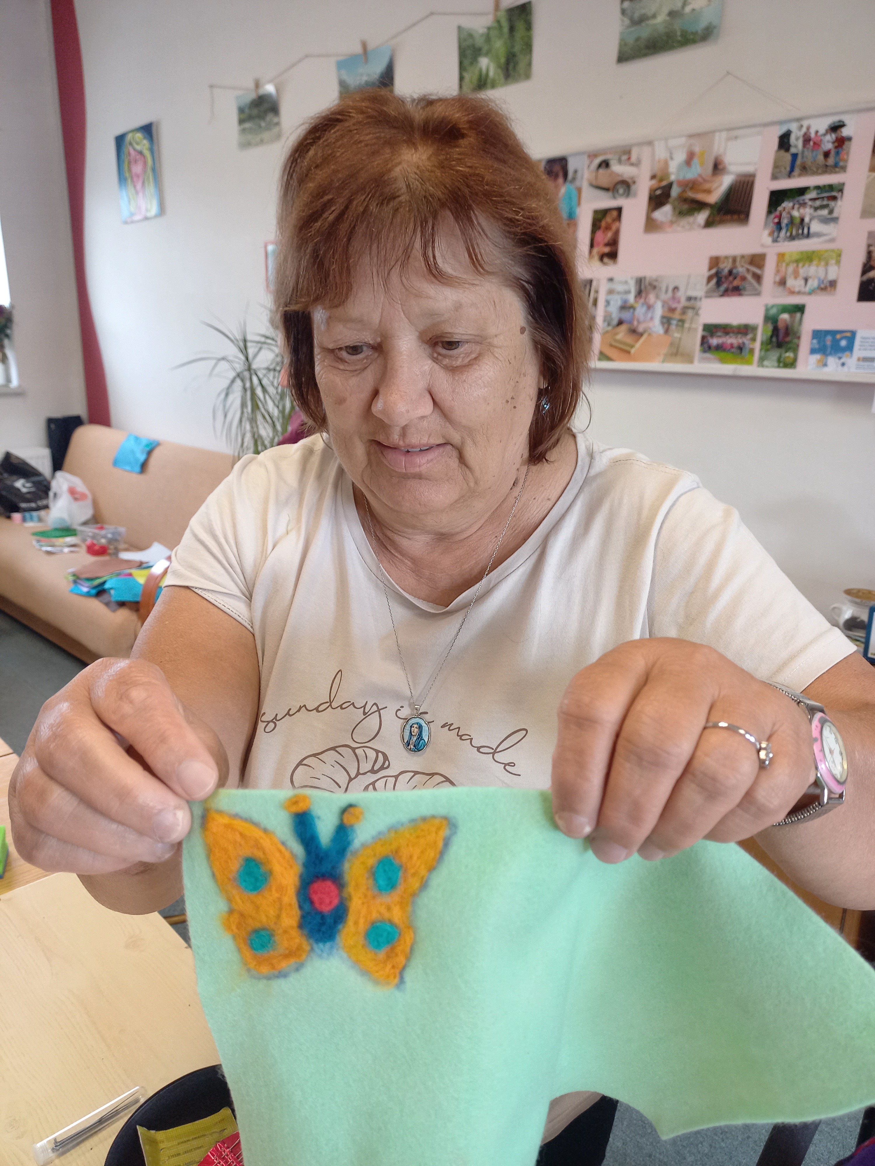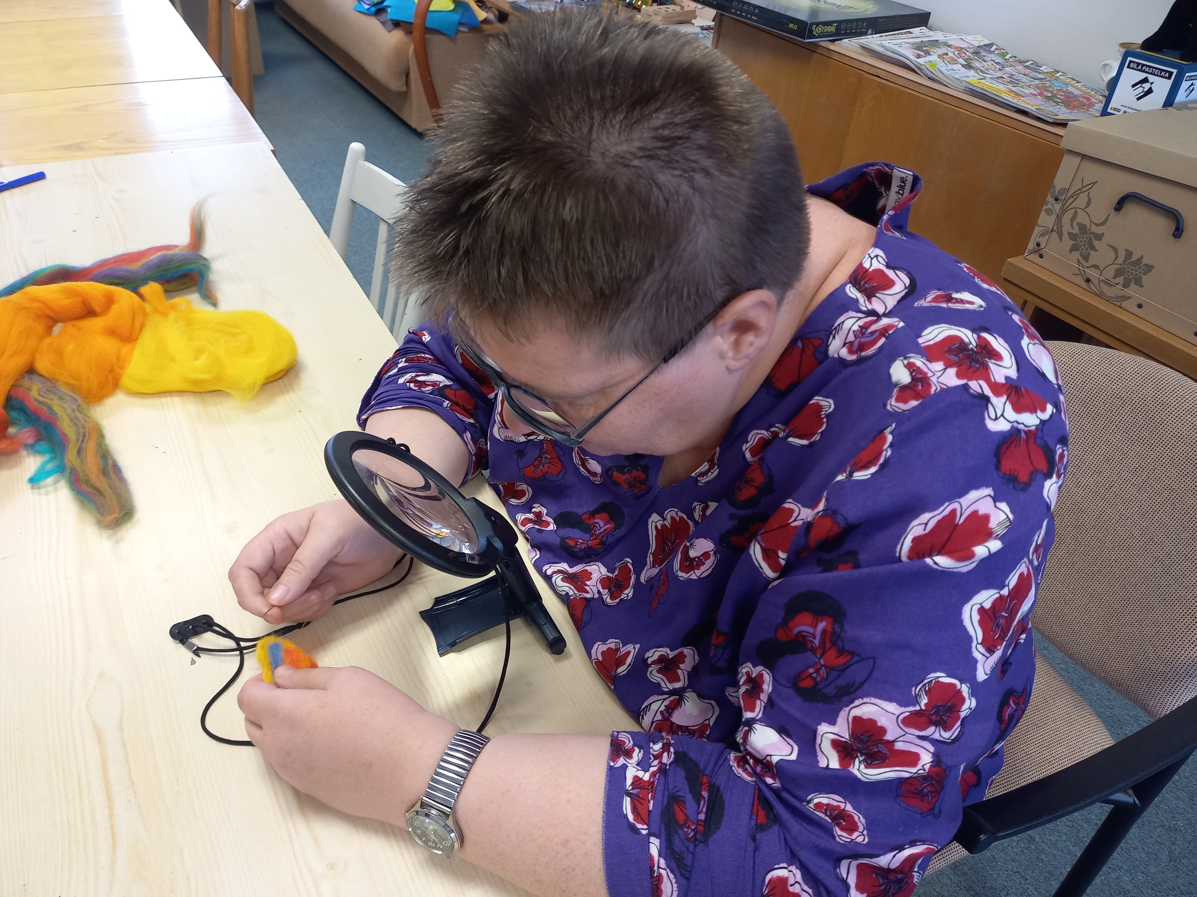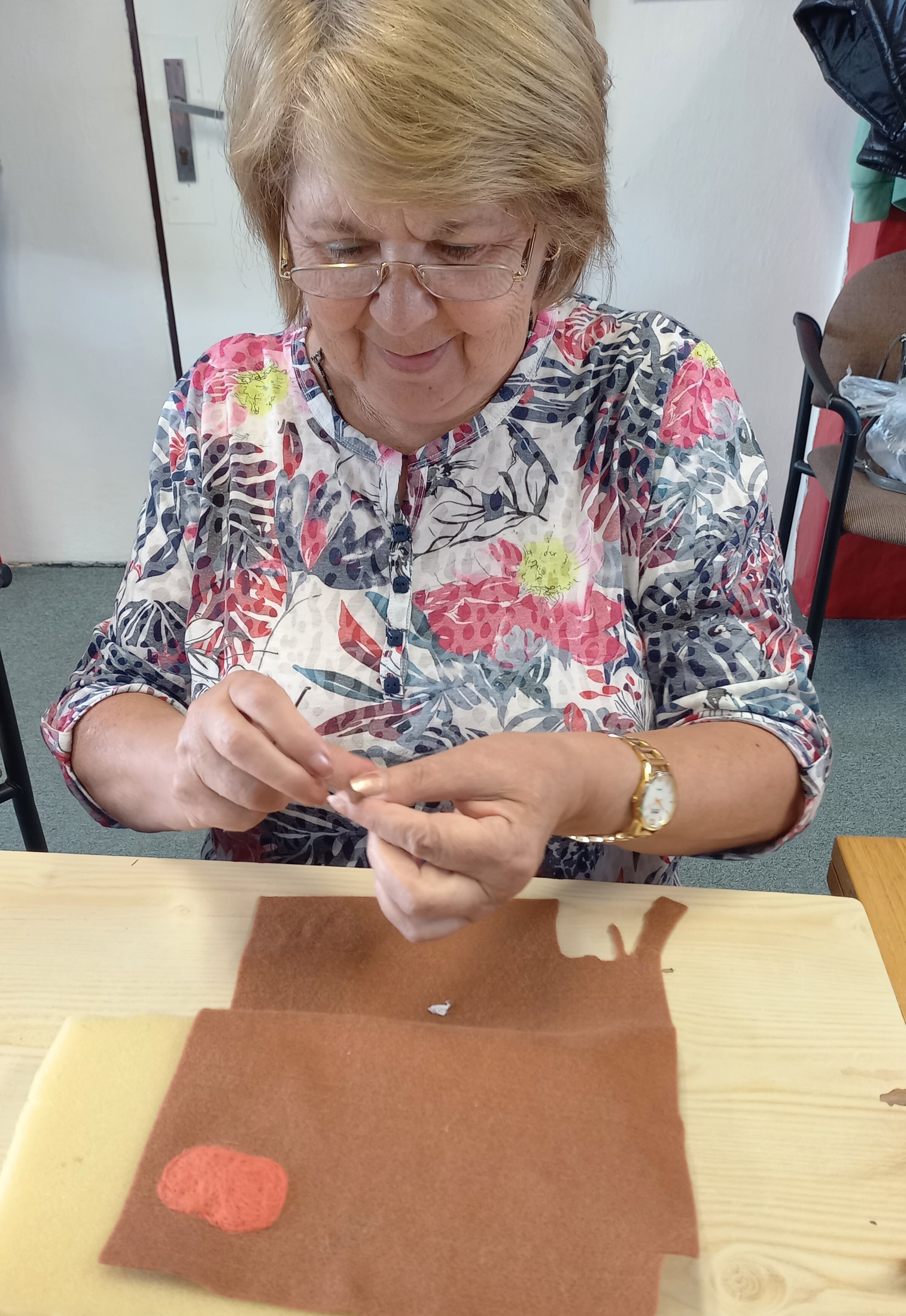 Na dveře už ťuká podzim a tak se naše aktivity pomalu stěhují spíše do prostor naší klubovny. A tak jsme se jednu středu sešly při tvorbě plstěných výrobků. Většina z nás si uplstila brož, ale také jsme na konci mohly obdivovat krásný náhrdelník jedné naší klientky – s jeho dokončením pomáhaly skoro všechny zúčastněné, takže byla docela legrace… 😊