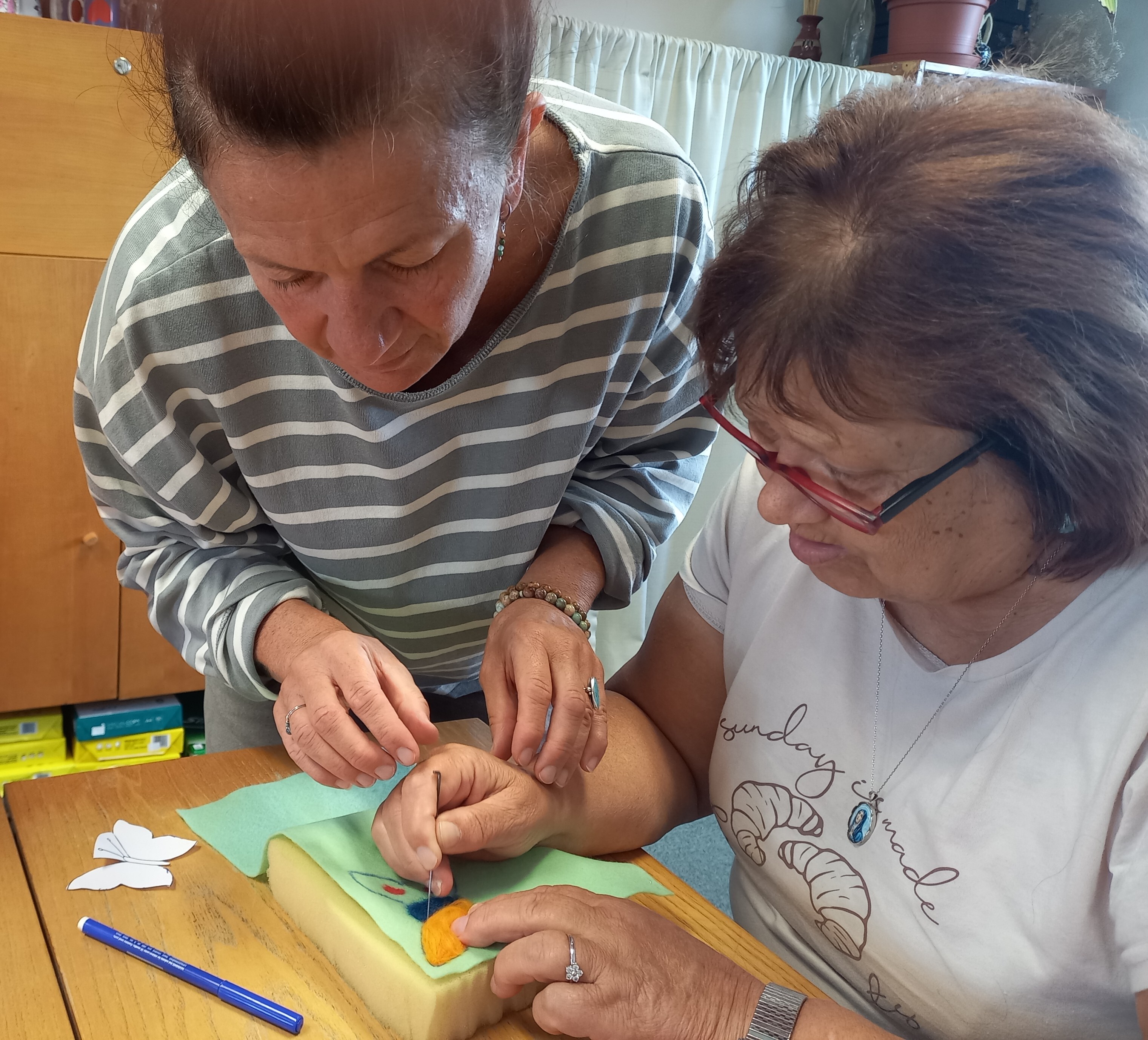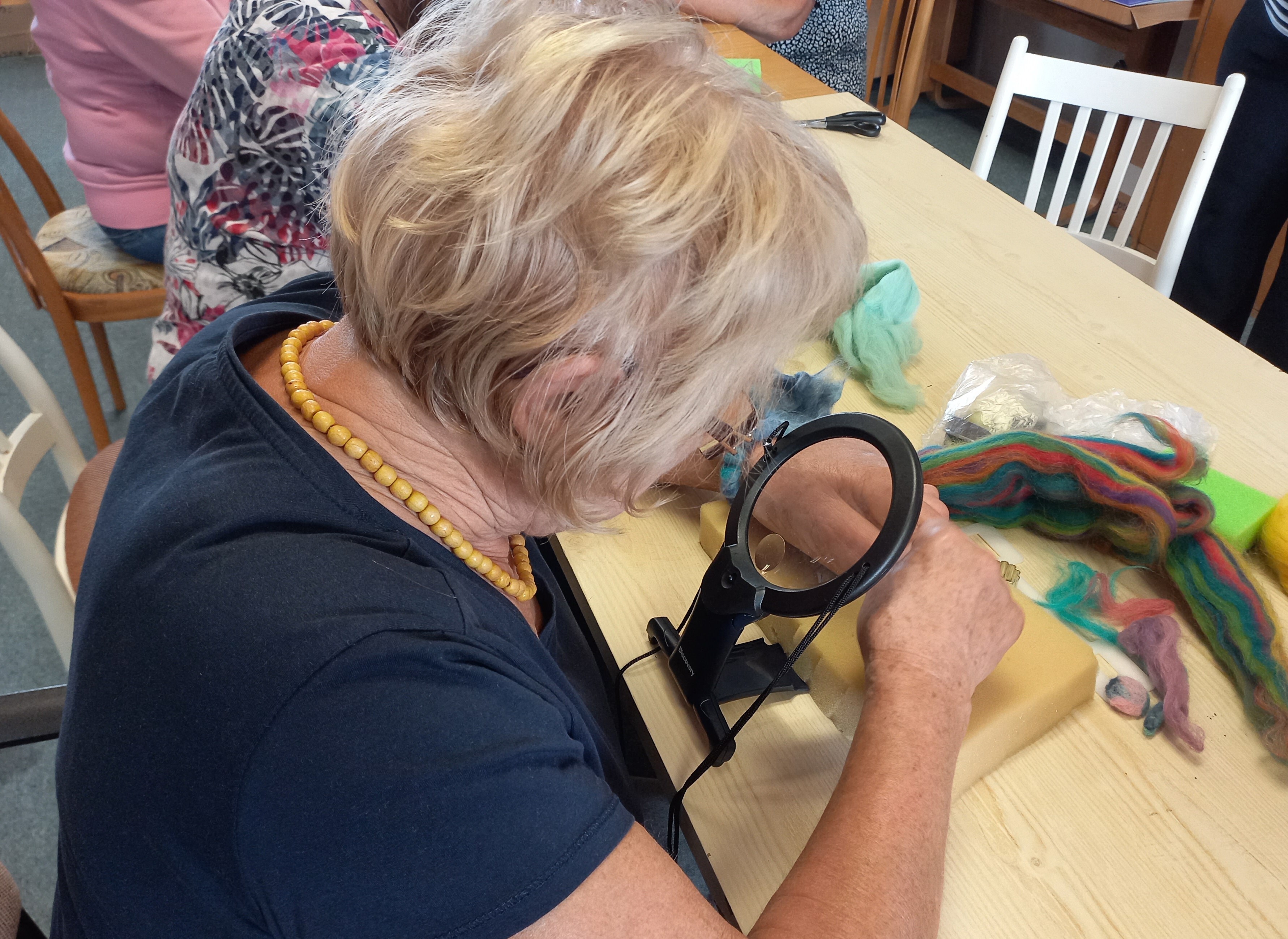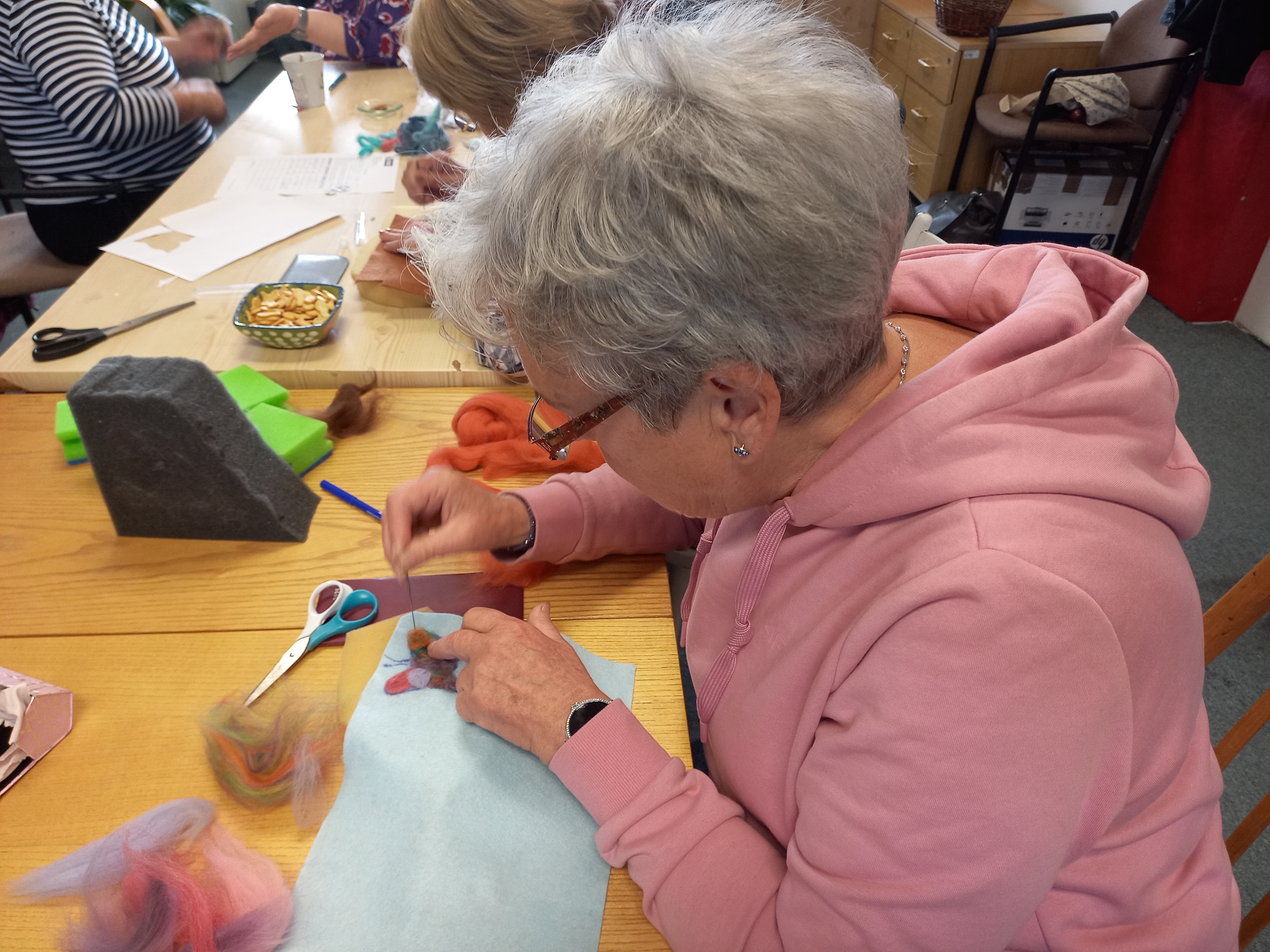 Na dveře už ťuká podzim a tak se naše aktivity pomalu stěhují spíše do prostor naší klubovny. A tak jsme se jednu středu sešly při tvorbě plstěných výrobků. Většina z nás si uplstila brož, ale také jsme na konci mohly obdivovat krásný náhrdelník jedné naší klientky – s jeho dokončením pomáhaly skoro všechny zúčastněné, takže byla docela legrace… 😊