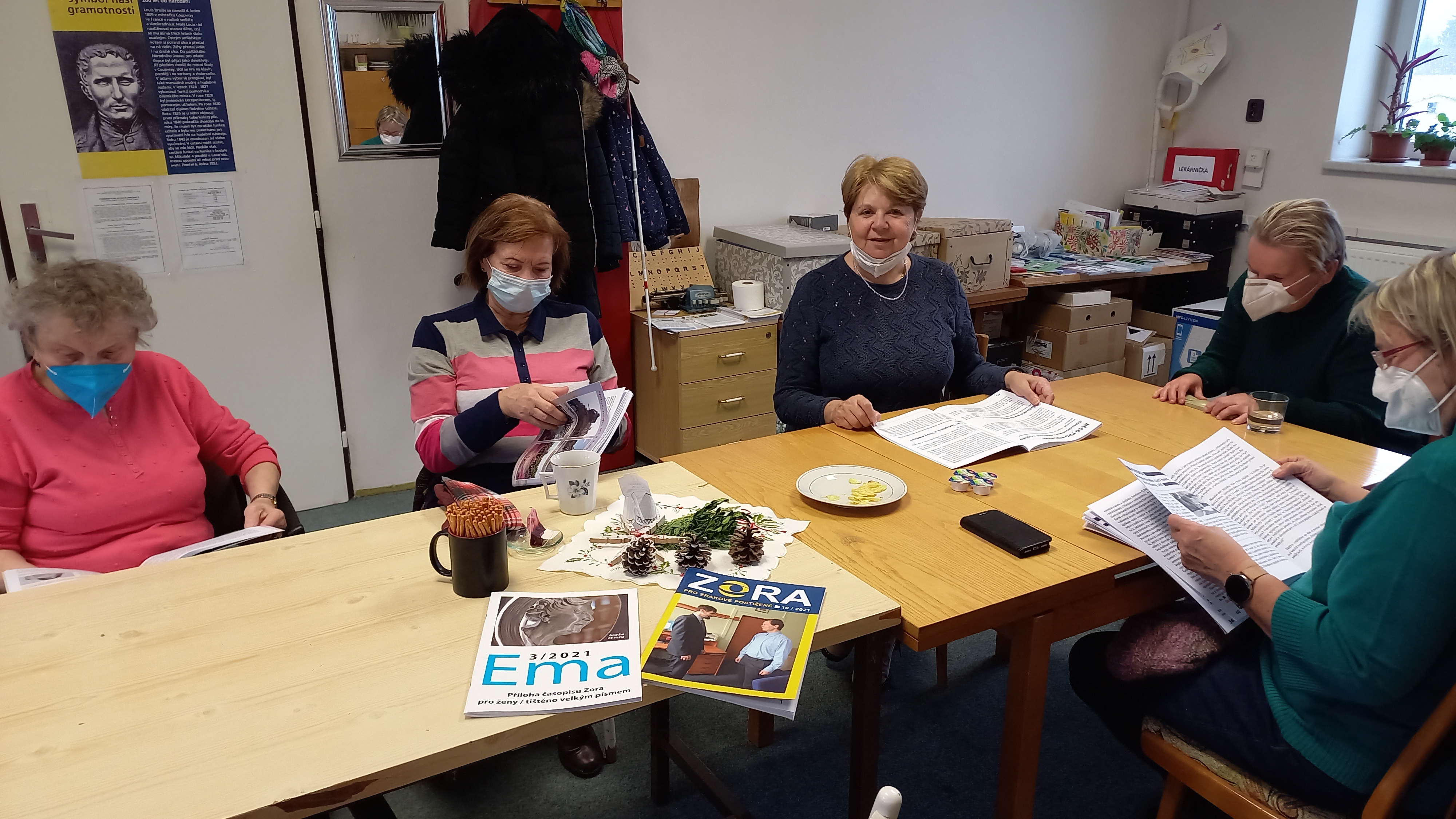 K 105. výročí naší Zory jsme si v rámci Týdne se Zorou udělali literární odpoledne. Všichni se mohli seznámit s jednotlivými časopisy, které Zora vydává, ať již ve zvětšeném černotisku, v bodovém písmu, či ve zvukovém formátu. Přečetli jsme si ukázky z různých tematických oblastí. Součástí Týdne se Zorou je i představení Zory v místní knihovně. K našemu koutku s časopisy přibude i přednáška o Zoře a celém našem spolku v dubnu 2022.