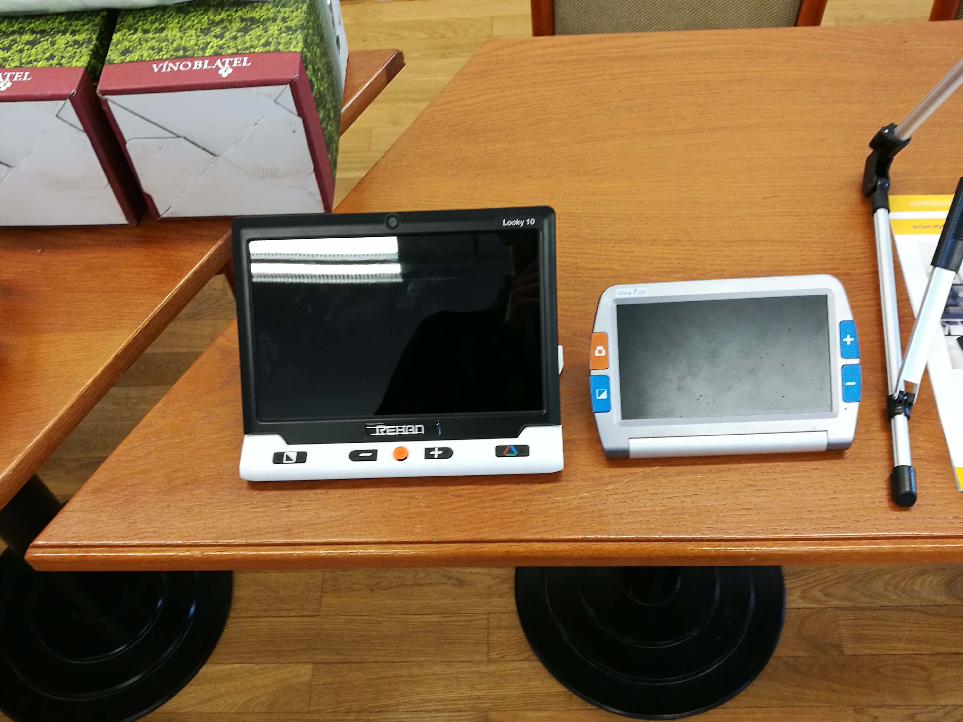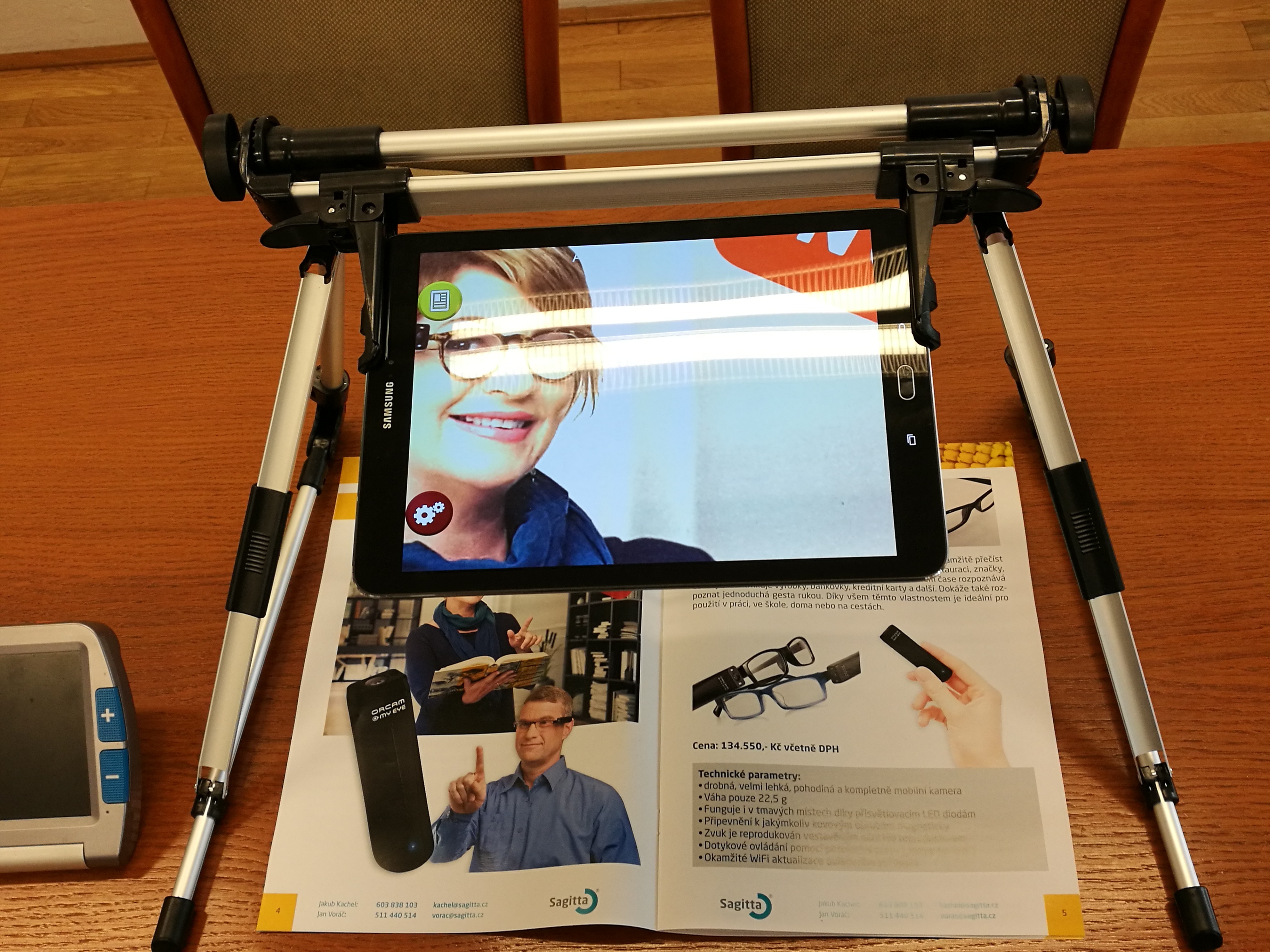 Tablet ve stojanu užívaný jako lupa a čtečka na předčítání textu