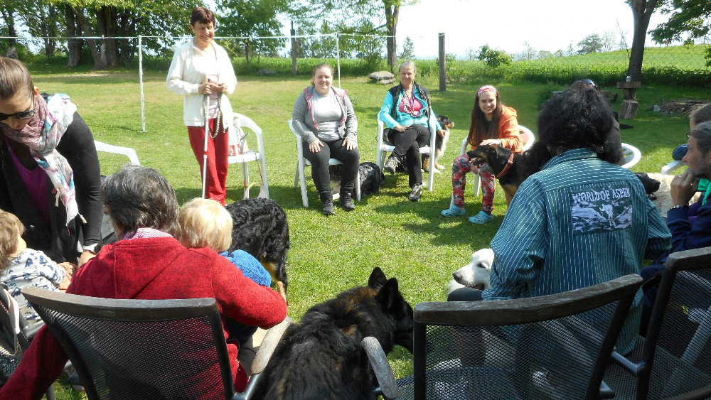 pomáhají naši pomocníci – vodicí psi. Seznámily jsme pozorné posluchače s péčí a výcvikem vodicích
