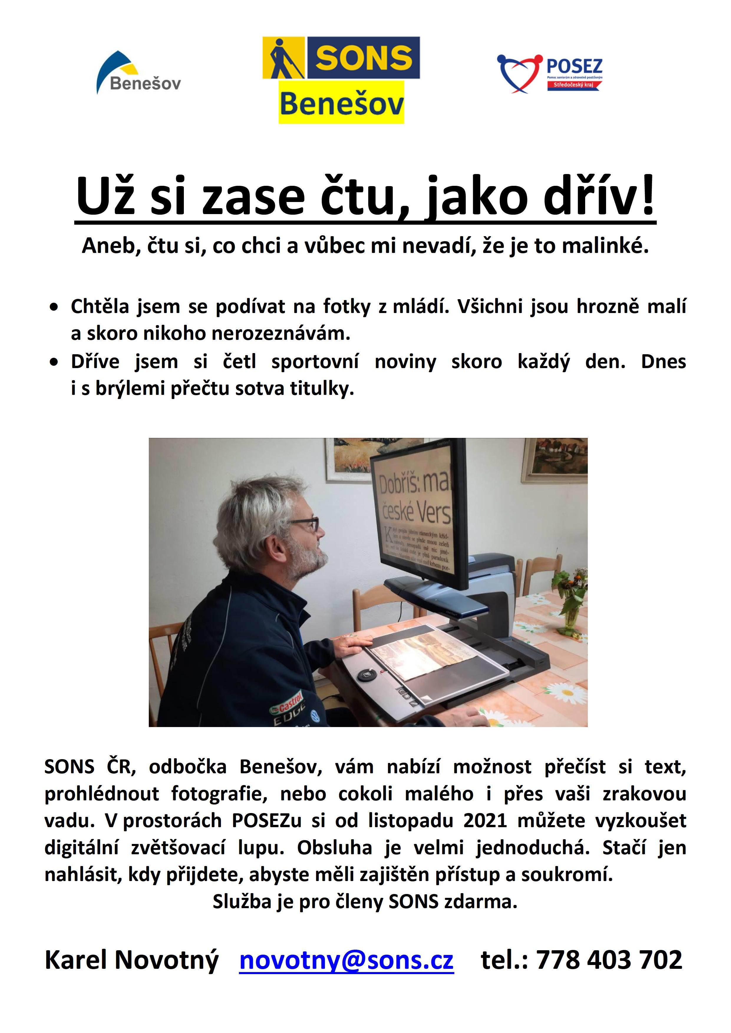 SONS ČR, odbočka Benešov, vám nabízí možnost přečíst si text, prohlédnout fotografie, nebo cokoli malého i přes vaši zrakovou vadu. V prostorách POSEZu si od listopadu 2021 můžete vyzkoušet digitální zvětšovací lupu. Obsluha je velmi jednoduchá. Stačí jen nahlásit, kdy přijdete, abyste měli zajištěn přístup a soukromí.