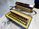 To, že harmonika se skládá z melodické a basové části, které jsou spojené měchem, ví snad každý. Ale my měli příležitost si detailně osahat jak kobylku s jazýčkama, které se nacházejí pod každou klávesou či knoflíkem, tak samostatný měch, jehož základem je tvrdý papír polepený textilem a rožky jsou zpevněny kůží a kovem, a taktéž rozebranou basovou mechaniku.