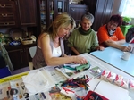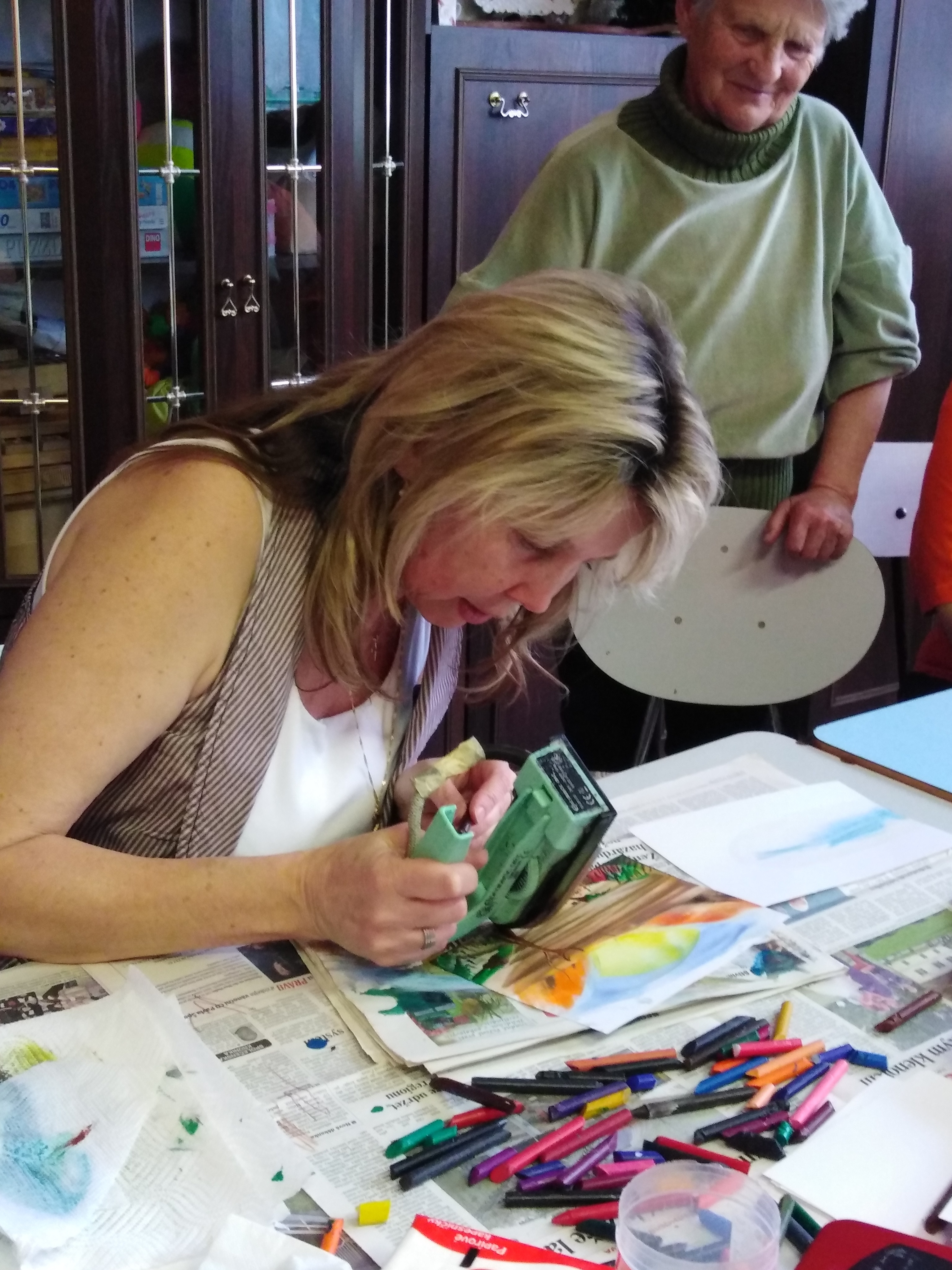 Následně jsme všichni měli možnost vytvořit si své enkaustické dílo. K dispozici byly 4 enkaustické žehličky, velký kufr plný různých odstínů voskovek, ubrousky, houbičky. Někdo měl odvahu tvořit zcela sám, jiný si nechal dopomoct malířkou. Všechna díla byla krásná, osobitá a jedinečná.