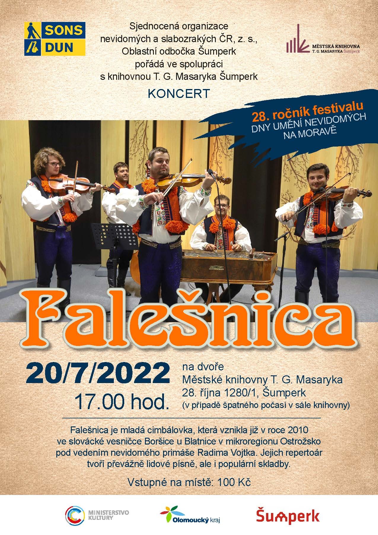 Ve středu 20. července 2022 již podruhé v Šumperku uvítáme cimbálovou muziku Falešnica, která přijala pozvání, vystoupí u příležitosti 28. ročníku festivalu Dny umění nevidomých na Moravě. Cimbálová muzika Falešnica zahraje na dvoře Městské knihovny T. G. Masaryka v Šumperku v 17 hodin. V případě špatného počasí pak v sálu této knihovny. Vstupné budeme vybírat na místě ve výši 100 Kč.