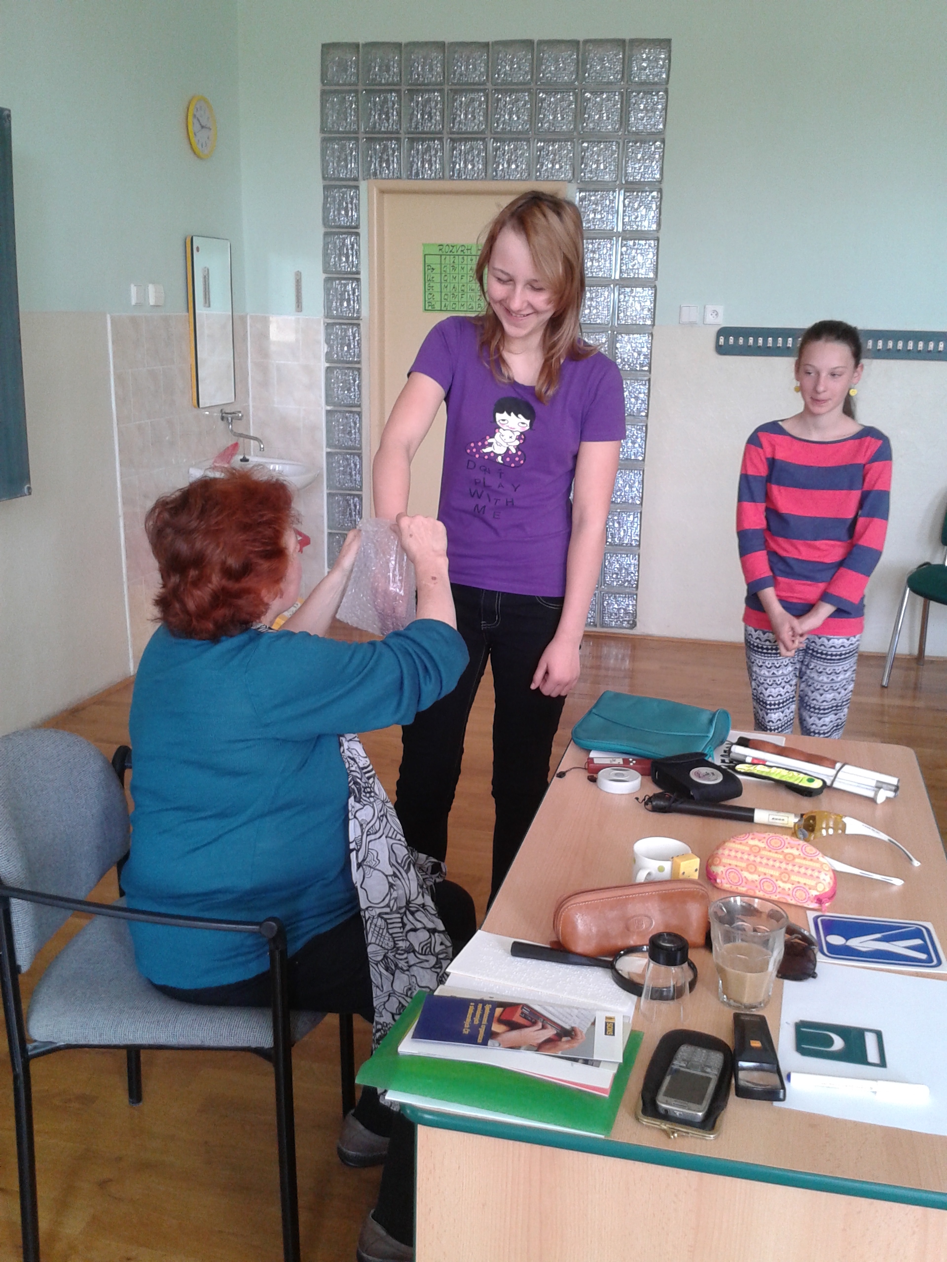Po stručném představení SONS a mé osoby jsme se věnovali problematice osob se zrakovým znevýhodněním teoreticky. Hovořili jsme o možnostech částečné náhrady zraku jinými lidskými smysly, o institucích, které pomáhají zvládat komplikace při zhoršení či ztrátě zraku, o vodících psech atd. Všechny zaujala možnost poslechu zvukových knih z kazet, CD a flash disků a nabídka periodik z vydavatelství Zora. Děti si vyzkoušely podpisy poslepu a za pomoci šablonky, hmatem vyhledávaly mince různé hodnoty a v taštičce identifikovaly drobné předměty- klíč, zátku, kolíček na prádlo, ořech, kaštan, figurku slona, ořezávátko, zvoneček a jiné. Seznámily se s tiskem Braillovy abecedy a osahaly papír s bodovým písmem. Úspěch měly mluvící multifunkční hodinky a mluvík, různé druhy lup, v praxi předvedený indikátor hladiny, monokulár, brýle s rozjasňujícím filtrem a ozvučený mobilní telefon.