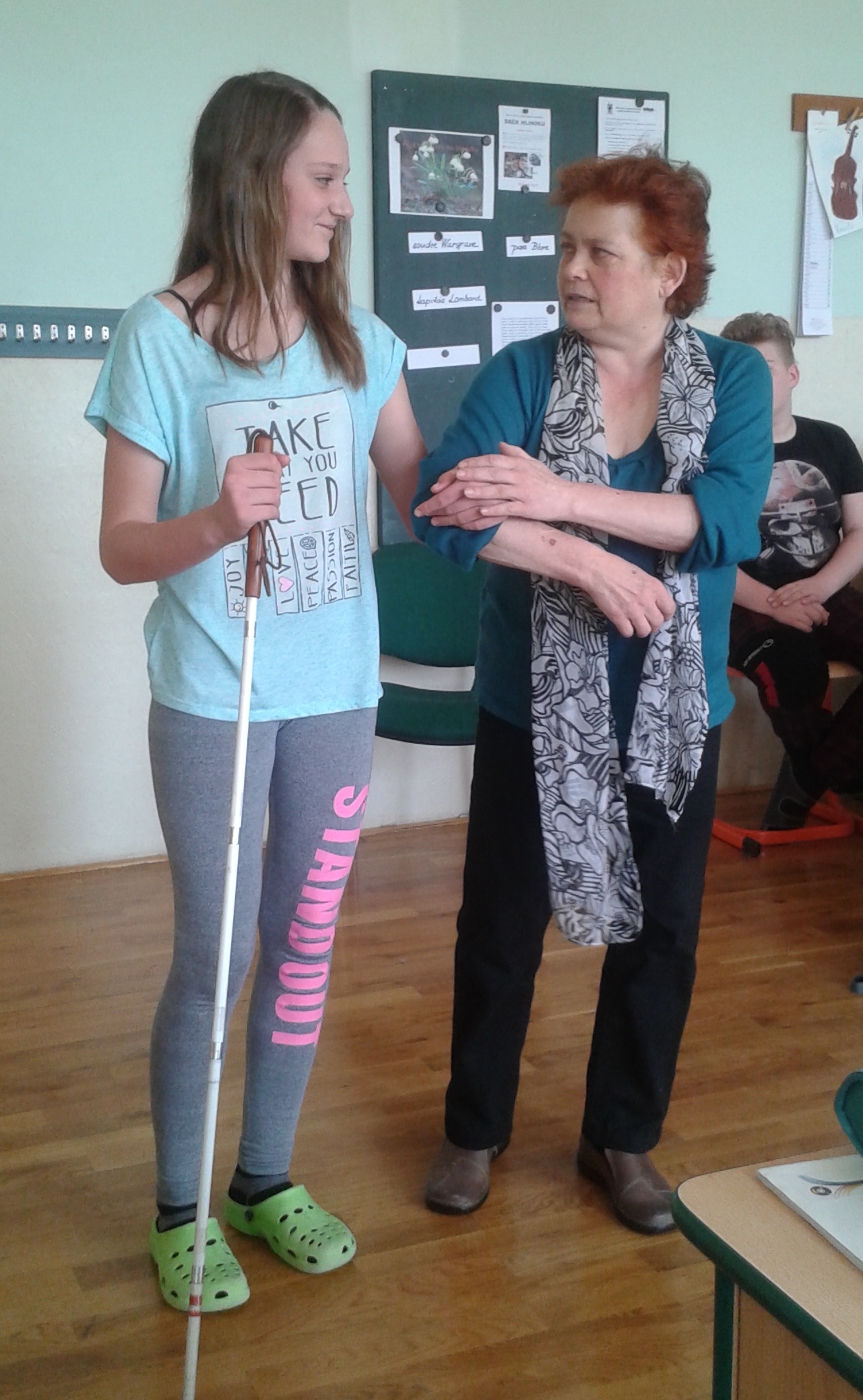 Žáci se zajímali o problémy, s jakými se setkáváme, jak to či ono zvládáme, co nám působí nepříjemnosti. Zkoušeli jsme, jak konkrétně pomáhat při přecházení silnice, jak nevidomého oslovit a jak se chovat, jaký studijní obor se věnuje práci pro zrakově postižené atd. Poněkud hlasitější způsob, kterým si zájemci zkoušeli orientaci a chůzi s bílou holí pravděpodobně nikoho nepohoršoval, protože nás nikdo „umravnit“ nepřišel, naopak přítomná paní učitelka se do programu aktivně zapojovala.