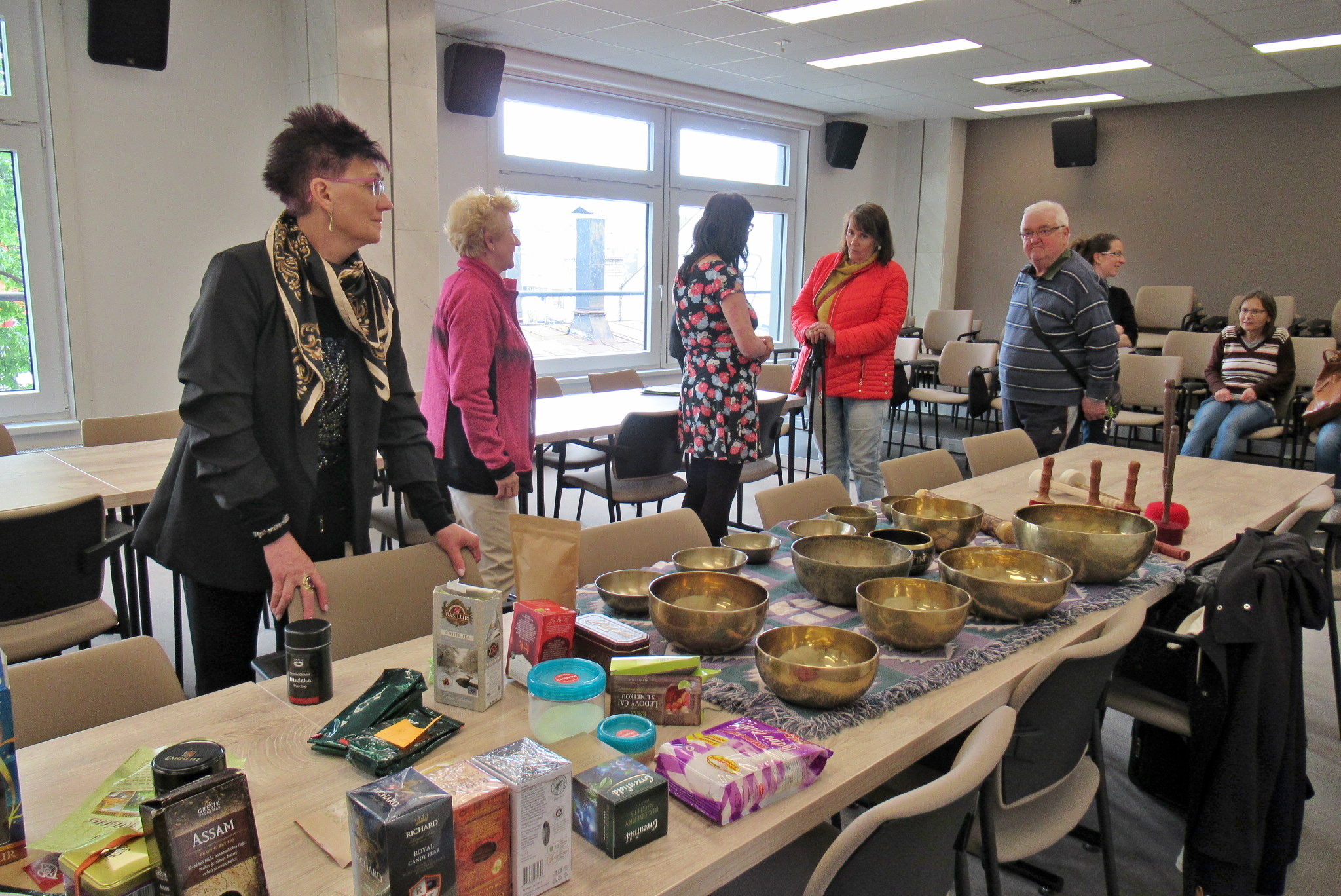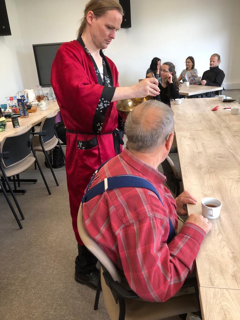 V průběhu zkoušení uvedených artefaktů, probíhala i ochutnávka 9 druhů čajů, které připravoval učitel hudby s pomocí asistentek a paní ředitelky knihovny.