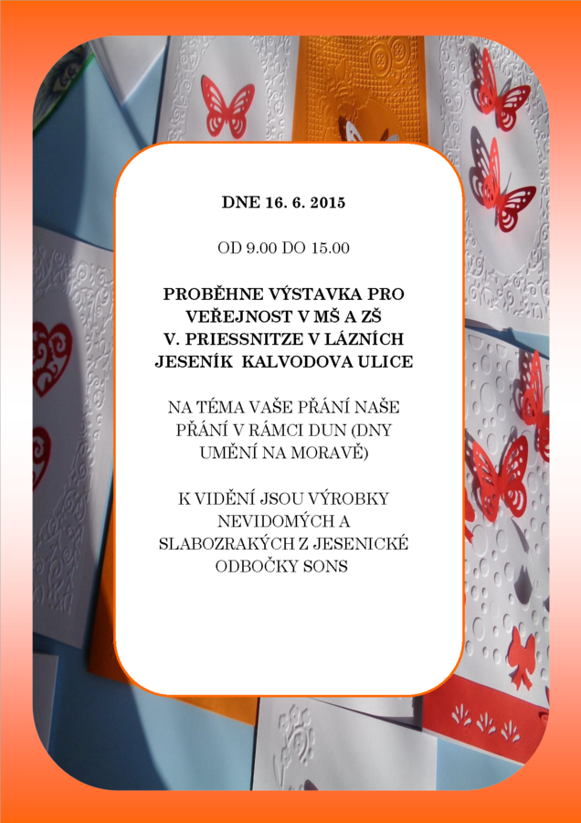 PROBĚHla VÝSTAVKA PRO VEŘEJNOST V MŠ A ZŠ V. PRIESSNITZE V LÁZNÍCH JESENÍK KALVODOVA ULICE NA TÉMA VAŠE PŘÁNÍ NAŠE PŘÁNÍ V RÁMCI DUN (DNY UMĚNÍ NA MORAVĚ) K VIDĚNÍ BYLY VÝROBKY NEVIDOMÝCH A SLABOZRAKÝCH Z JESENICKÉ ODBOČKY SONS