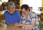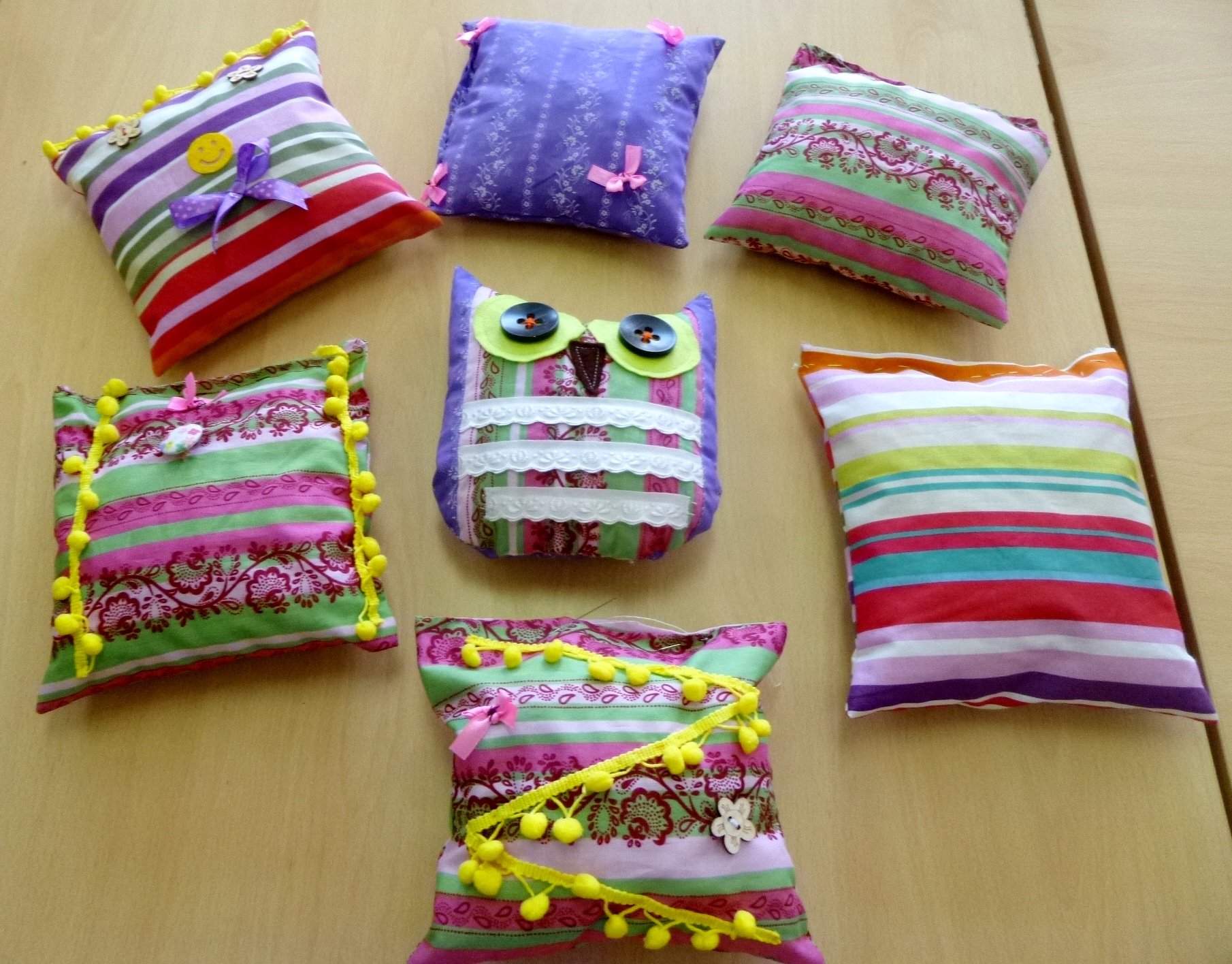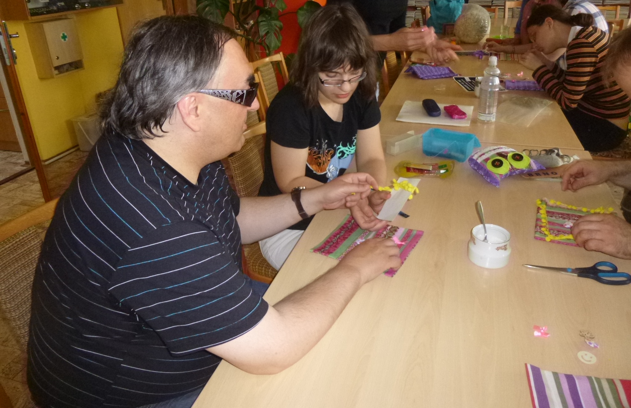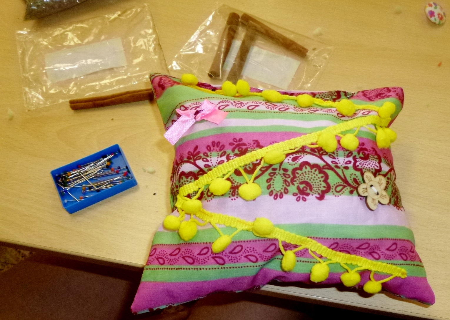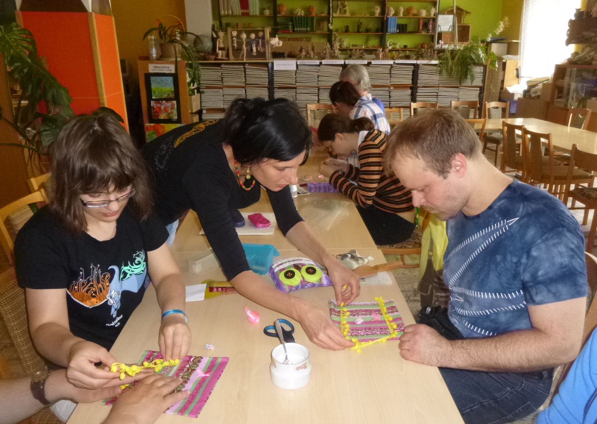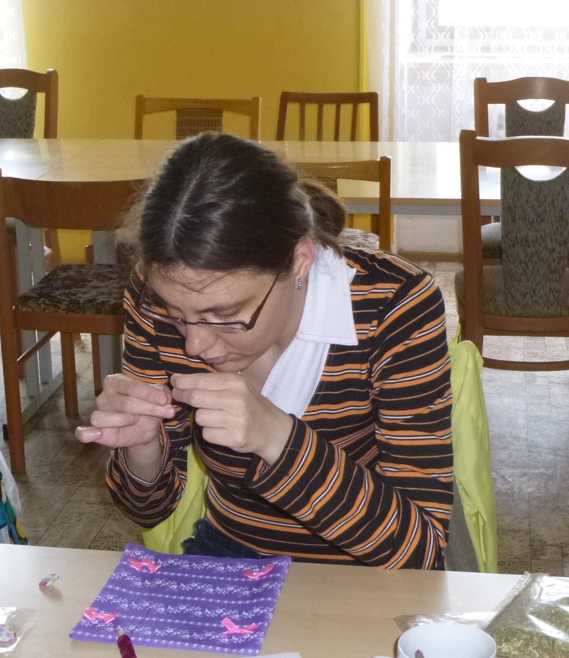 Činnost naší výtvarné dílny je rozmanitá. Pravidelně se střídá práce s keramickou hlínou a podruhé pak činnosti, ve kterých jsou mnohdy zakomponovány sebeoslužné prvky. Protentokrát naší členové vyráběli bylinkové polštářky. Dobrovolnice polotovar stávajícího polštářku připravila doma a úkolem členů pak bylo jej naplnit voňavou směsí bylinek a výplně, sešít a vkusně ozdobit. Zcela nevidomí měli každý svého asistenta, který je vedl, radil. A tak vznikly krásné, voňavé, líbezné polštářky.