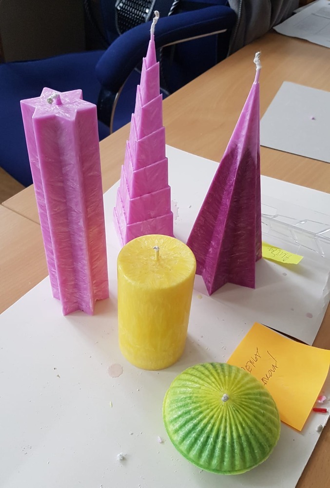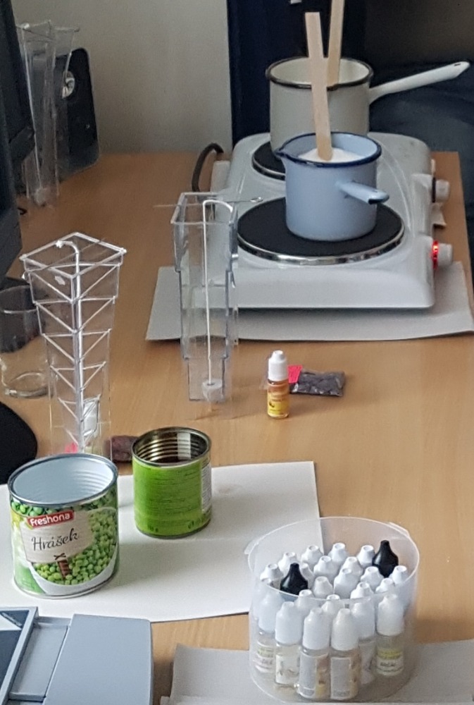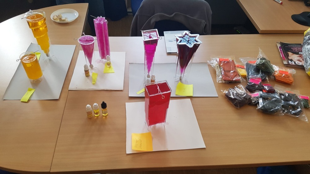 My jsme použili krystalický palmový vosk a asi sedm různých forem. Barvilo se světlými odstíny. Náhoda tomu chtěla, že se všichni z cca deseti účastníků shodla na tom, že nastal čas teplých odstínů. Mezi vůněmi vedly tóny ovocné a květinové, které se k oranžovým, žlutým a růžovým barvám skvěle hodily.