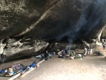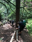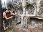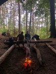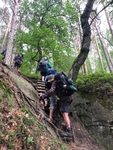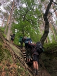 Autobusem se přesunujeme z Prahy do Zakšína, kde se přidává Tomáš se synem a Zbyněk s pejskem. Po pár metrech chůze se nám do cesty staví hospoda se stájemi, ubytováním a občerstvením. Dáváme pivo a řeč a konečně se seznamujeme se všemi účastníky zájezdu, kteří jsou vzorní a vrací podšálky. Zvolna se vciťujeme do světa nevidících kamarádů. Po krátkém posezení u zrzavého moku se vydáváme na další cestu směr skalní vyhlídka Čap s pozůstatky středověkého skalního hradu. Cestou se zapojujeme jako průvodci nevidících kamarádů a učíme se, jak je co nejlépe navigovat v terénu. Jako první v peletonu byl celou cestu na Čap Mirek s Markem, při svižné chůzi si ještě stačili povídat o všem možném. Kromě překážek na cestě průvodce popisoval Markovi i krajinu, kterou procházeli. Ze zadní části peletonu se ozýval smích, hovor a zpěv, takže cesta hezky ubíhala všem. Na Čapu se všichni kochali výhledem, připíjelo se a fotografovalo. Zejména Marek si pochvaloval krásný výhled a čerstvý vzduch. Následuje asi nejnáročnější část čundru, a to sestup z Čapu, místem zvaným Kamenné schody, kde jsou žebříky, zábradlíčka a terén je obtížný i pro nehandicapované. Nejlépe to zvládala Zbyňkova čtyřnohá kamarádka. Naši 3 kluci to dávají s přehledem a humorem, i když dole přiznávají, že to pro ně byl adrenalin. Dál pochodujeme lesními cestami a chodníčky, lemovanými borůvčím, každý se svým těžkým batohem, až na místo našeho utáboření pod obrovským převisem, které se jmenuje Tisícový kámen. V nohou máme asi 12 kilometrů. Chystáme si spaní, vaří se kotlíkový guláš, do kterého každý přispěl bramborami, slaninou, česnekem, špekáčky, paprikou. Jen na majoránsku se zapomnělo, ale i tak byl společný výtvor vynikající chuti. Hudební kytarovou celovečerní vložku měl na starosti Vojta, my ostatní pomáháme se zpěvem. Noc proběhla v klidu, nikdo se neztratil ani nebyl rozsápán medvědem. Ten dal přednost borůvkám.