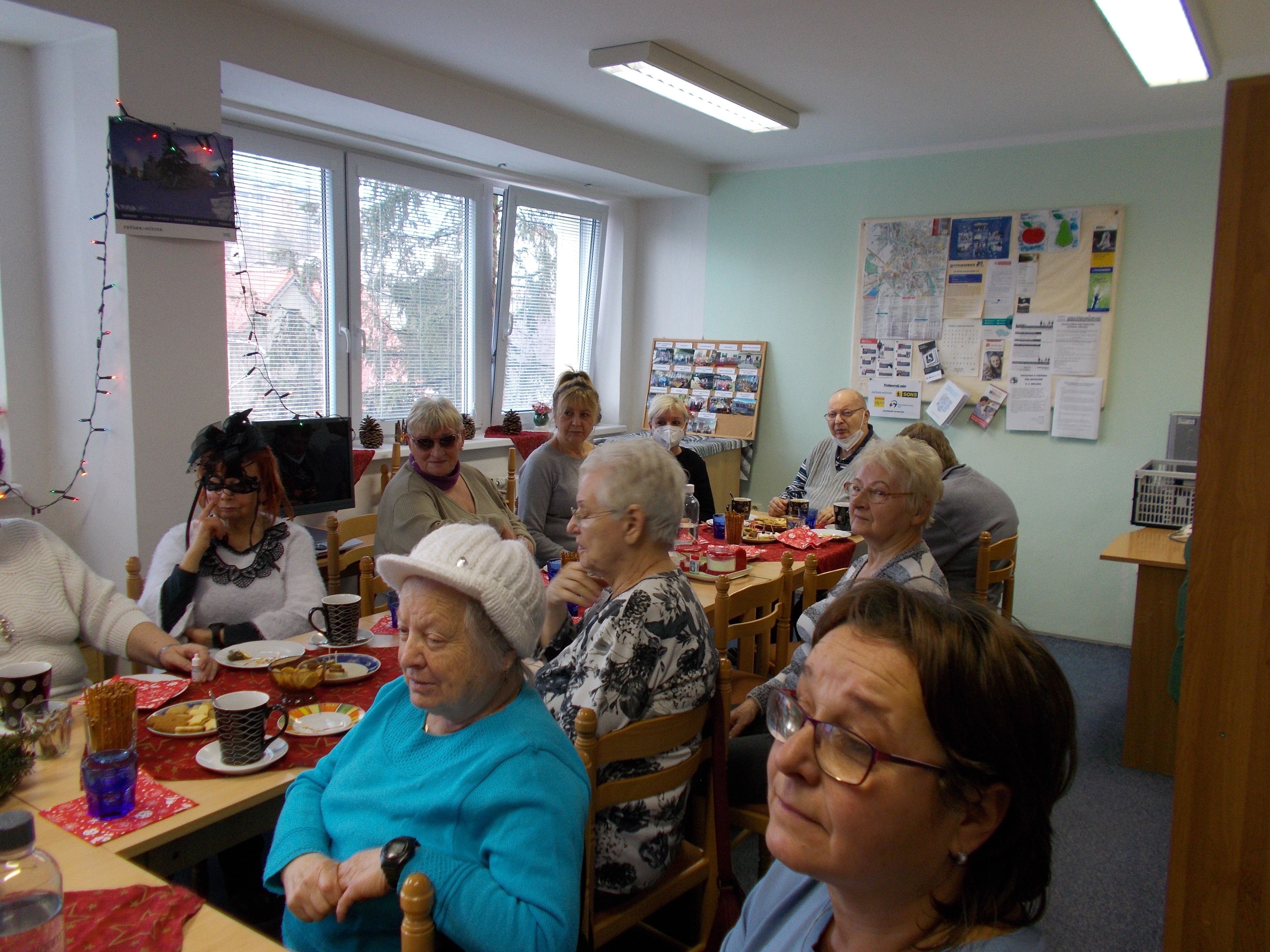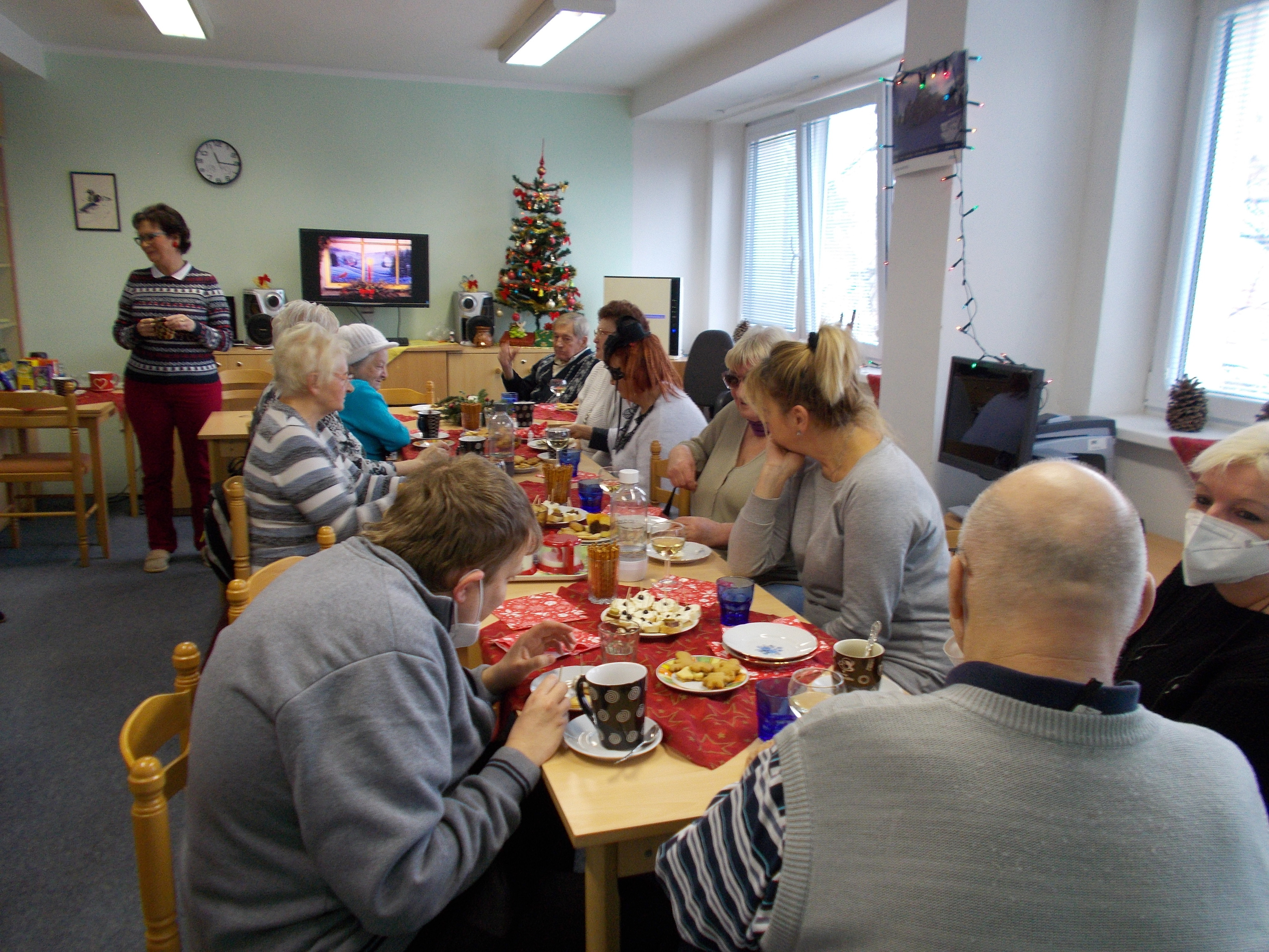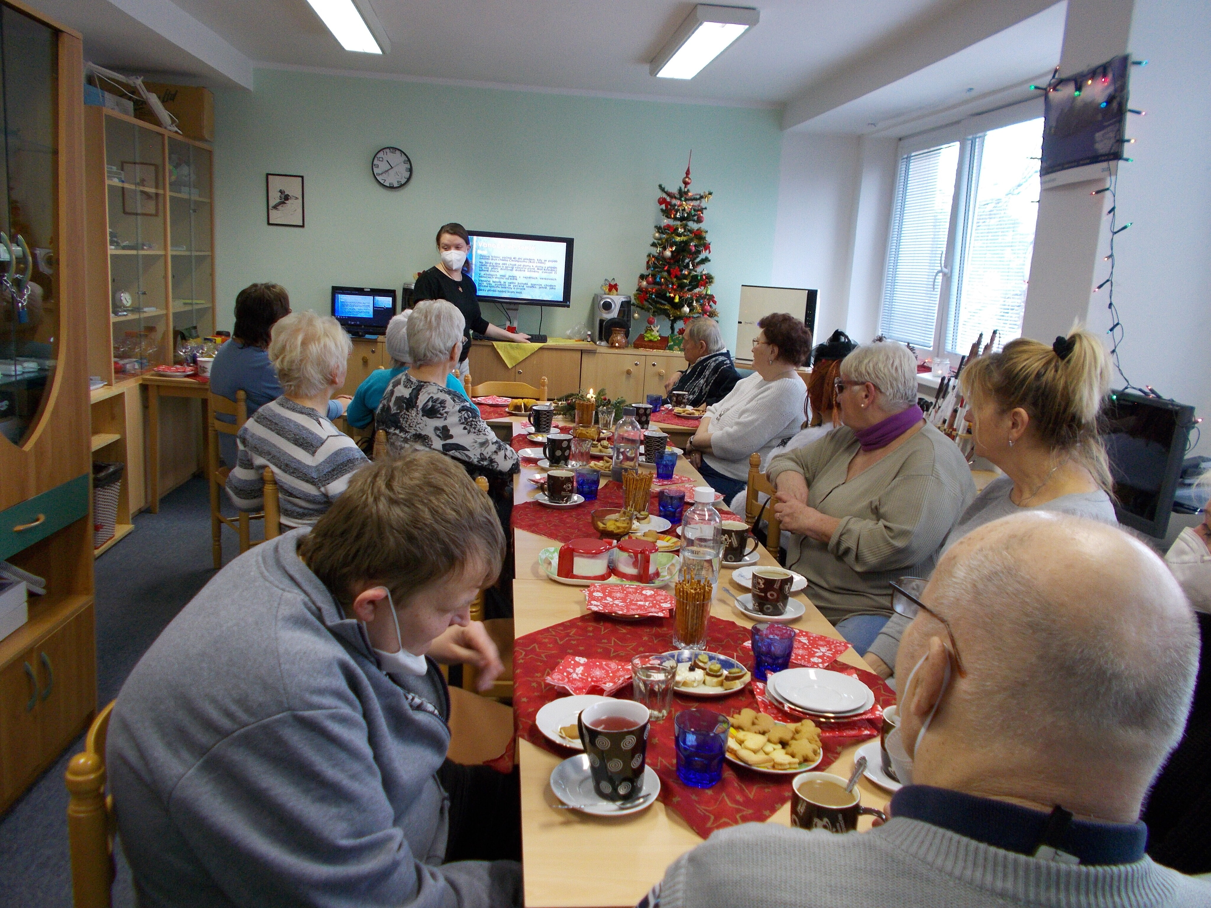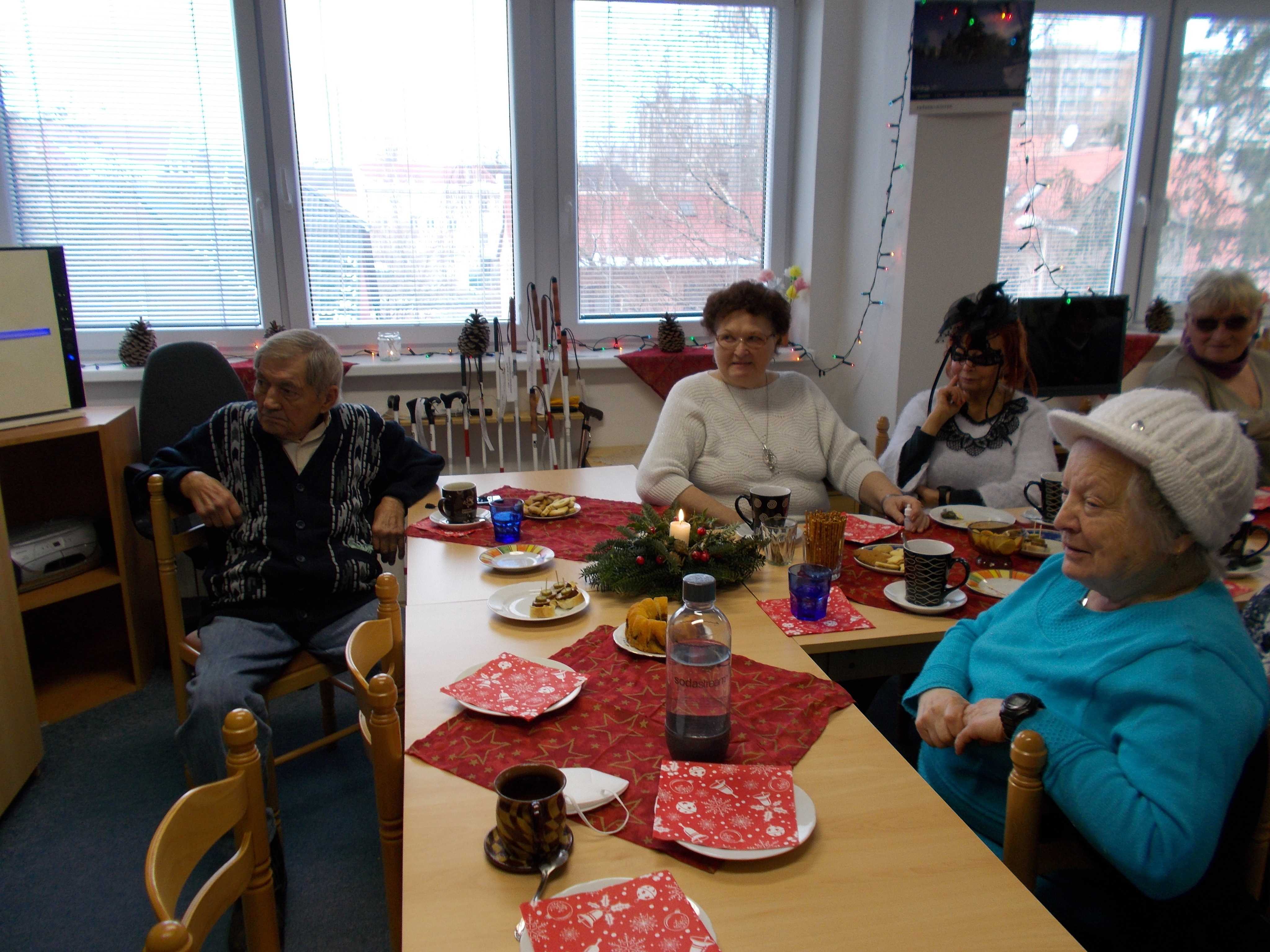 Dne 14. 12. proběhla na naší odbočce připravovaná akce pro uživatele s názvem "vánoční posezení". Pro uživatele jsme vánočně vyzdobily klubovnu a nachystaly malé pohoštění. V rámci posezení jsem si pro uživatele připravily prezentaci na téma Vánoce ve světě. Po prezentaci došlo i na diskuzi, jak Vánoce slaví naši uživatelé. Společně jsme se naladili na vánoční čas. Uživatele měli možnost nejen se něco nového dozvědět o Vánocích, ale setkat se opět se známými a novými lidmi se stejným zdravotním postižením.