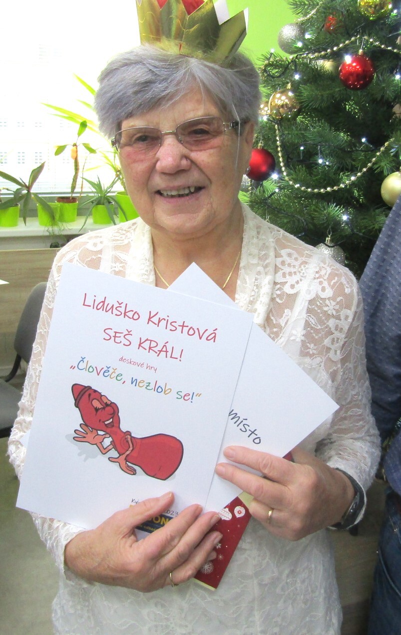 Zároveň odtajníme výsledky čtyřkolové společenské deskové hry „Člověče nezlob se!“, která probíhá už někdy od listopadu a díky tomu, že hrací plato je upraveno i pro nevidomé, může hrát každý sám za sebe dle našeho už léty propracovaného systému. Každé družstvo je po zásluze odměněno vánoční kolekcí a diplomem. Nezapomínáme na vyhodnocení toho hráče, který nahrál nejvíce bodů, a tak získává titul krále a obdrží jednu náhražku korunovačních klenot. Letos se jím stala liduška Kristová.