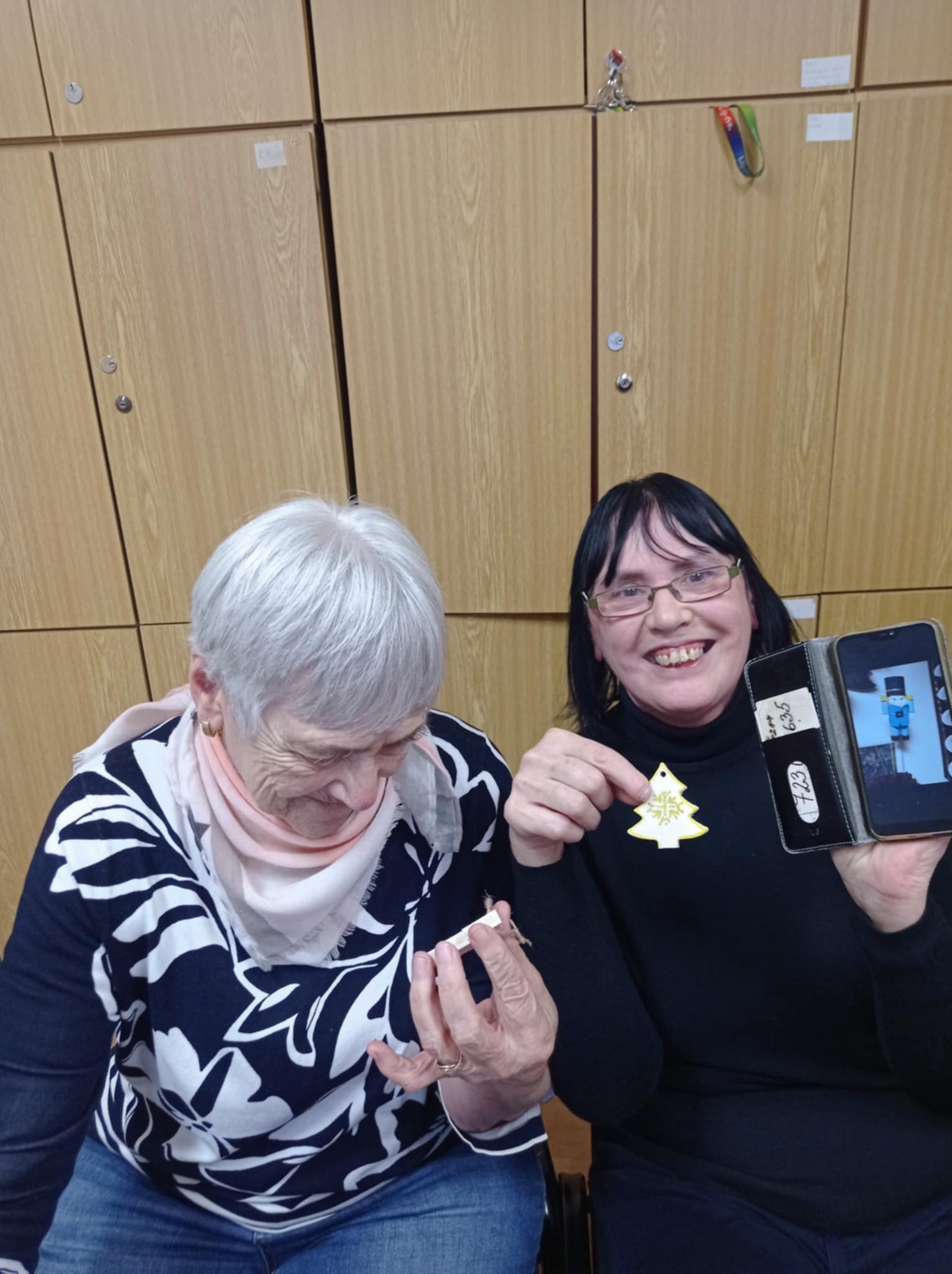 Na jedné z předvánočních schůzek jsme zdobili vánoční ozdoby. Jednalo se o dřevěné tvary na provázku nastříkané bílým akrylem. Každý si doplnil ozdobu zlatou fixou dle své fantazie.