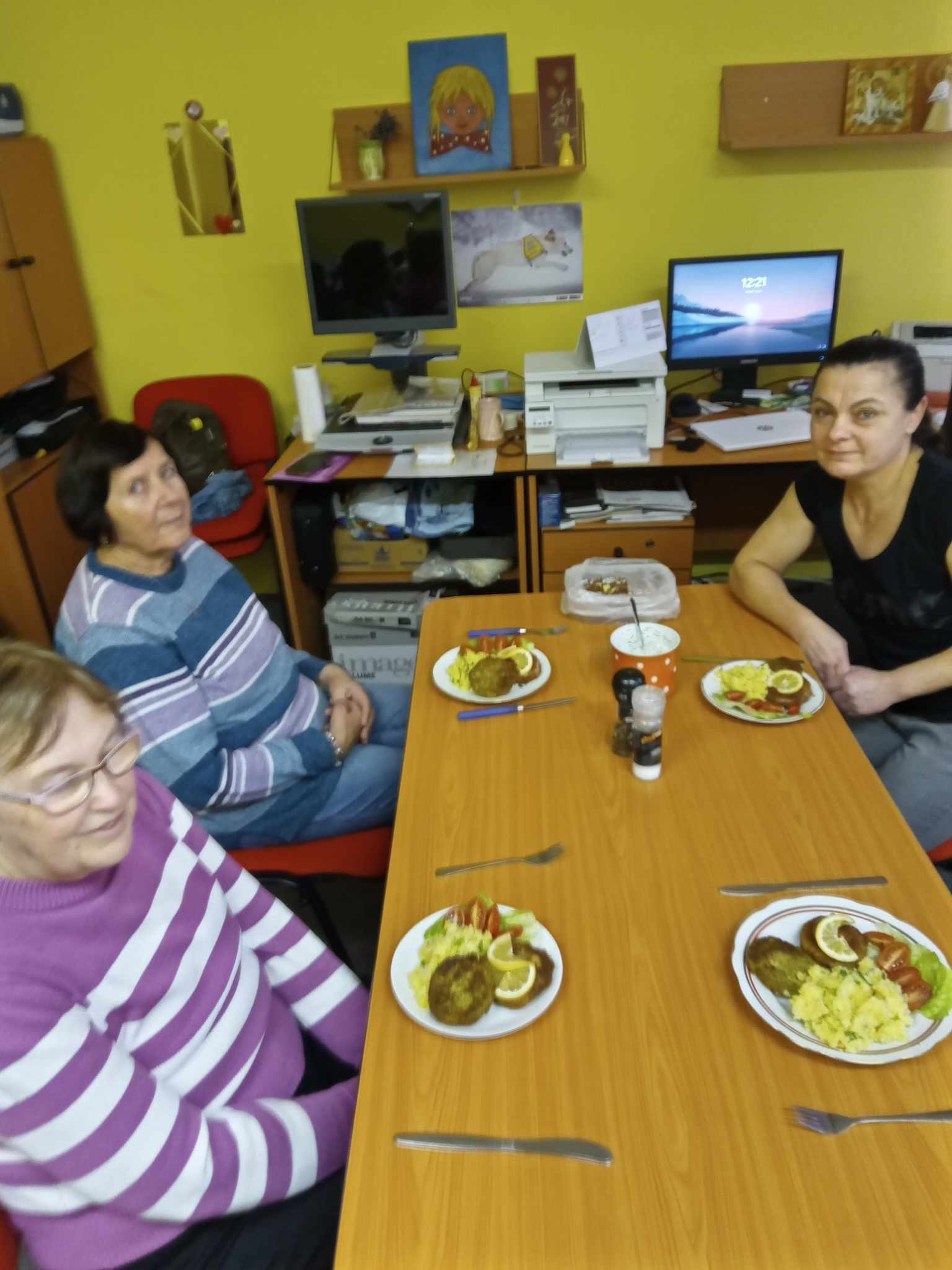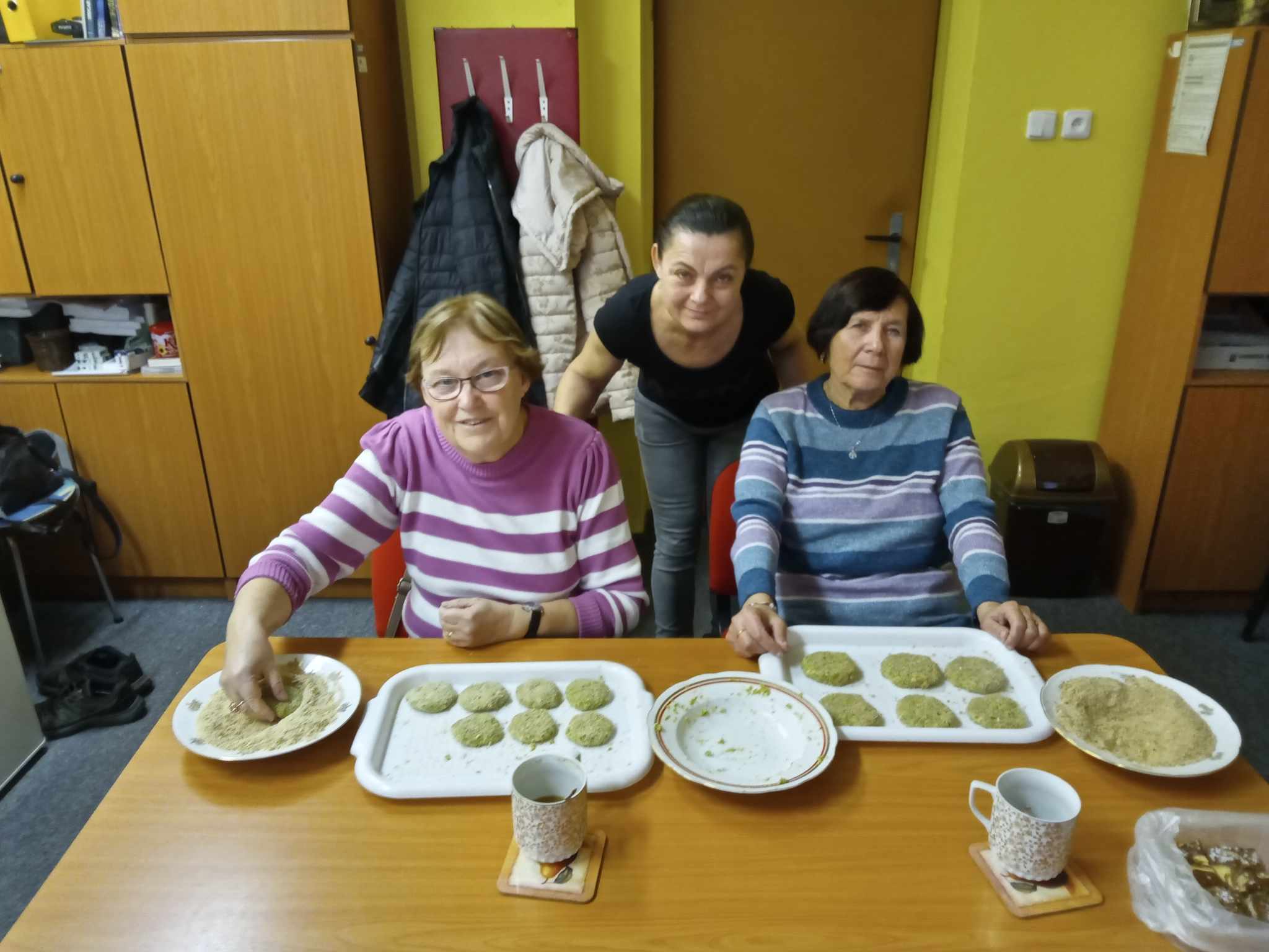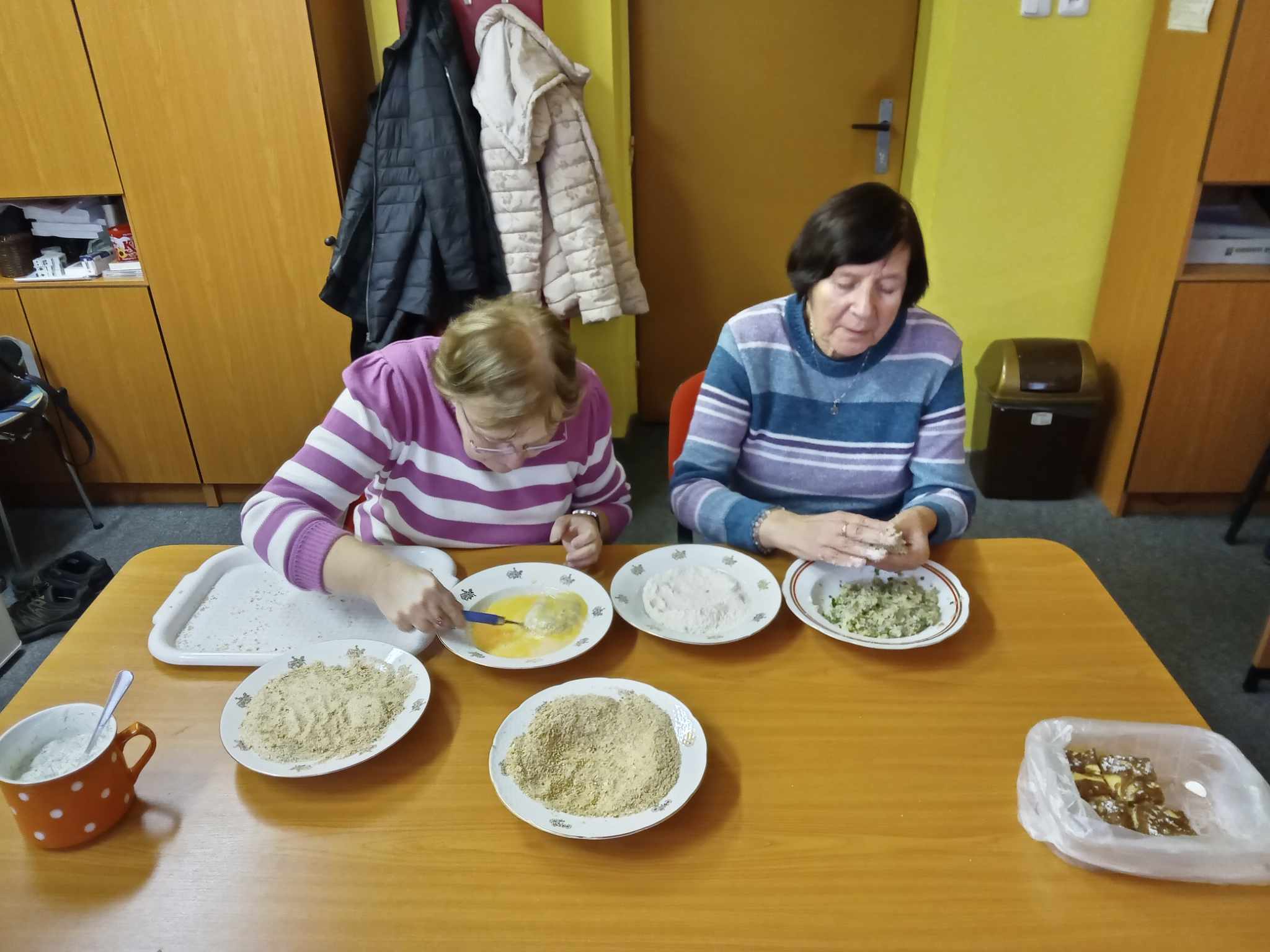 Tentokrát jsme si s Eliškou připravili a uvařili rybí karbanátky, k nim jako variantu i brokolicové, se šťouchanými brambory. Dámy si procvičily motoriku při loupání brambor, tvarovaní a obalování karbanátků. U toho si jako vždy příjemně popovídaly u kávy. Oběd byl výborný a vaření opět sklidilo úspěch.