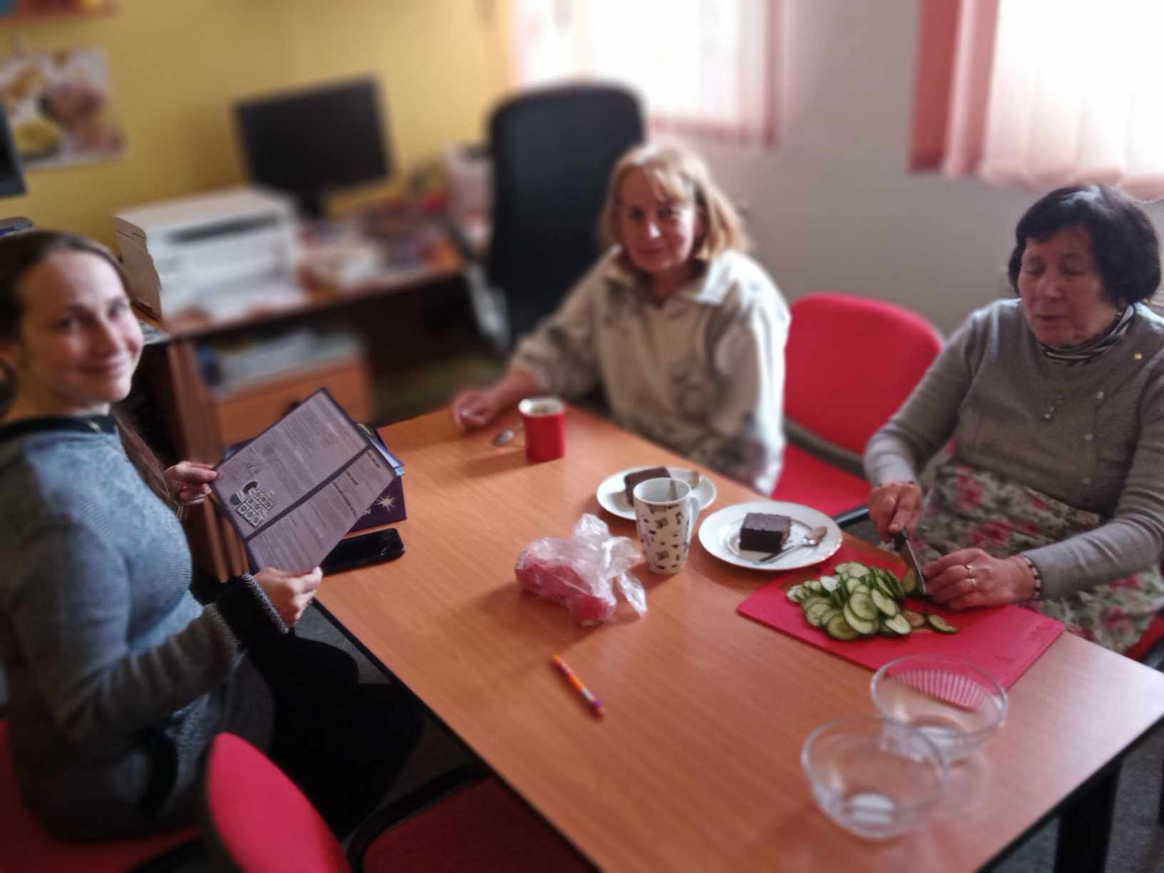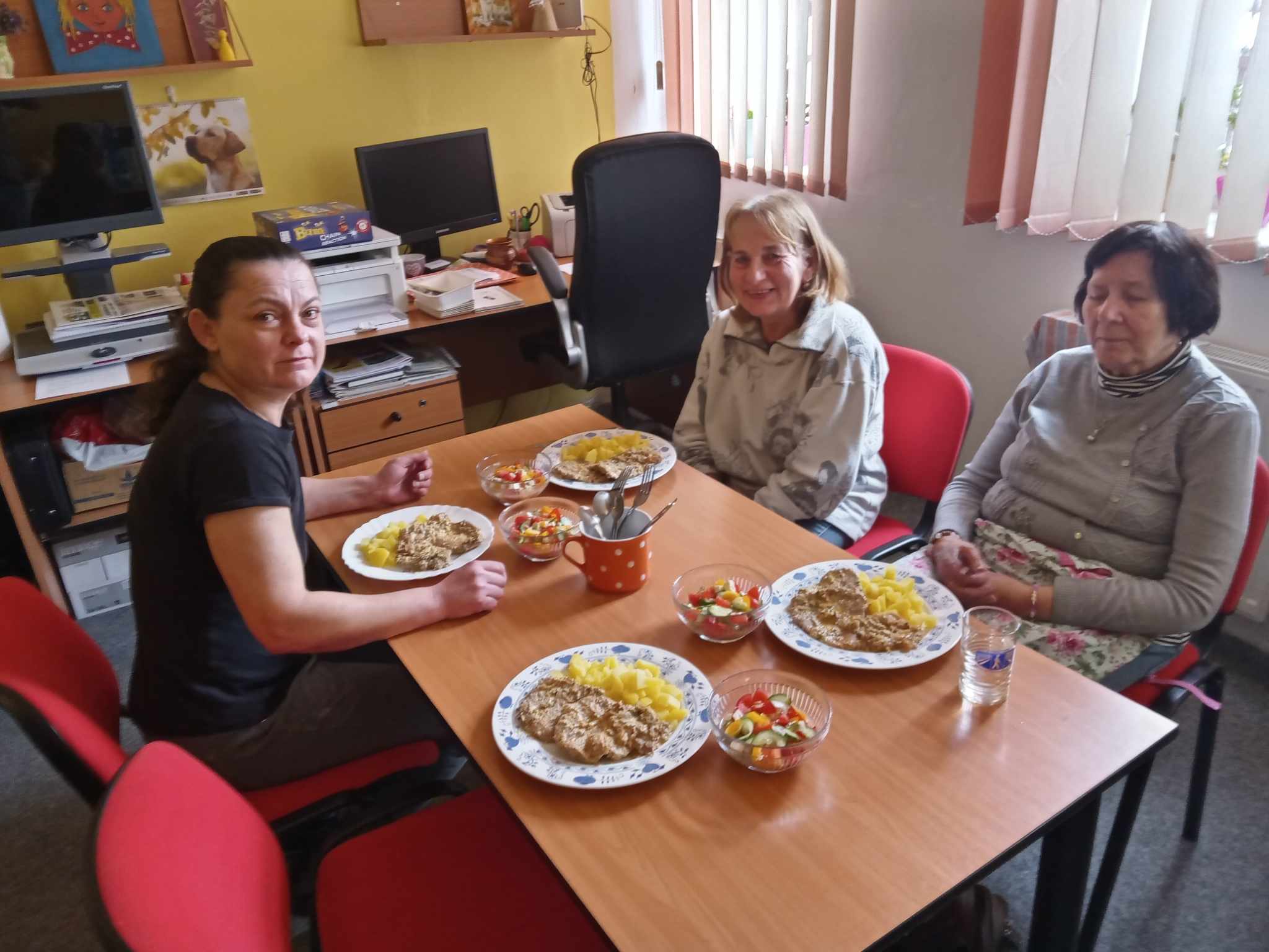 Tentokrát jsme pekli kotlety na smetaně, v rámci tréninku motoriky si dámy oloupaly a pokrájely brambory, cibuli a rajčata. Premiéru měla horkovzdušná trouba, kde jsme kotlety pekli přibližně hodinku a půl, v čase mezi tím jsme si společně zahráli deskovou hru Tik Tak Bum. Oběd byl velmi chutný, všichni si ho pochvalovali a přídavkem jsme si k jídlu připravili i čerstvý zeleninový salát se sýrem. Vůně Vám bohužel přiblížit nemůžeme, ale zbytek můžete posoudit z přiložených fotek. V květnu vaření z časových důvodů vynecháme, ale v červnu se můžete těšit na pokračování, tématem budou ryby.