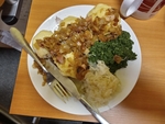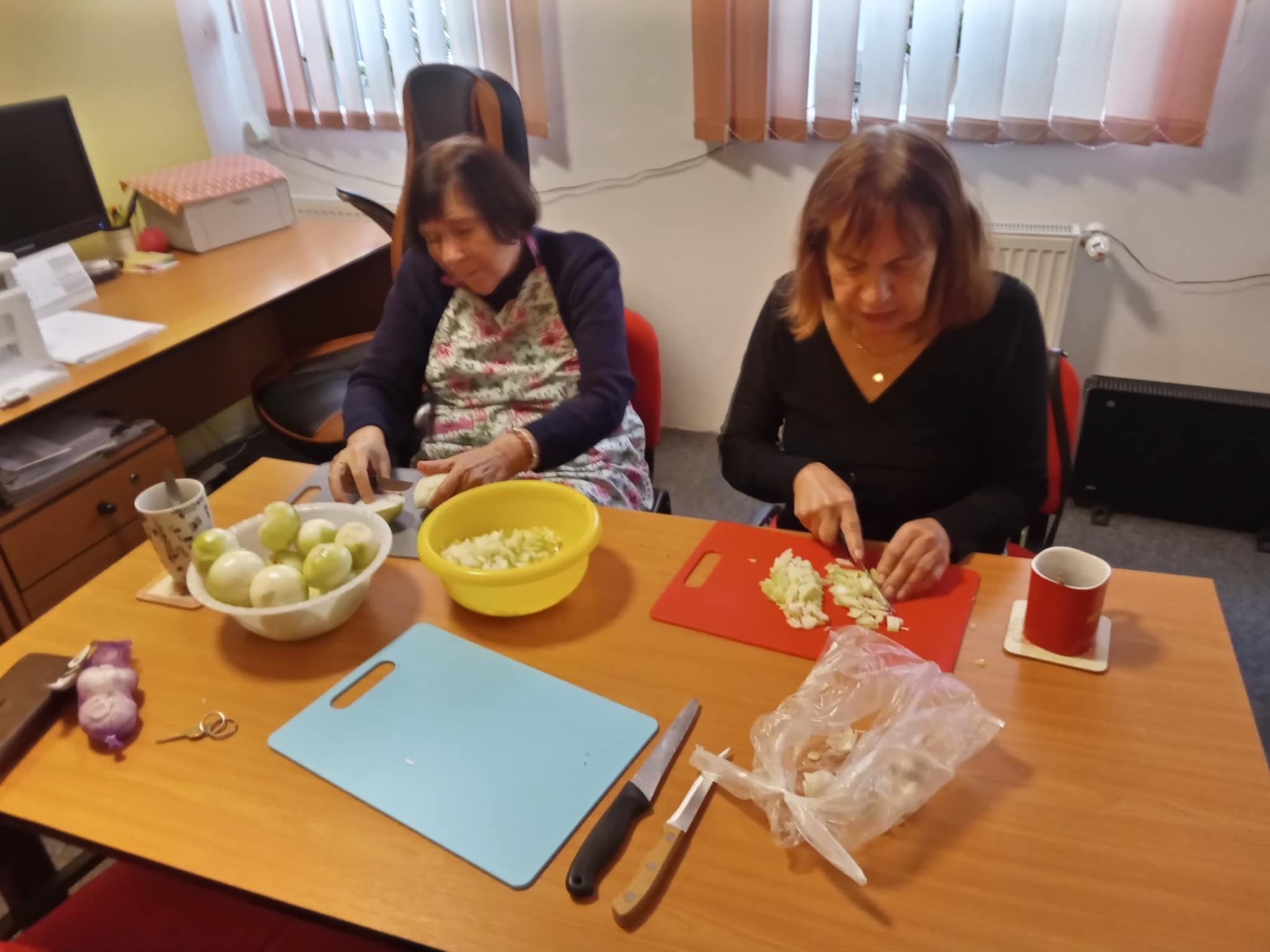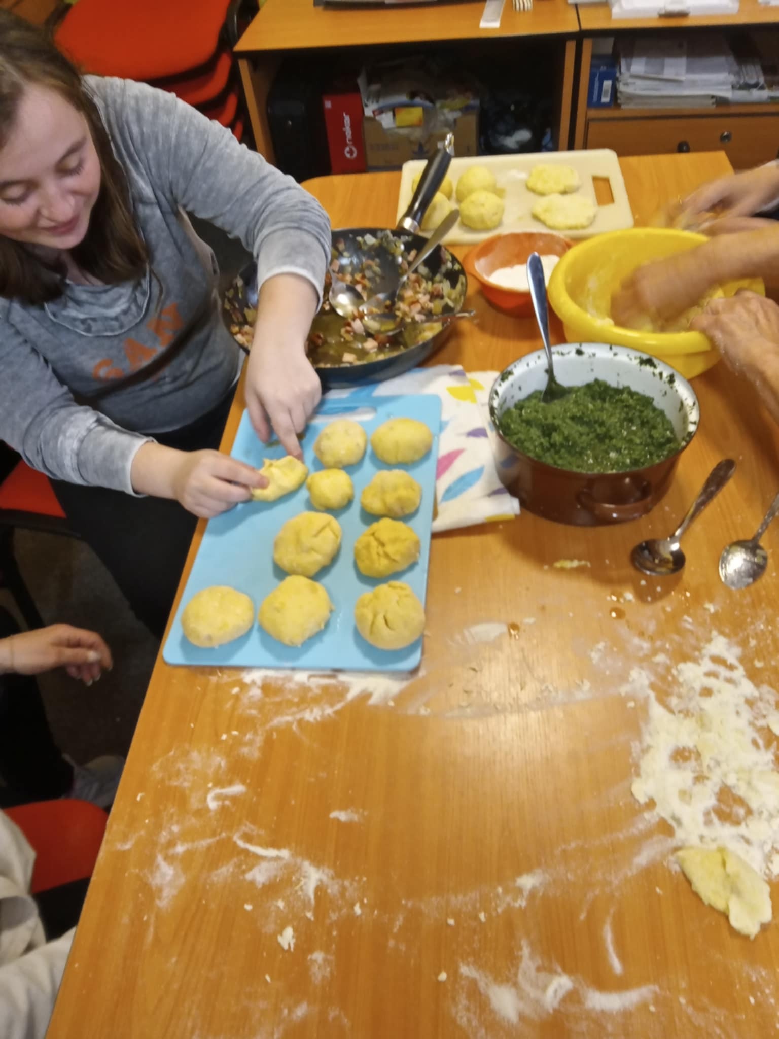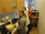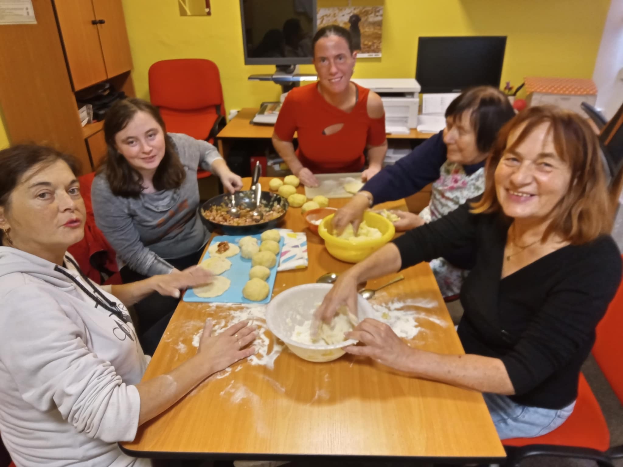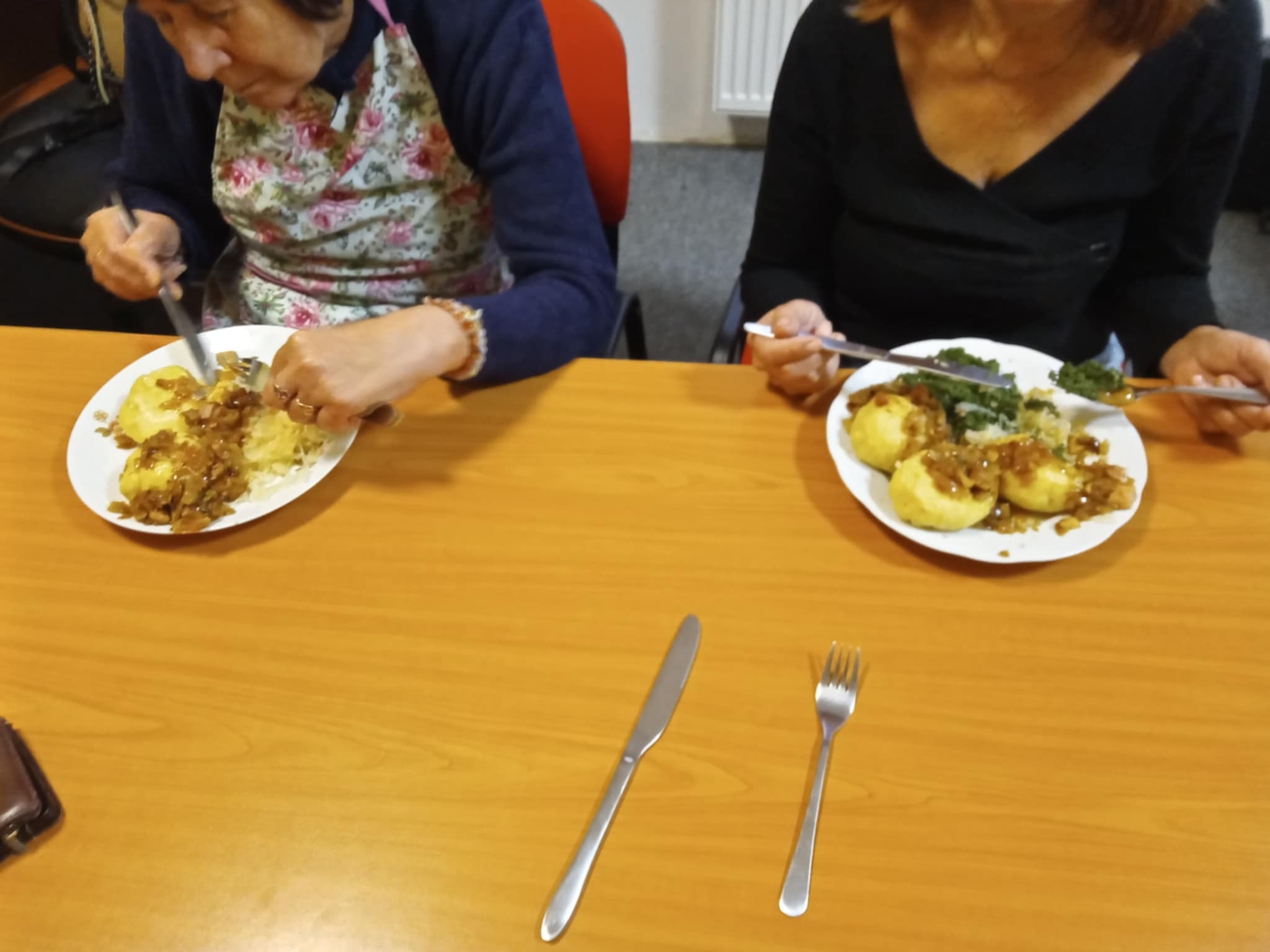 Tentokrát jsme si připravili bramborové knedlíky plněné uzeným masem se zelím a špenátem. Jako slanou tečku na závěr jsme si také udělali šopský salát. Dámy si procvičily motoriku při loupání brambor, cibule, krájení masa a zeleniny. Výsledný pokrm všem chutnal a cena se nakonec vešla do stokoruny.