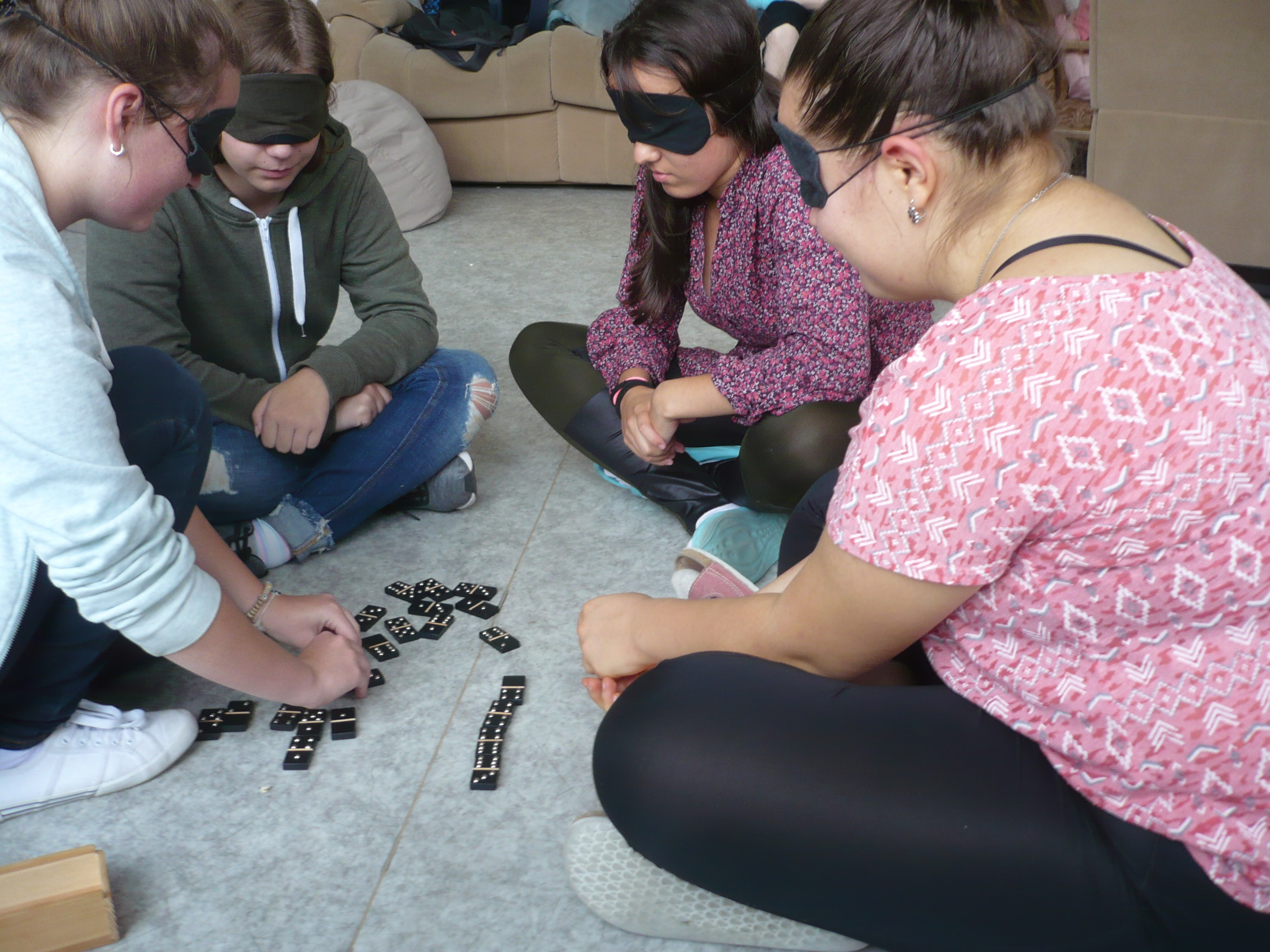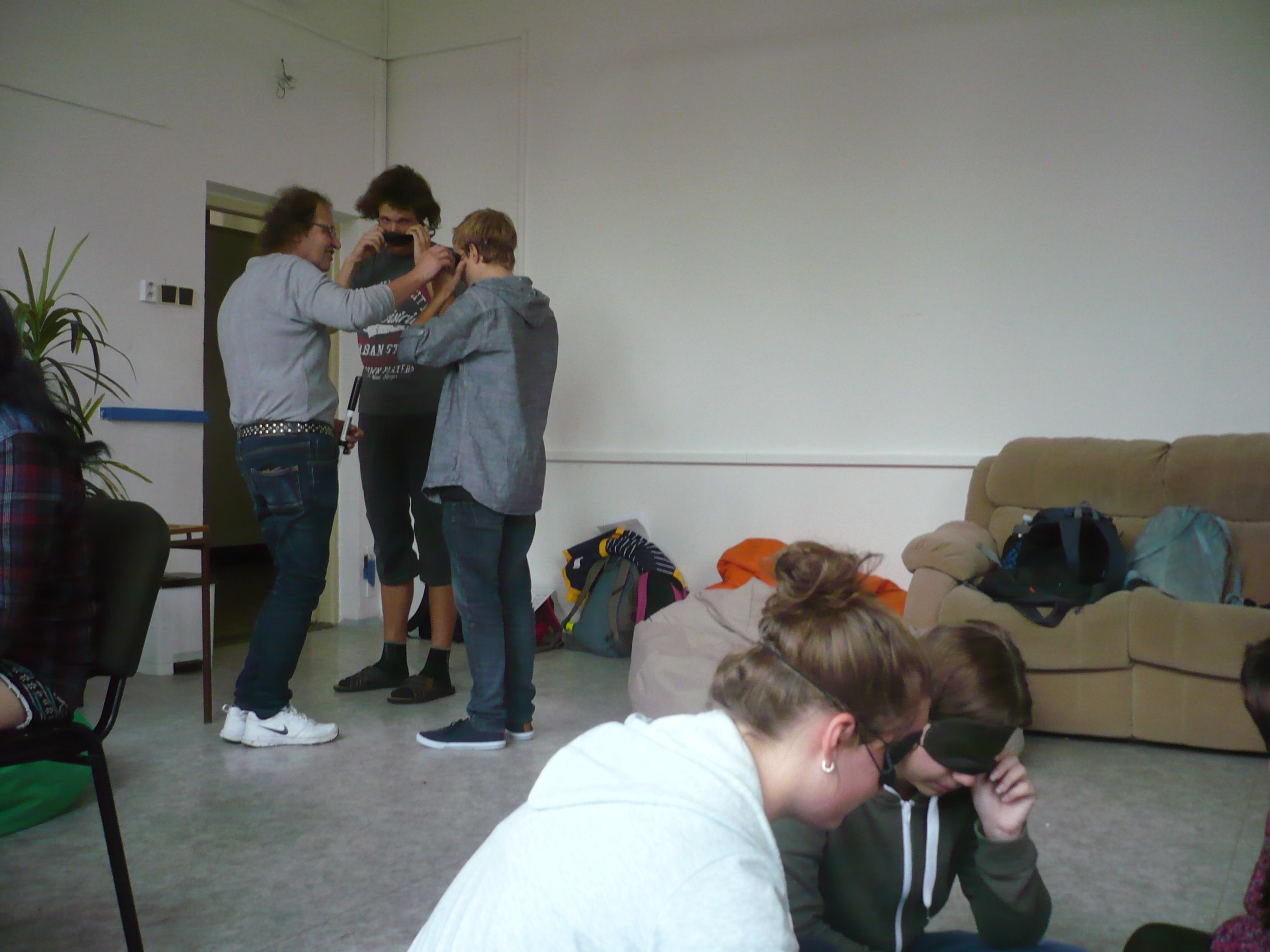 Dne 7. 9. 2018 jsme vyjeli do Turnova na osvětovou akci s názvem Ve škole potmě, která se konala na Střední uměleckoprůmyslové škole. Akce probíhala v rámci harmonizačních dní pro studenty prvních ročníků. Program jsme rozdělili do čtyř a půl stanovišť. První stanoviště bylo zaměřené na Braillovo písmo, k vyzkoušení zde byly Pichtovy psací stroje, tabulky a vše související, výklad a zvídavé otázky zodpovídal pan František Krčma. Druhé stanoviště bylo vedeno magistrou Kamilou Koncovou (za což jí i touto formou velmi děkujeme), kde si se studenty povídala o tom, jak mohou nevidomému člověku pomoci, čeho se úplně vyvarovat a o otázkách, které studenty v průběhu napadaly. Onou výše zmíněnou půlkou byla překážková dráha k projití s bílou holí v ruce a klapkami na očích, na které se postupně studenti střídali, na jejich bezpečnost a výklad dbal pan Ivan Tůma. Třetí stanoviště obnášelo předvedení pomůcek usnadňujících zrakově postiženým lidem život a také praktickou část - simulační brýle, které studenty taktéž velice zaujaly (vnímání prostoru, orientace, vyzkoušení čtení černotisku oproti běžnému tisku apod.). Uprostřed místnosti byl prostor pro vyzkoušení společenských her v úpravě pro zrakově postižené (domino, karty, šachy, "člobrdo" - s klapkami na očích). U tohoto stanoviště byly naše pomocnice - Jana Volfová a Magdalena Zavadilová, kterým taktéž moc děkujeme. Jelikož akce byla úspěšná, rádi bychom ji zopakovali i na dalších školách v okolí.
