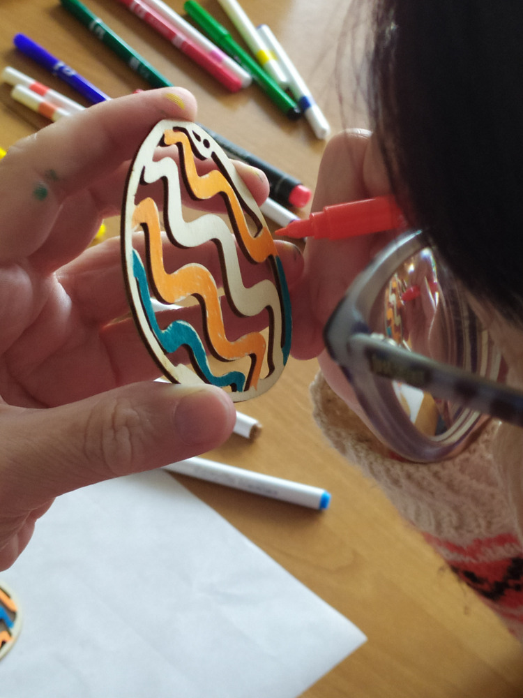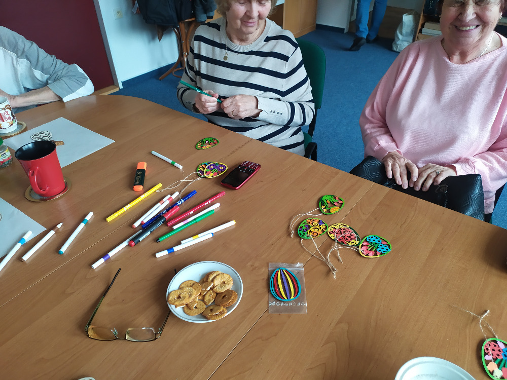 připravili drobné ozdoby na pověšení. Tentokrát jsme vymalovávali vyřezaná vajíčka ze