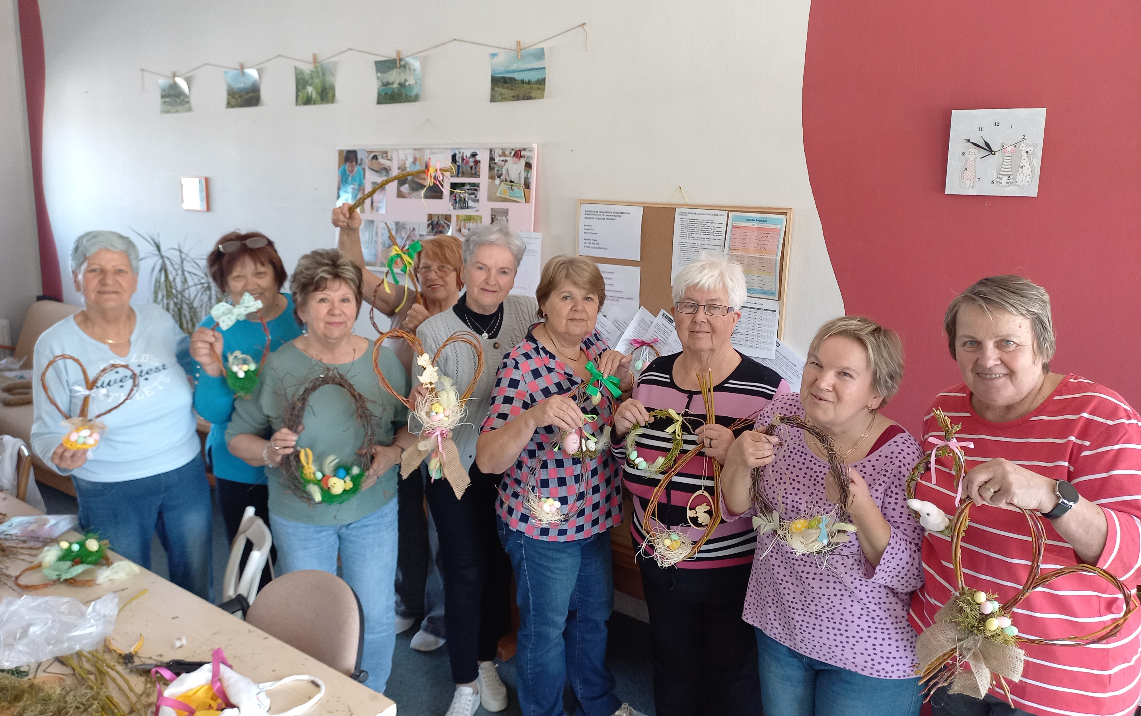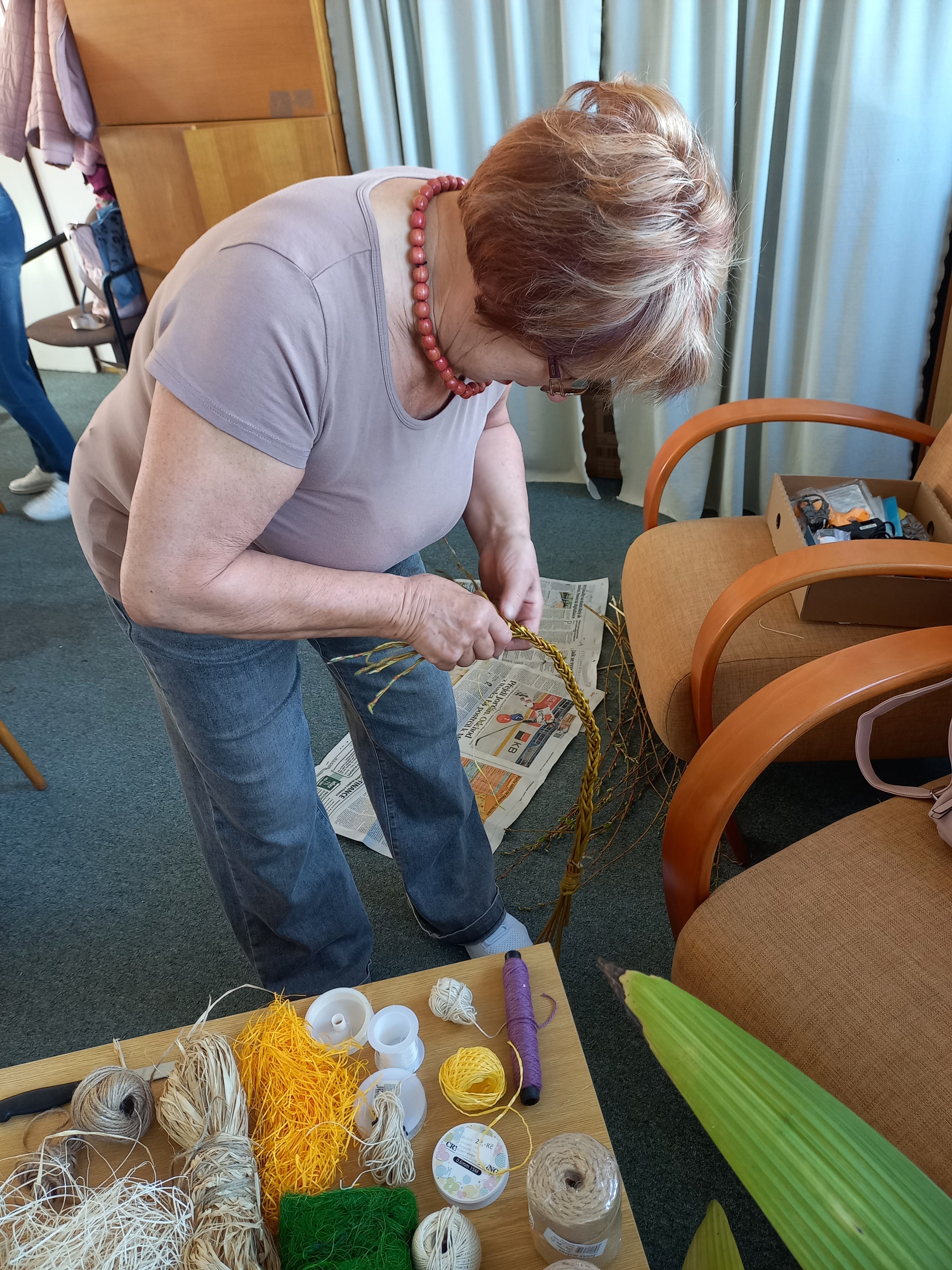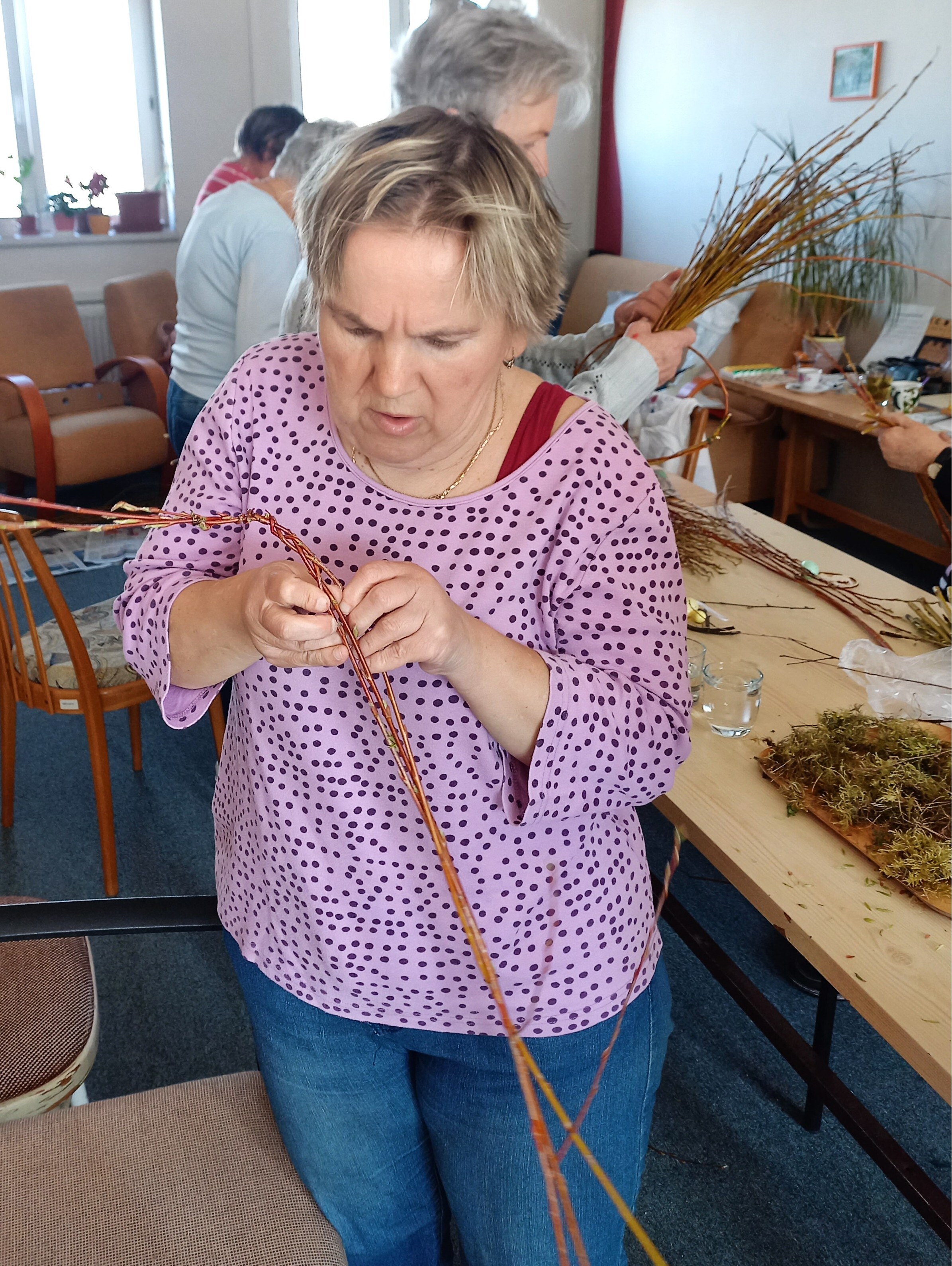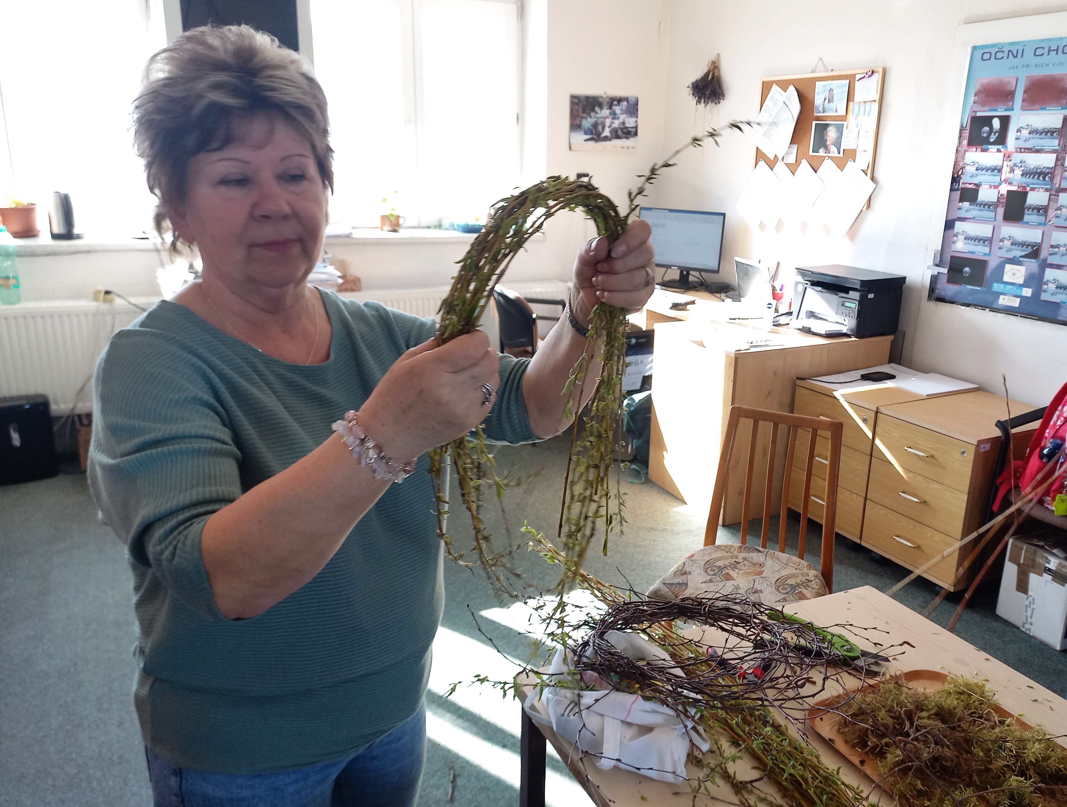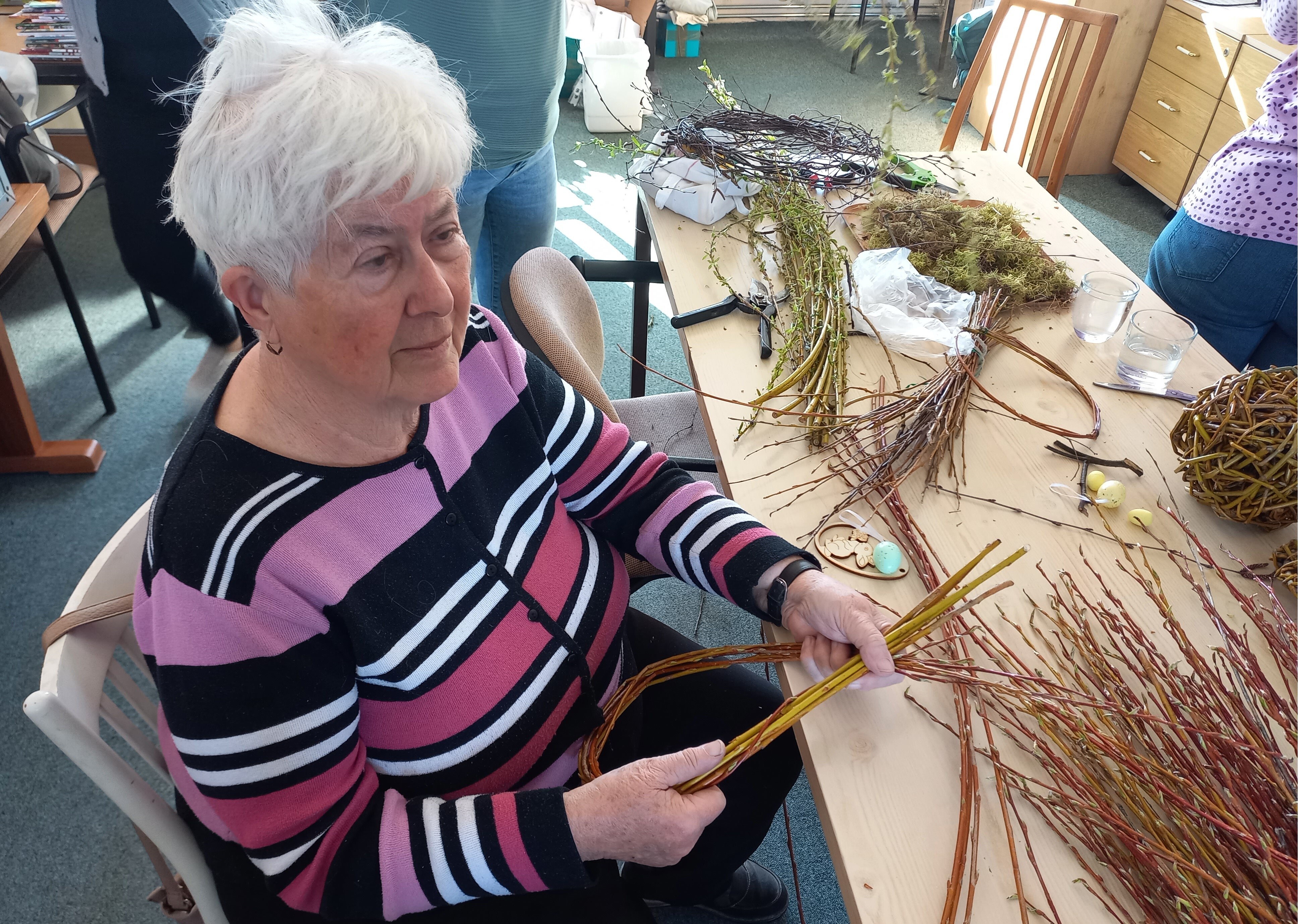 Jaro a Velikonoce jsou tady, tak hurá na výrobu přírodních dekorací do bytu či na zahradu. Proutky a dekorační materiál zde byly k dispozici a už záleželo jen na umu a fantazii zúčastněných. Práce s proutky nebyla až tak jednoduchá, zručnější a zkušenější pomáhali a byli příkladem těm méně zručným. Výsledek byl krásný u všech.