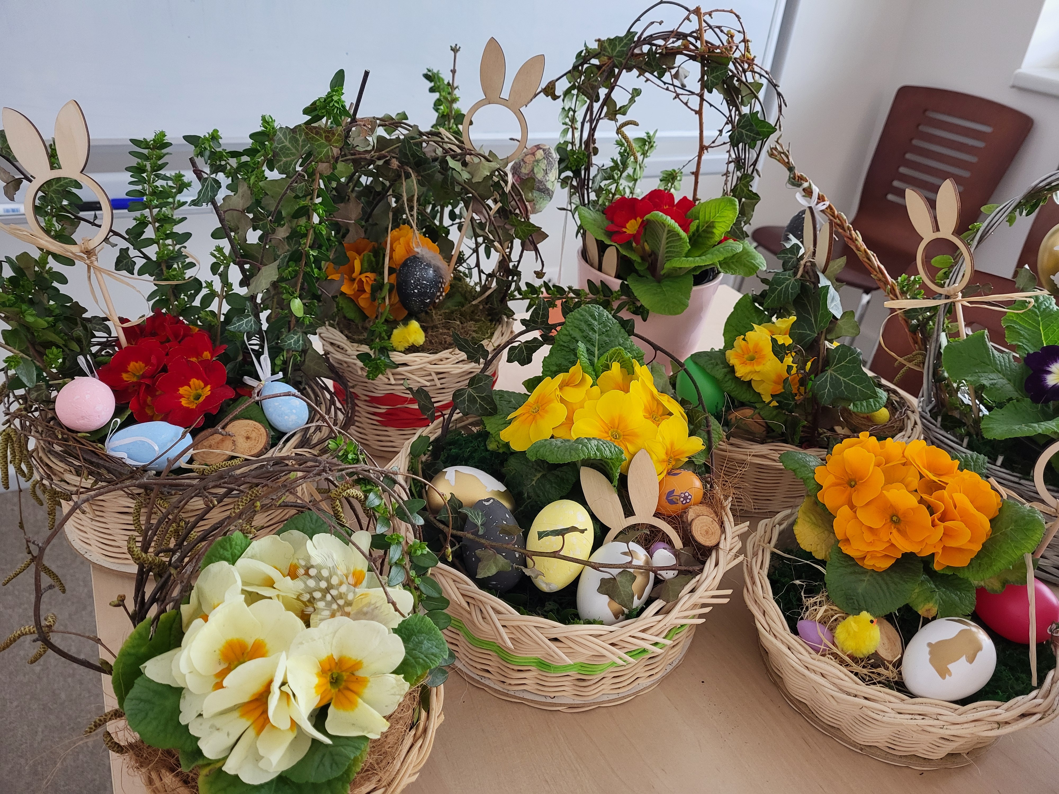 Na velikonoční dopoledne jsme se pustili do tvoření jarní dekorace a oslavili tak příchod jara. Petrklíče jsme aranžovali do proutěných košíků a doplnili je vajíčky, zajíčky a kuřátky – symboly nového života a probouzející se přírody. Větvičky modřínu přinesla Zdena, břízy, břečťan a mech zajistila Pavla a dekorace připravily pracovnice. Košíčky si každý upletl na pedigu s Milanem a obdivovali jsme i malou pomlázku, kterou Milan zakomponoval do aranžmá.